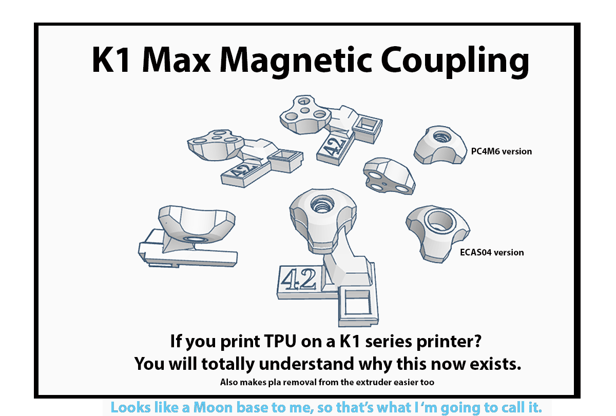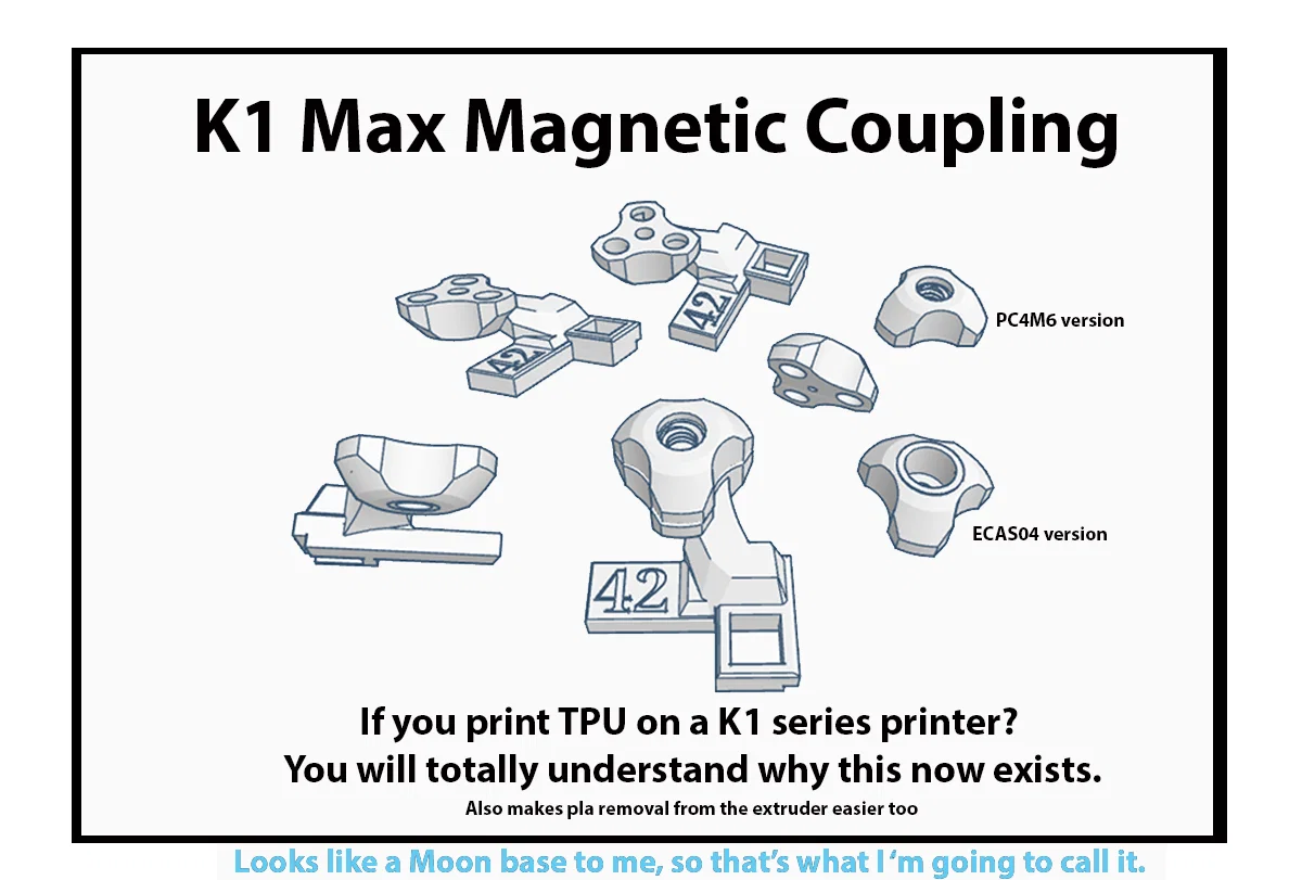 Nếu bạn chỉ in PLA và TPU thì bản in này hoạt động tốt khi in bằng PLA. Phiên bản đầu tiên của tôi được in bằng pla khi tất cả những gì tôi in là pla và tpu và nó cũng tốt như khi tôi thay thế nó bằng ASA và khi nó được lắp đặt lần đầu vài tháng trước. Nếu bạn in ở nhiệt độ cao hơn trong khoang máy thì hãy cân nhắc in bằng PETG hoặc ASA. Bất kể loại filament có nhiệt độ in cao nhất bạn in là gì, khớp nối nam châm nên được làm từ cùng loại (hoặc tốt hơn). Nói một cách đơn giản? Nếu bạn in và sử dụng bản này chỉ với PLA, sau đó quyết định bắt đầu in bằng ABS hoặc ASA, thì tôi thực sự nghi ngờ khớp nối nam châm sẽ tồn tại được lâu vì PLA chắc chắn sẽ mềm ở nhiệt độ cao hơn cần thiết cho các loại filament đó.