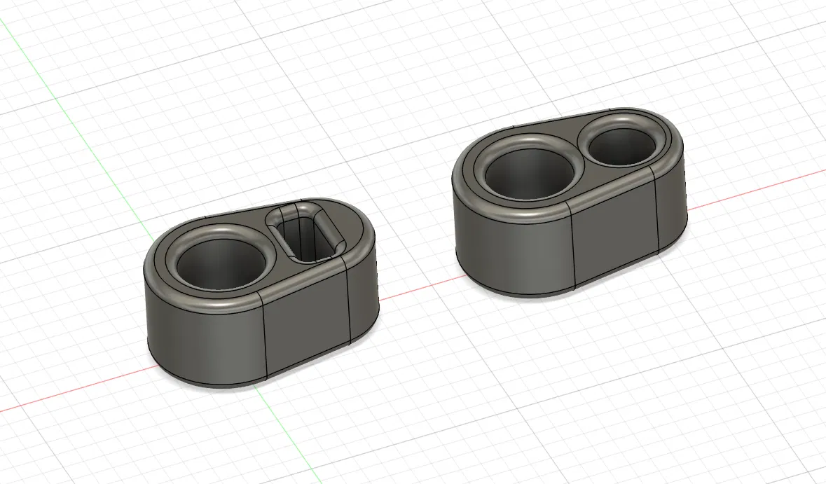Mắt đọc Bowden PTFE dùng để cố định ống filament: một phiên bản được thiết kế để sử dụng với dây rút cáp, phiên bản còn lại có lỗ xuyên để gắn bằng vít.