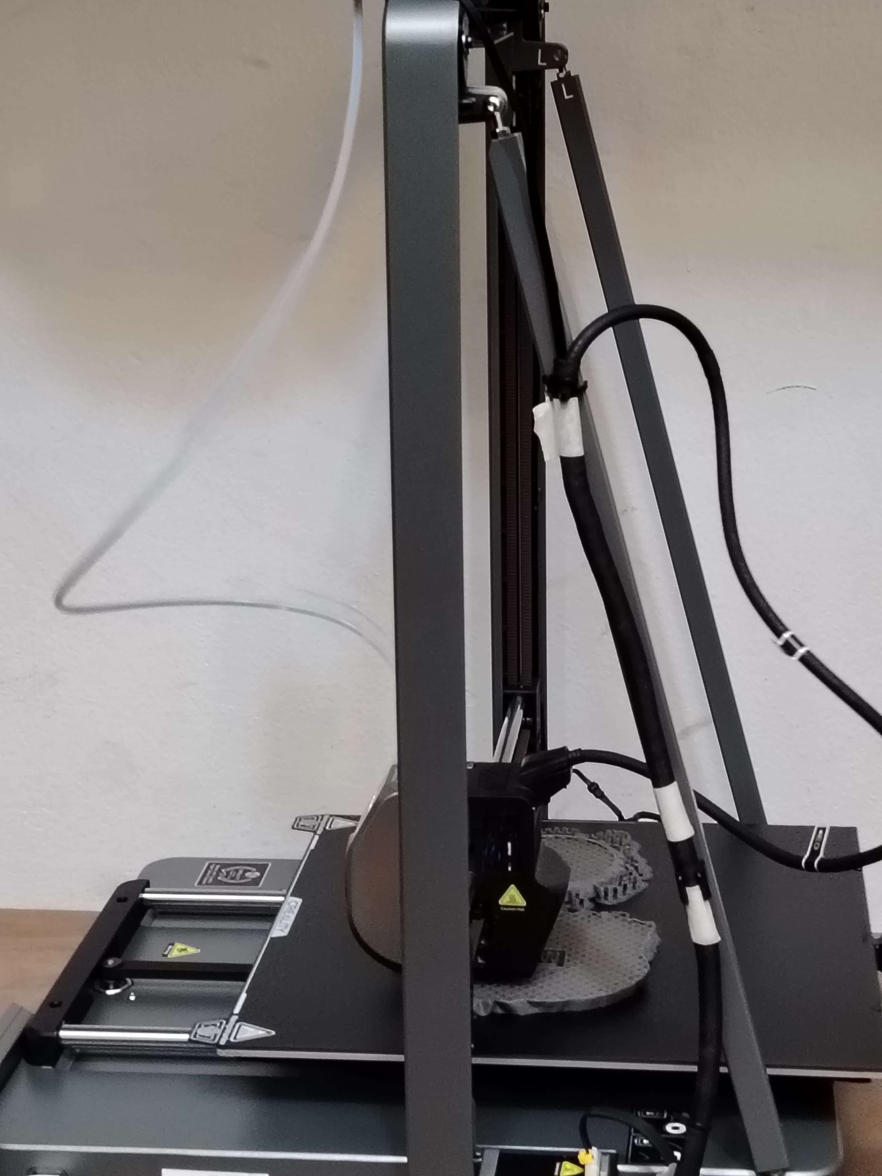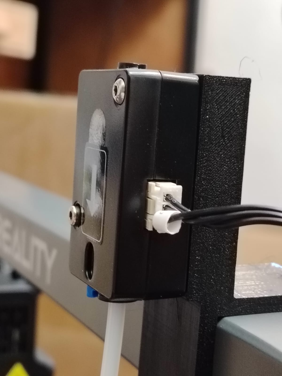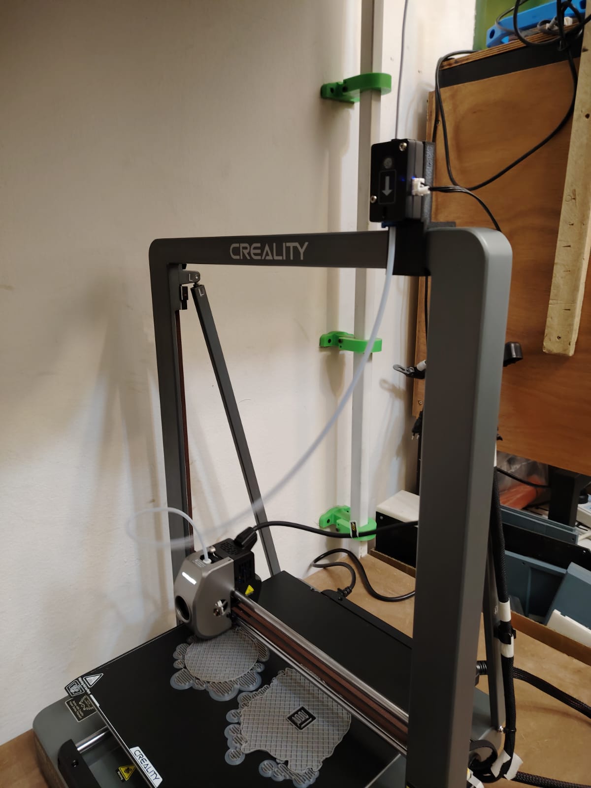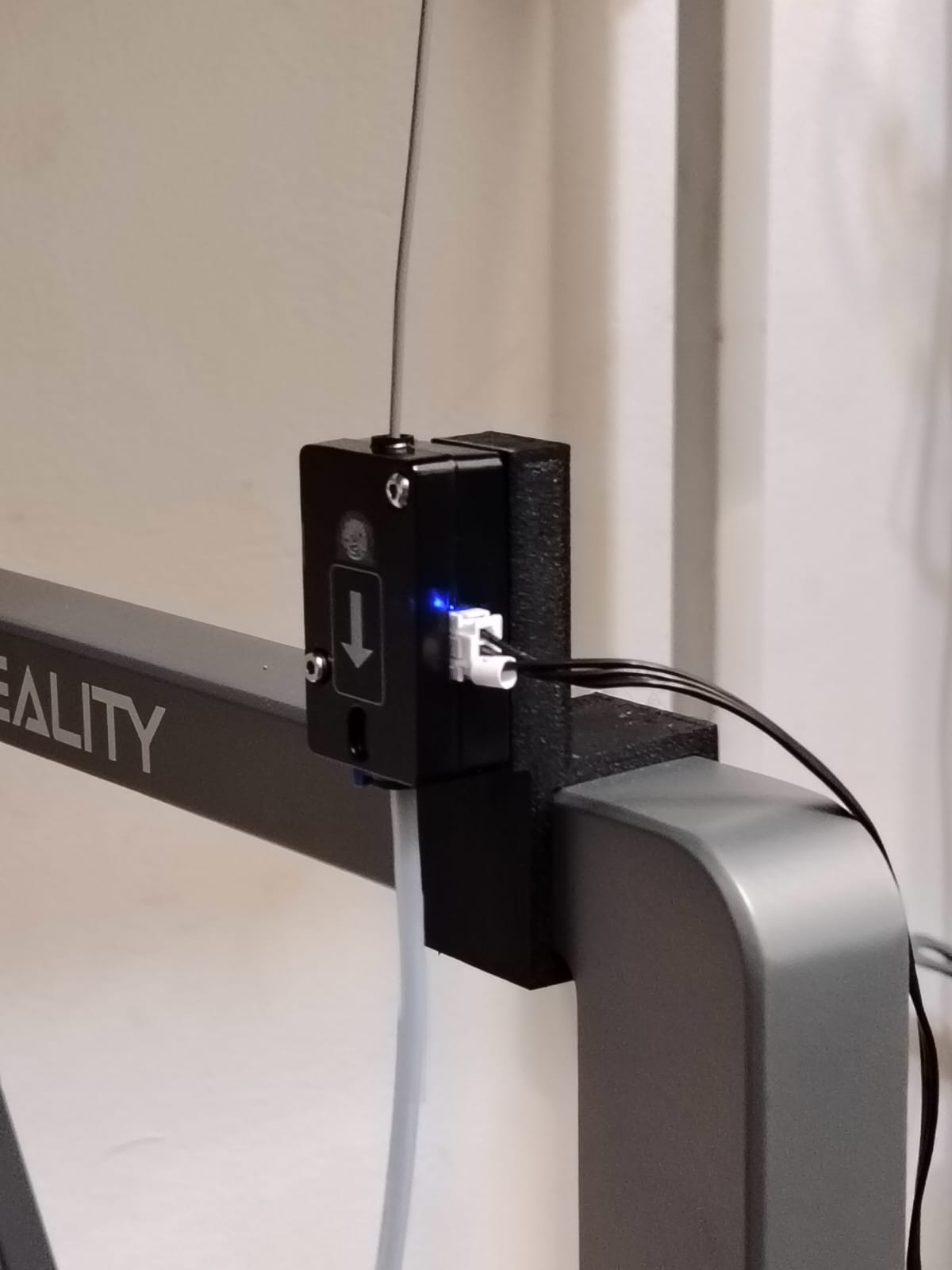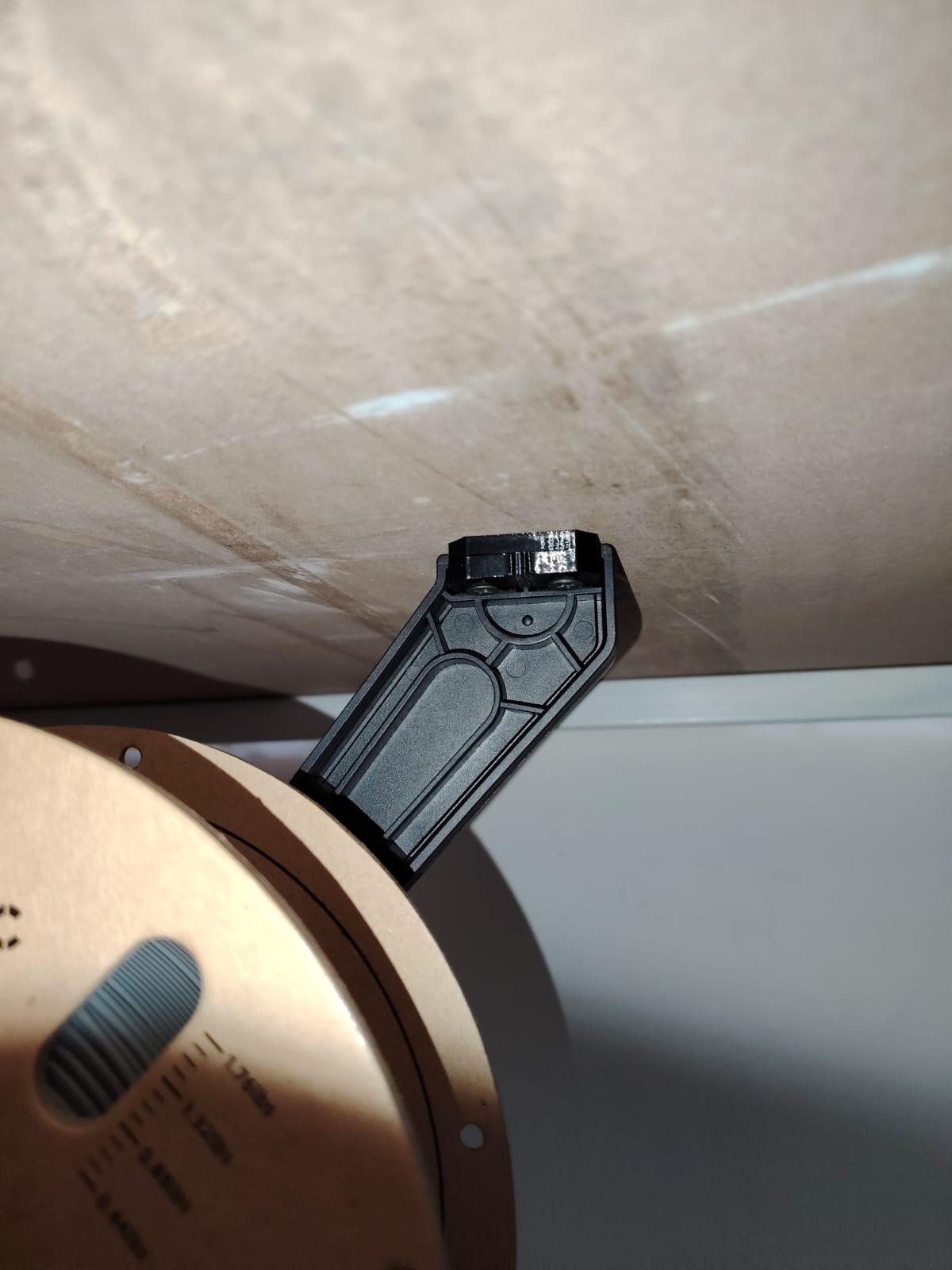 Vì vậy, giải pháp của tôi là tháo cảm biến khỏi Z-gantry, sau đó đặt nó lên trên và phía trước khung máy, nối lại ống PTFE ở phía trước cũng để tránh nó chạm vào khung trên. Thêm vào đó, tôi thiết kế một bộ phận để gắn bộ giữ cuộn dây (spool holder kit) ngược lại trên trần gỗ và cố gắng không thêm trọng lượng lên máy in 3D để tránh rung quá nhiều khi máy đang hoạt động.