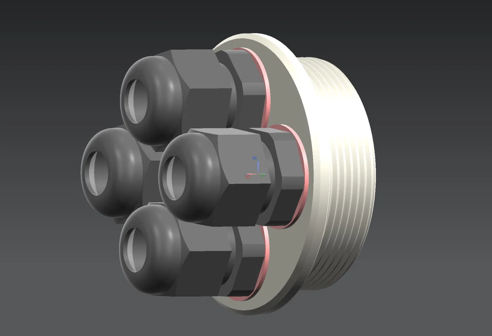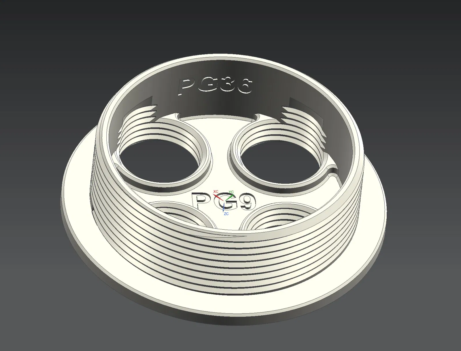 Sản phẩm này là bộ chuyển đổi ren PG36 sang 4 đầu nối cáp PG9, dùng để bịt lỗ PG36 và lắp các đầu nối PG9 nhỏ hơn. Lưu ý cần dùng tấm đệm kín PG9 loại mỏng do không gian hẹp. Hỗ trợ in bằng PETG và vòng đệm bằng TPU.