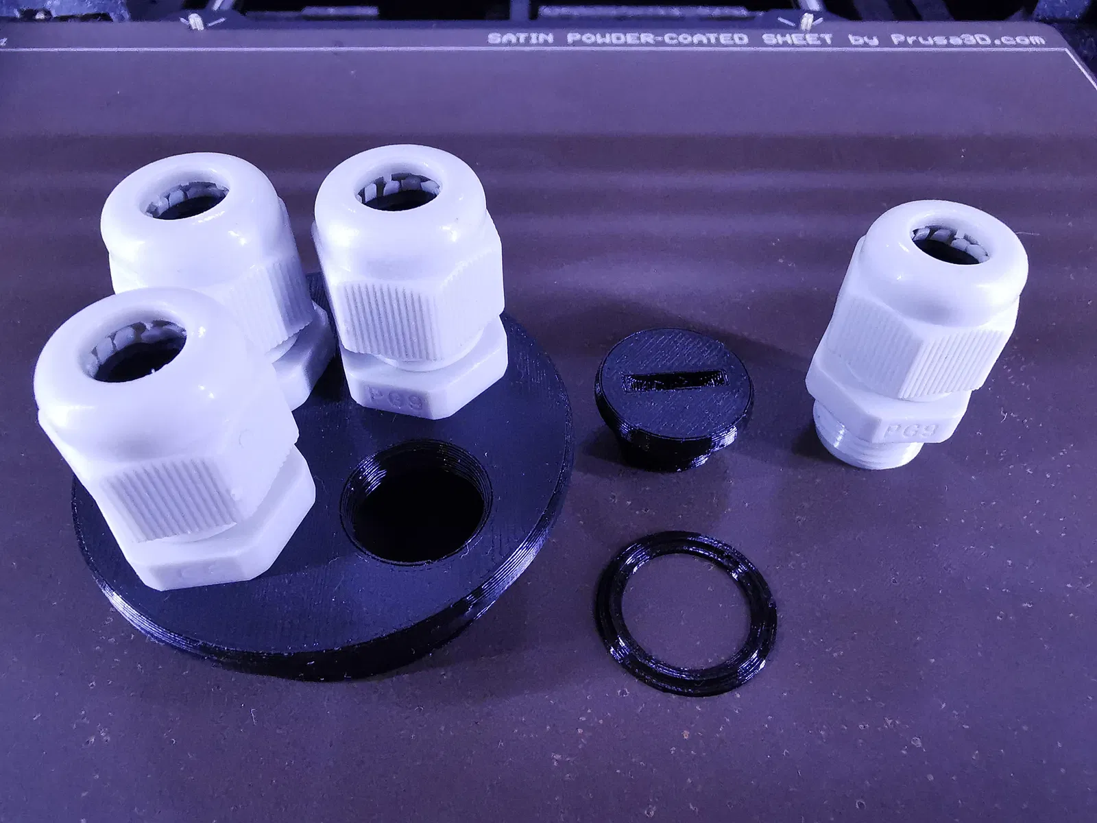 Vật liệu 1x bộ chuyển đổi PG36 (ren PG36) [PG36_BlindStuffing_PGthread_to_4xPG9_PGthread_v00.stl] 1x đai ốc bịt PG36 (ren PG36) [PG36_Nut_PGthread_v01.stl hoặc [PG36_Nut_PGthread_v11.stl] (1-4)x đầu nối cáp PG9 (ren PG9) [xem liên kết] (3-0)x tấm đệm kín PG9 [PG9_BlindStuffing_PGthread_v01_slim.stl] (3-0)x vòng đệm TPU PG9 (tùy chọn) [PG9_TPU-Sealing_v00_slim.stl]