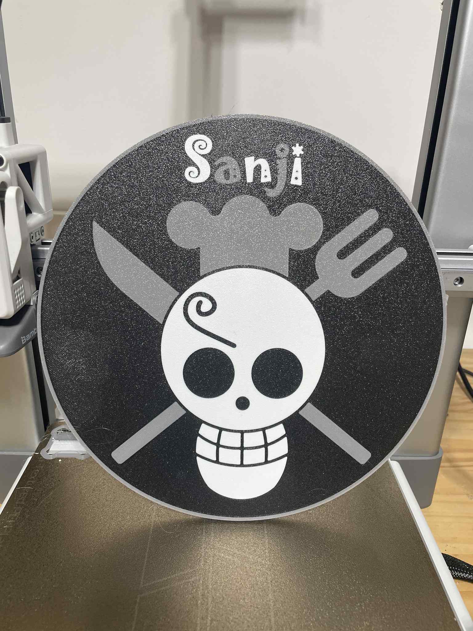 Đĩa Sanji One Piece 3 màu. Cần MMU hoặc AMS để in. Mình đã in bằng máy BambuLab A1, in úp mặt xuống với layer 0.16mm và có kèm sẵn file gcode cho máy A1. Chúc mọi người in ấn vui vẻ!