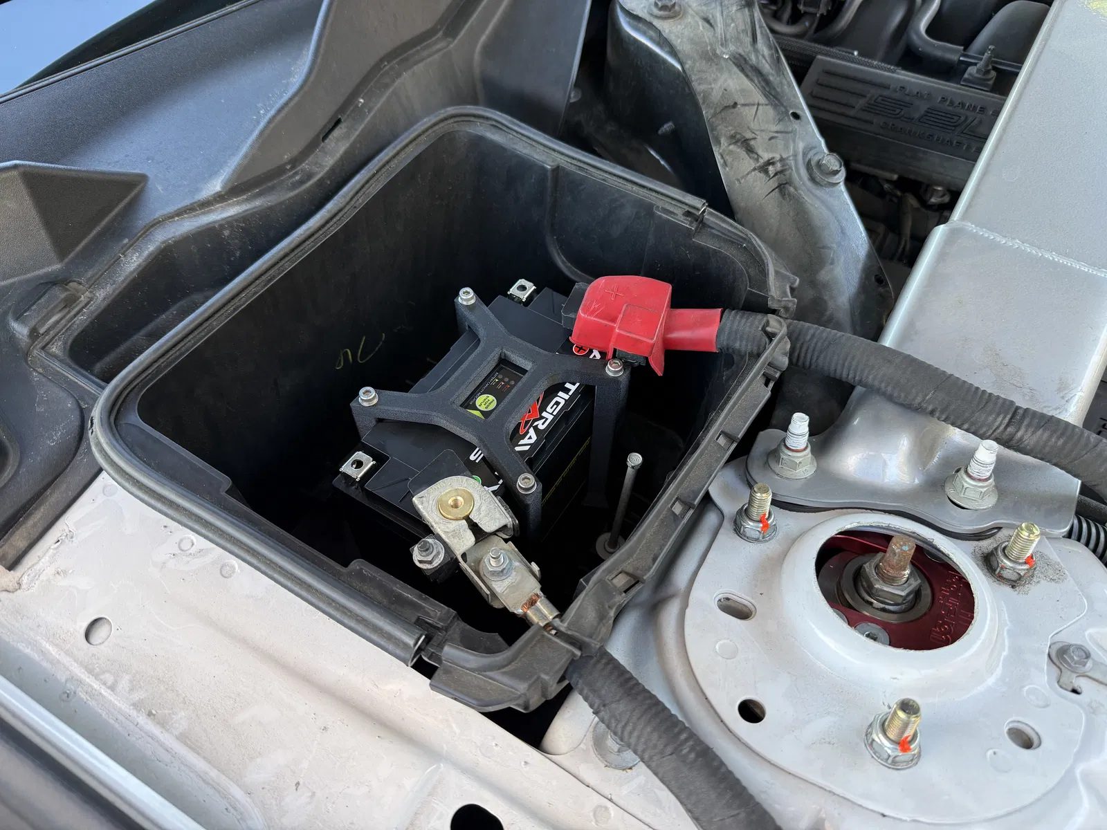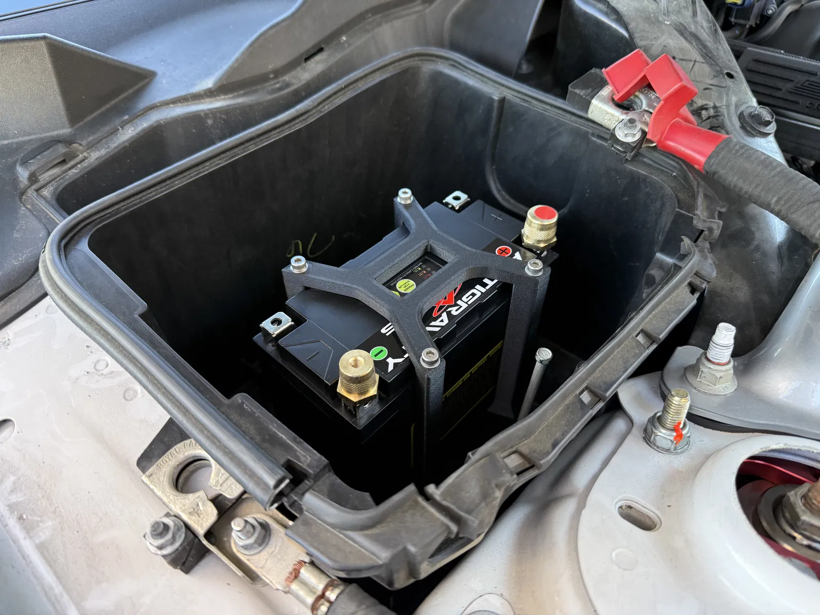 Tui bực mình vì cái bình ắc quy zin trên chiếc Mustang GT350R 2018 của tui có cường độ dòng khởi động thấp quá nên tui đã đặt mua bình ắc quy lithium phosphate Antigravity ATX20-HD có chỉ số CCA cao hơn nhiều và khối lượng nhẹ hơn đáng kể. Vì ATX20-HD có kích thước nhỏ hơn nhiều so với bình 96R hoặc 99R zin, nên cần có bộ adapter chuyển đổi.