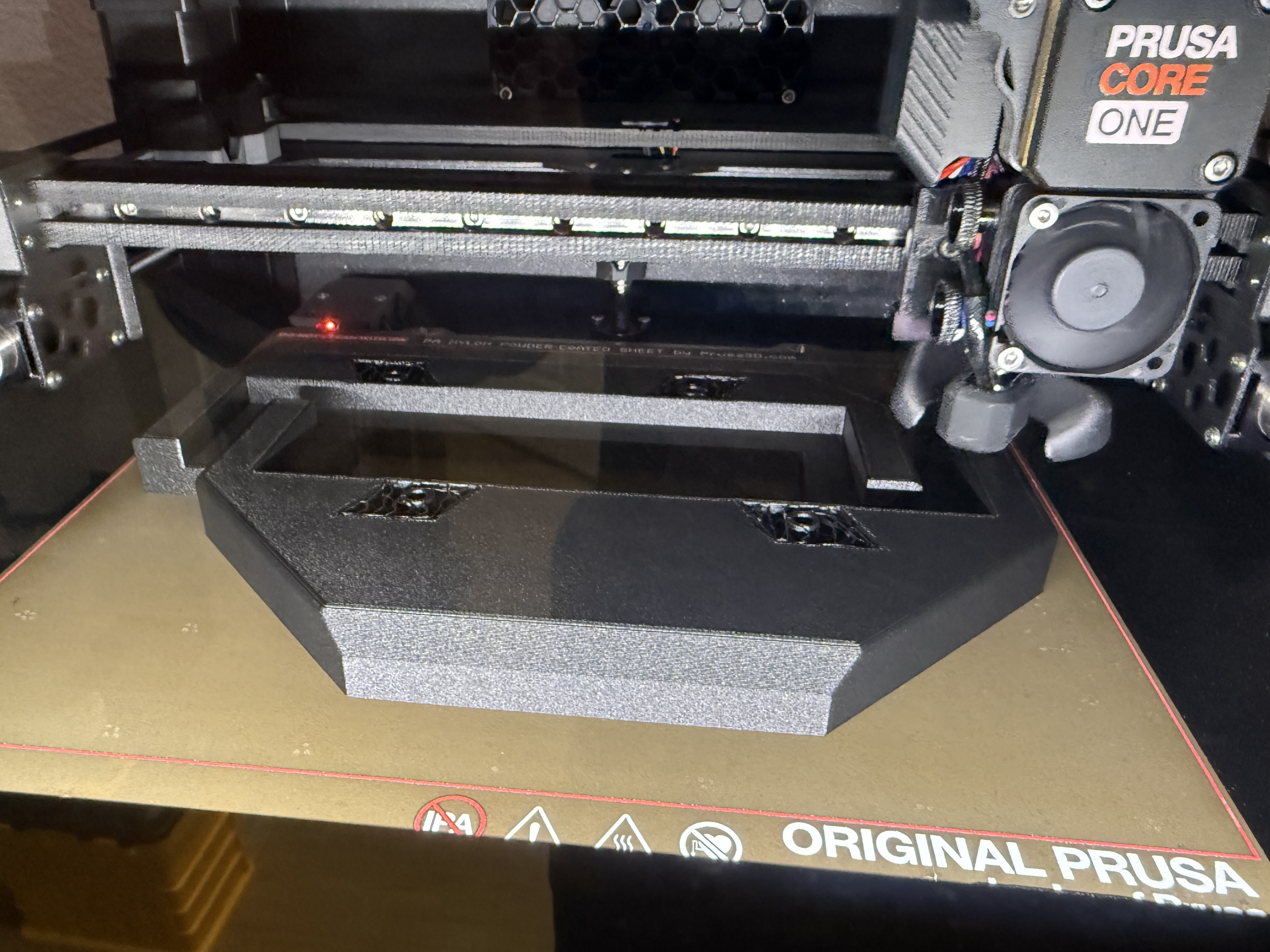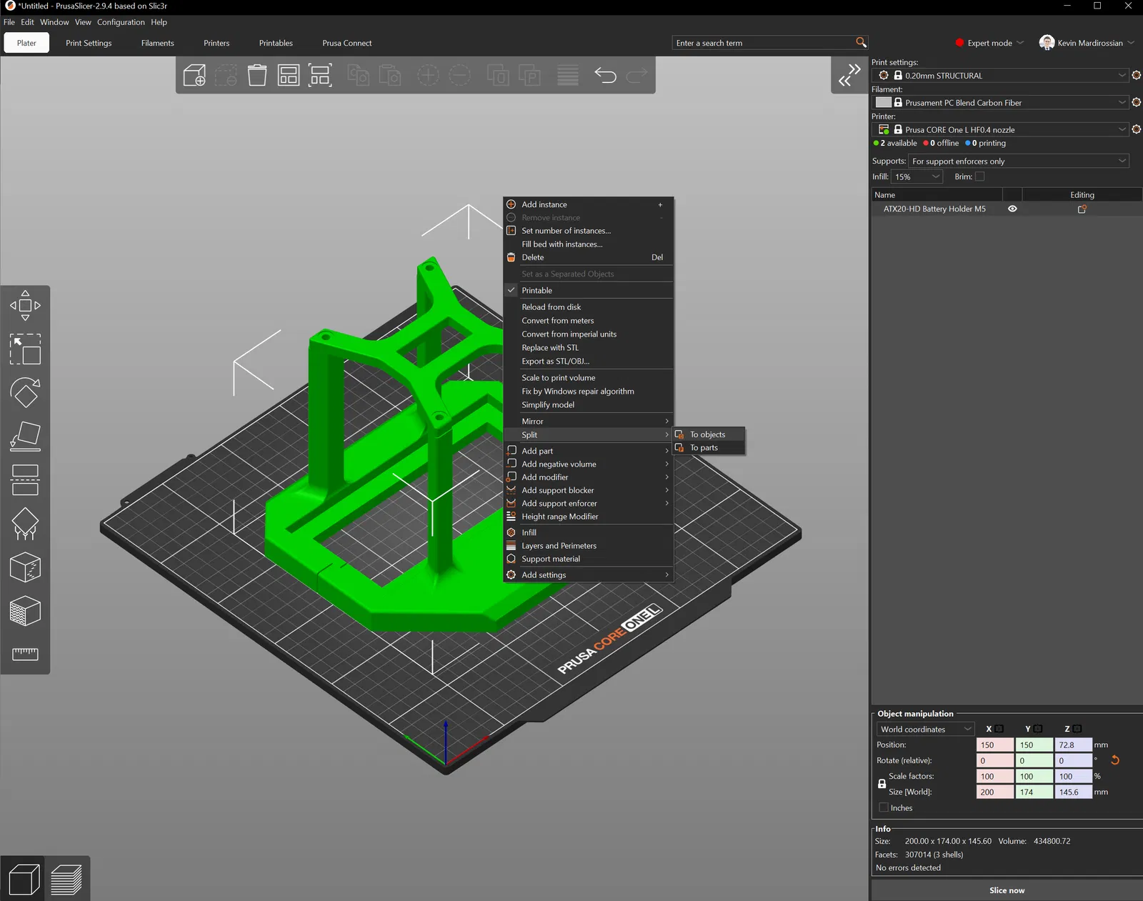 Như với bình zin, bình ắc quy được cố định dọc theo chiều dài bằng một con vít và một tấm góc. Tính năng này được tui tái hiện trong mẫu thiết kế với các mặt vát ở trục dài. Để tăng cường độ bảo mật và độ cứng vững cấu trúc, một tấm phía trên được thêm vào để nối các cấu trúc chính lại với nhau và ngăn chặn sự di chuyển theo chiều dọc của bình ắc quy. Tui đã dùng vít M5 để cố định tấm phía trên này, tuy nhiên tui cũng cung cấp các file để có thể dùng vít cỡ #8 và #10. Nên dùng vít có chiều dài tối thiểu 20mm hoặc 3/4 inch. Tui đã in mẫu thử bằng PETG để kiểm tra kích thước và vị trí, sau đó là các bản hoàn thiện bằng PC-CF và PA-CF. Bạn sẽ cần "tách các đối tượng" để chia các file STEP duy nhất thành 3 bộ phận in riêng biệt. Tui có kèm theo ảnh chụp màn hình quá trình này trong Prusaslicer.