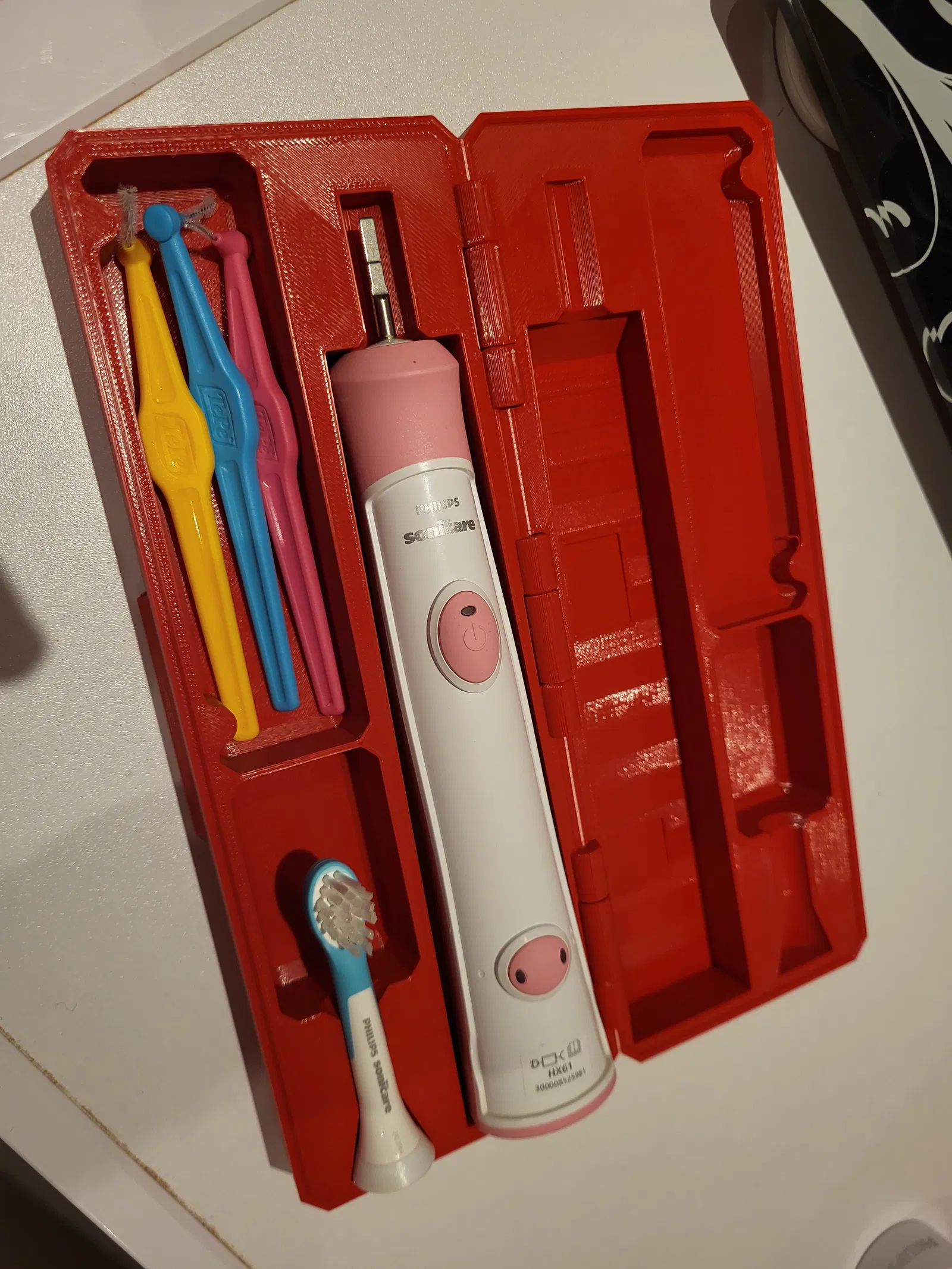 Hộp đựng bàn chải đánh răng điện Philips Sonicare cho bé, có chỗ cho 1 đầu bàn chải và bàn chải kẽ răng. Hộp này in không cần support, dùng 6 nam châm 5x3mm để đóng lại. Thiết kế cho mẫu HX6352.
