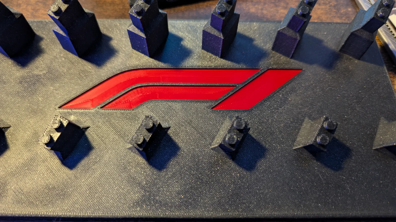 Khay chèn F1 logo, gắn khít không cần keo cho đế trưng bày xe LEGO F1 mini. Remix từ mẫu của Noodles, in bằng PLA, độ hở 0.1mm. Làm bằng Autodesk Fusion.