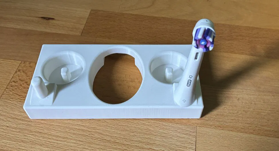 Tìm kiếm một đế cắm tiện lợi cho bàn chải đánh răng Braun Oral B IO series 6, với 2 chỗ để bàn chải, 2 chỗ cắm không sạc và 1 chỗ sạc. Sản phẩm in bằng nhựa ASA màu trắng, cạnh được bo tròn hoặc vát, có hỗ trợ cho phần đế sạc.
