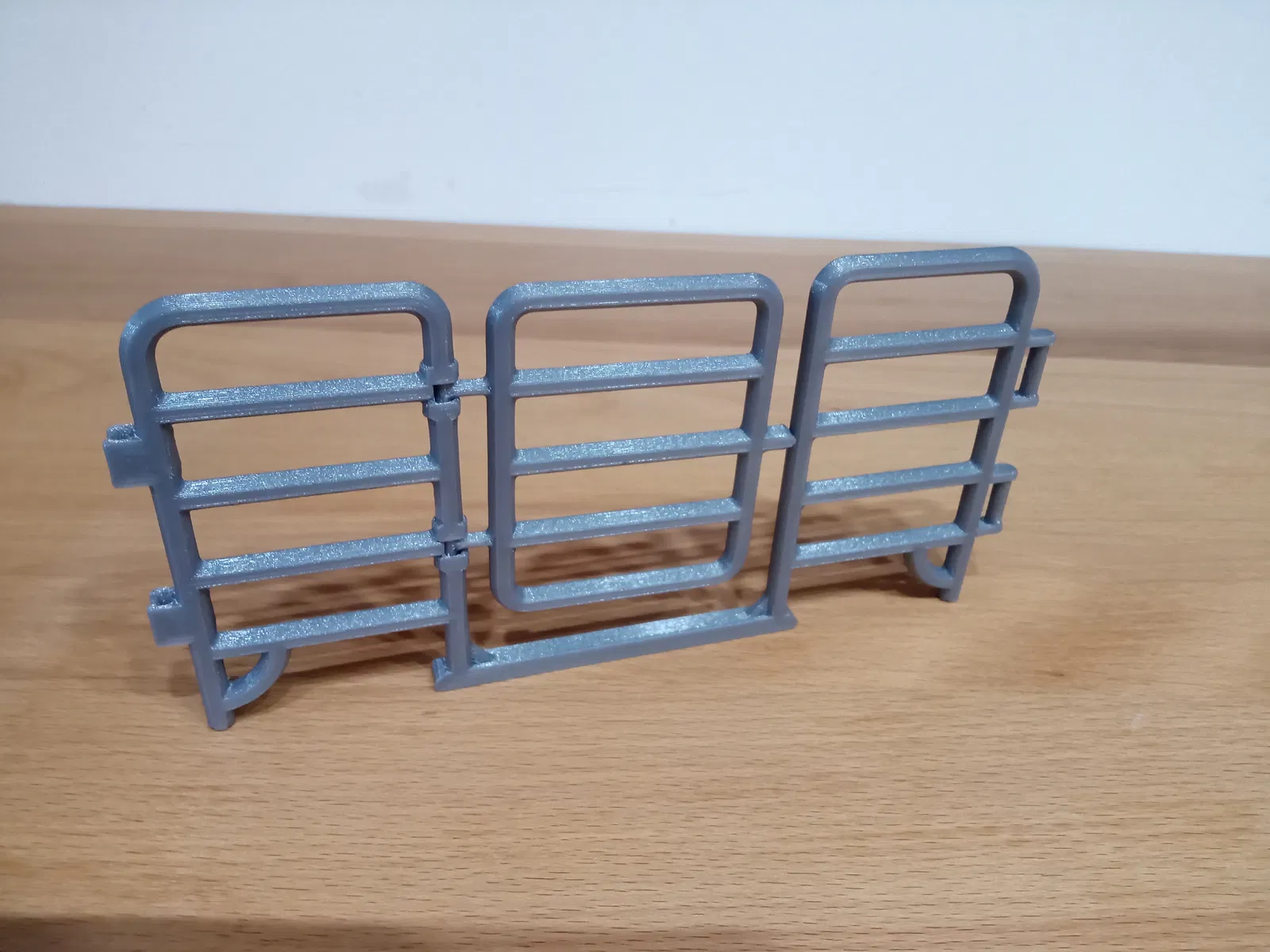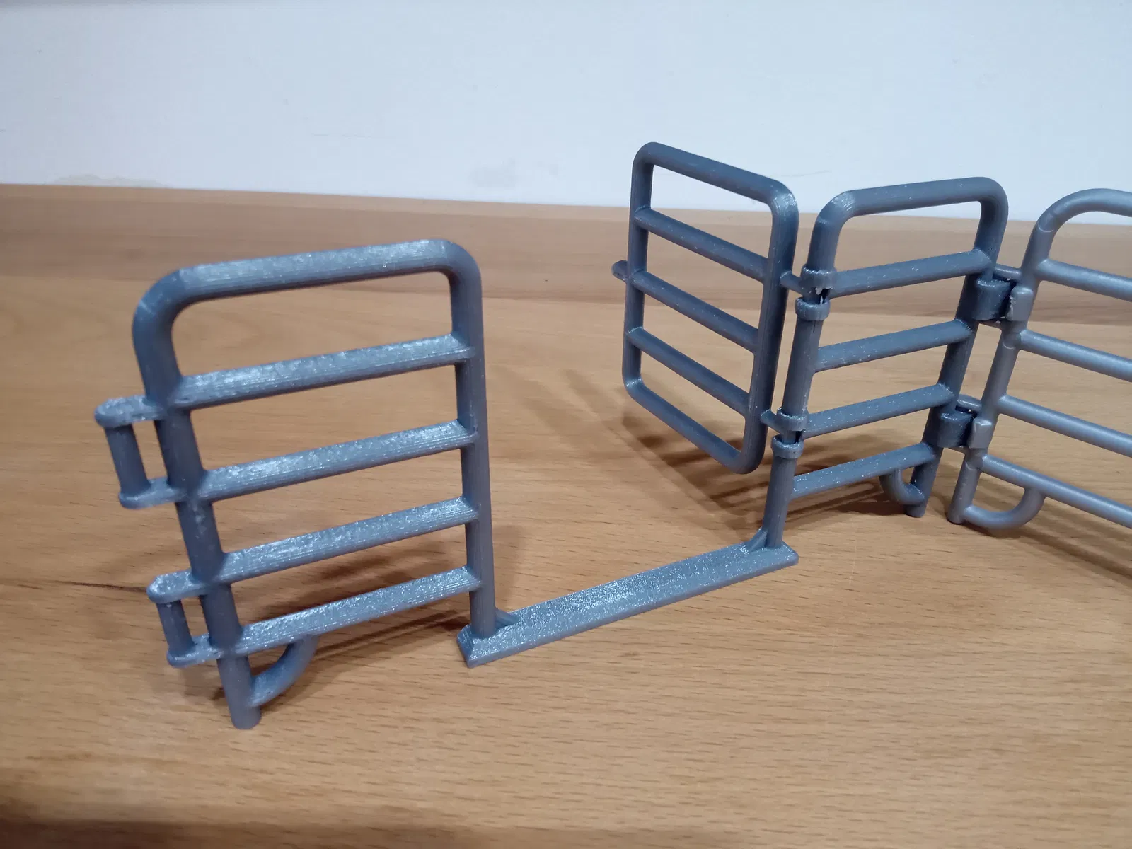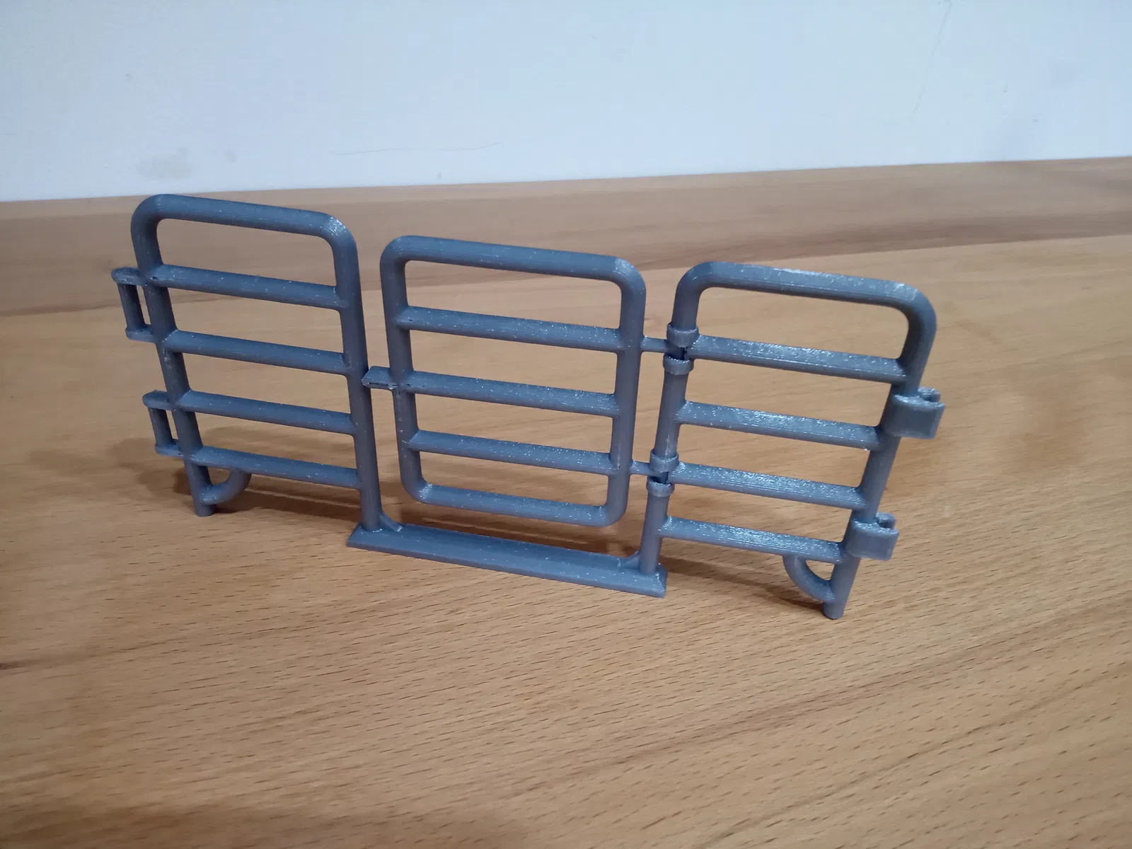 Bảng hàng rào có cổng ở giữa, thích hợp cho đồ chơi ngựa Schleich. Kinh nghiệm in cho thấy nên dùng vật liệu hỗ trợ, độ dày lớp 0.2 và đầu phun 0.6. Có thể ấn mẫu xuống mặt bàn in để tăng độ bám và giảm hỗ trợ, tuy nhiên sẽ làm mẫu bị dẹt hơn ở một mặt.
