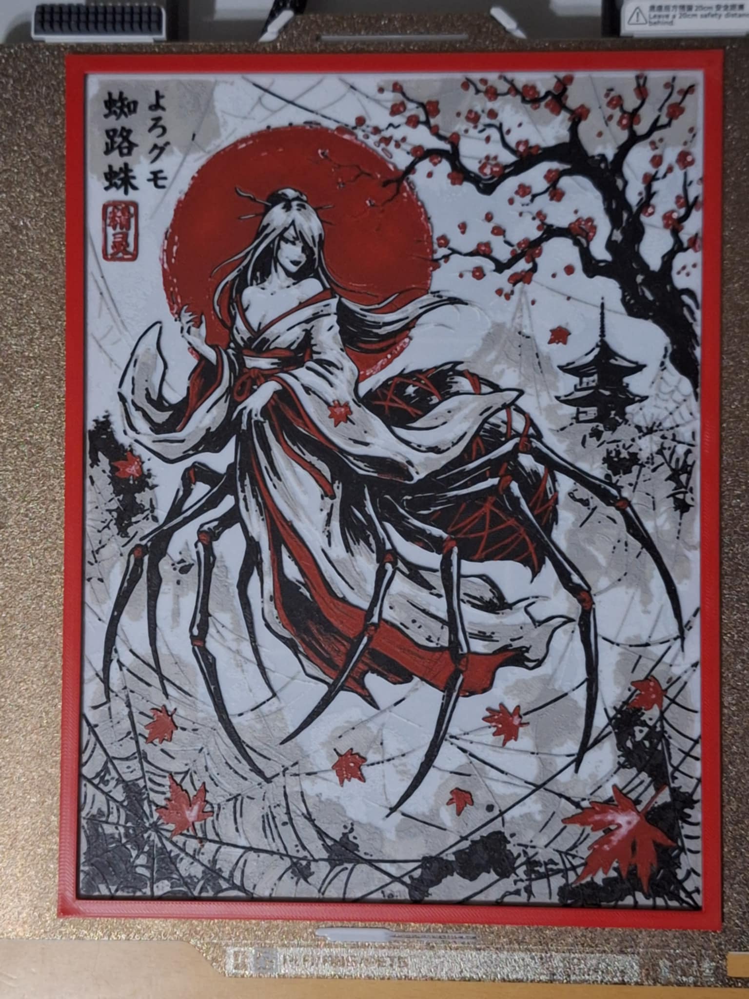 Mẫu in 3D "Spiderwoman / Yorogumo Hueforge" này có kích thước 186.67x250mm và sử dụng 4 loại filament. Hướng dẫn chi tiết về thông số in và cách đổi màu filament để tạo ra tác phẩm nghệ thuật 2D độc đáo.