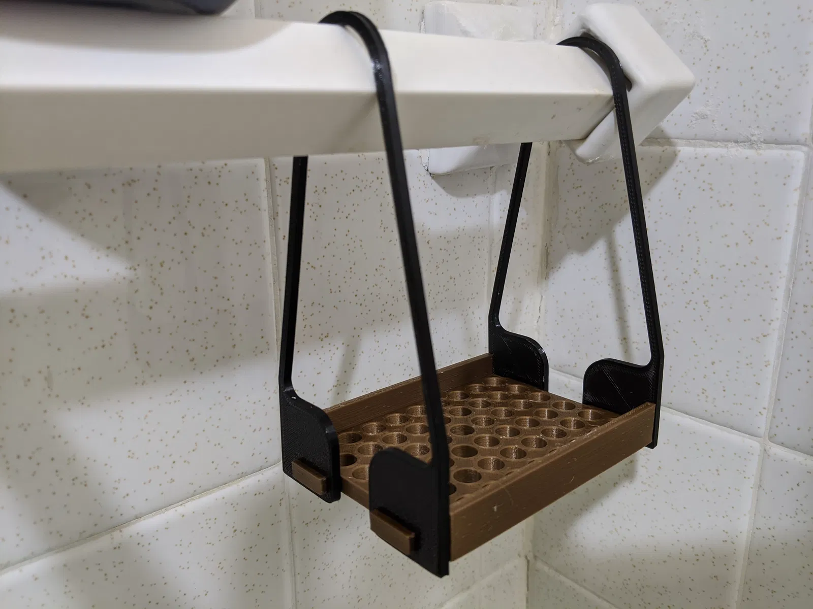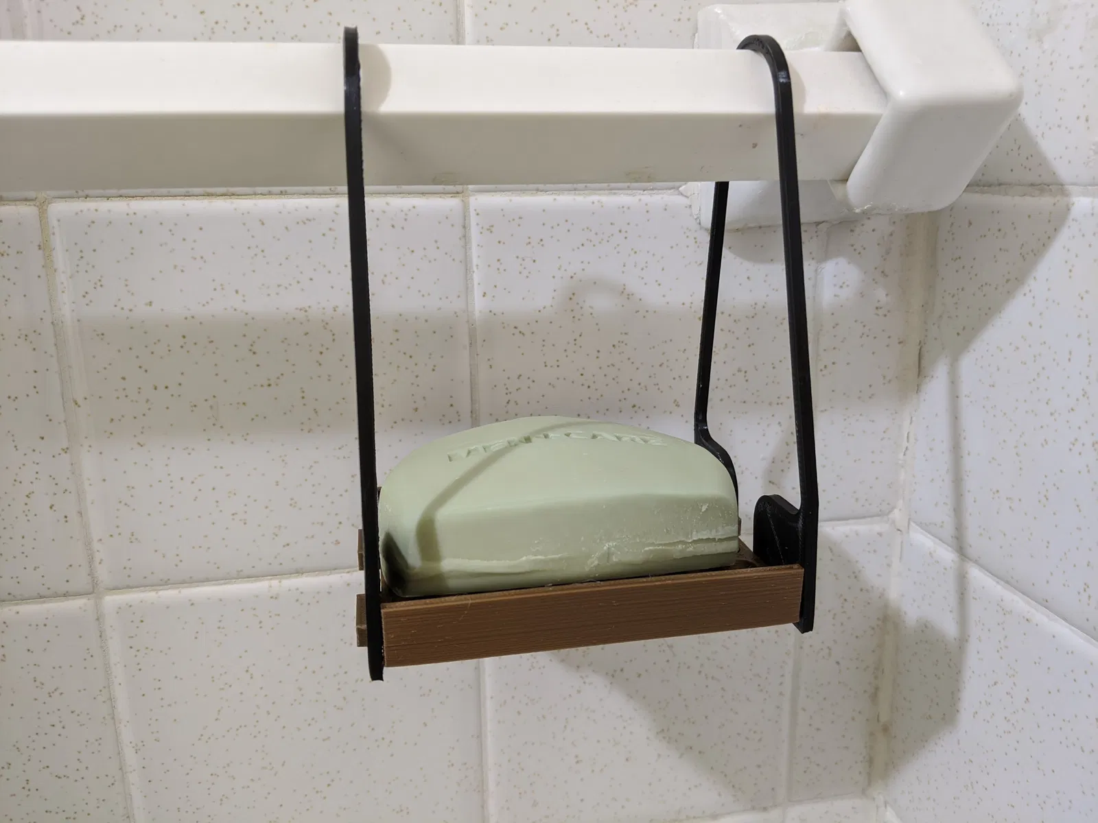 Kệ xà phòng được thiết kế để treo trên thanh vắt khăn trong phòng tắm nhà em. Hai bên hông sẽ tự động gài vào sau khi đặt chúng lên thanh vắt khăn để khỏi cần tháo cả thanh ra lúc lắp. Kệ vừa với thanh đường kính 1 inch và đựng được bánh xà phòng kích thước 90mm x 65mm.