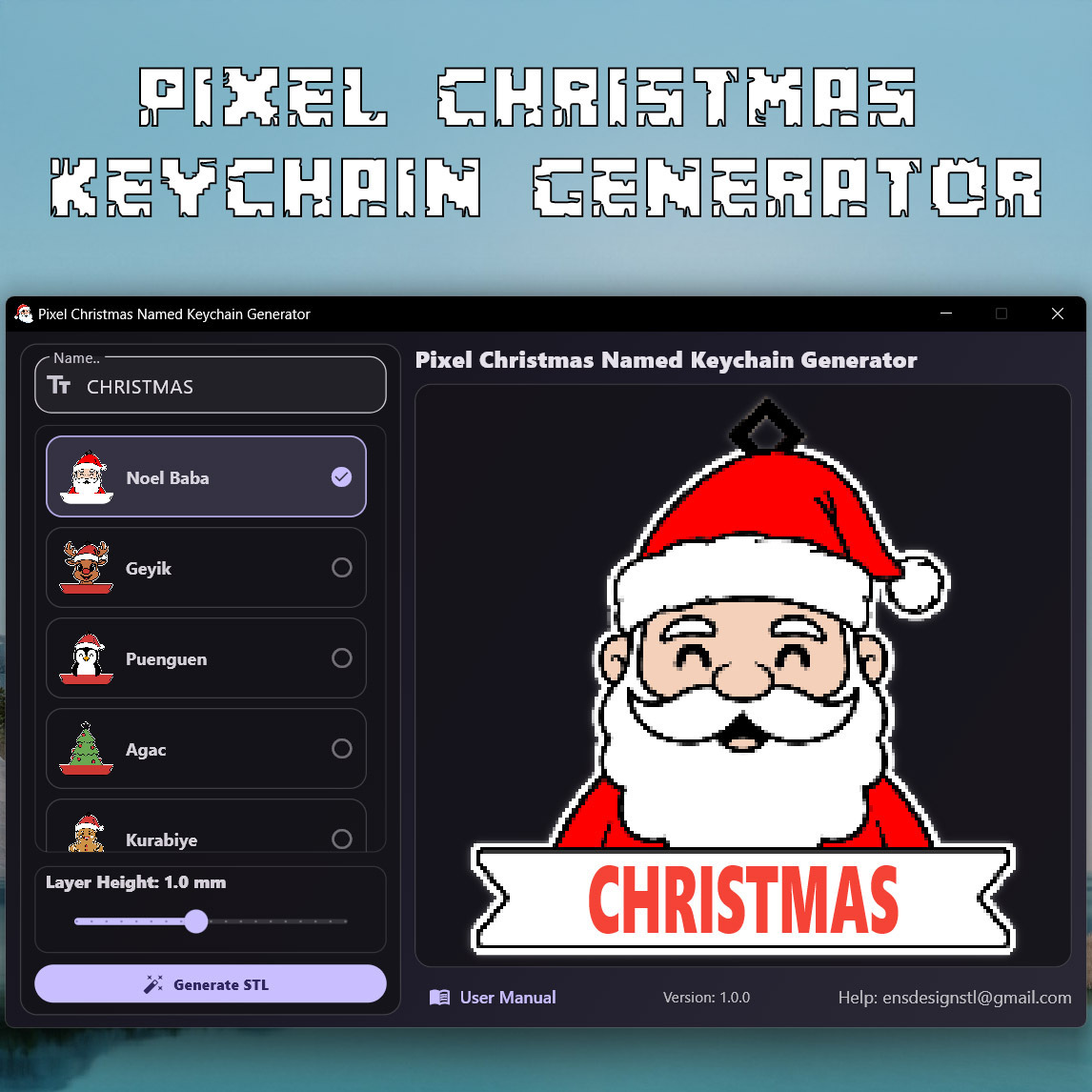 Tạo móc khóa tên, đồ trang trí Giáng Sinh 3D phong cách pixel độc đáo chỉ trong vài giây với ứng dụng desktop Windows này. Biến bất kỳ tên nào thành mô hình STL sẵn sàng in, hoàn hảo cho quà tặng, trang trí cá nhân và các sản phẩm mùa lễ hội.