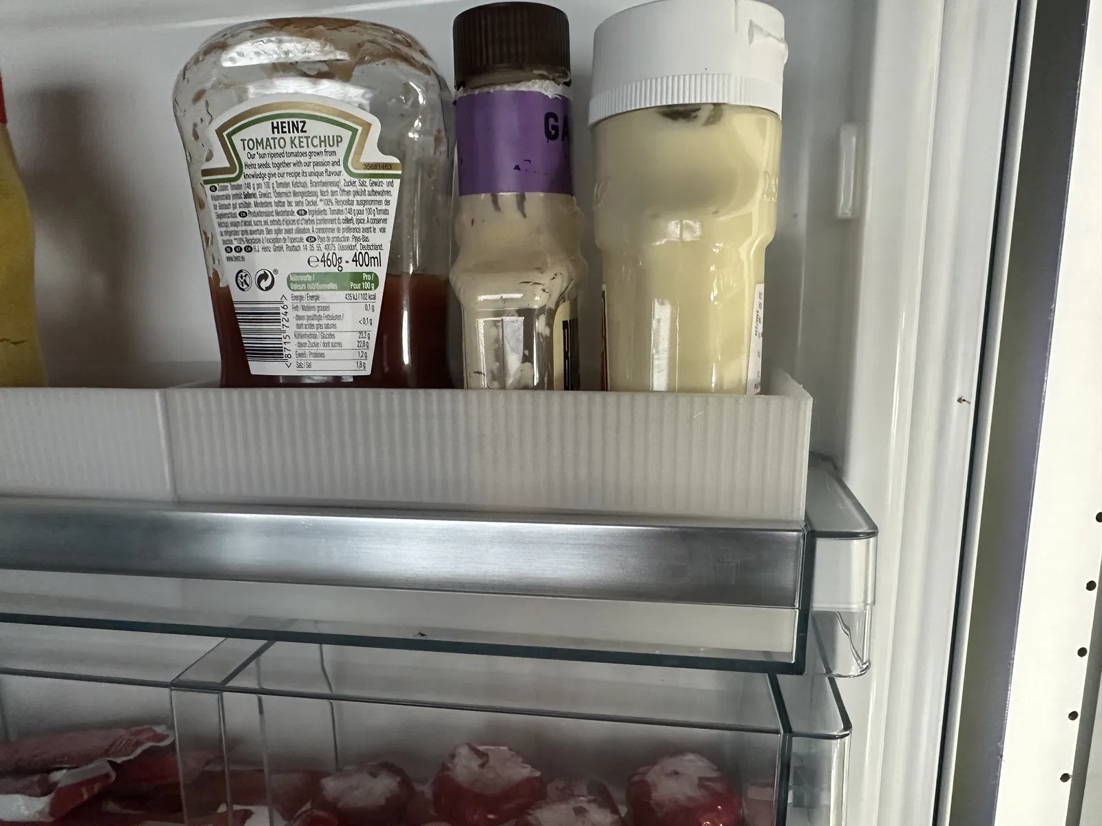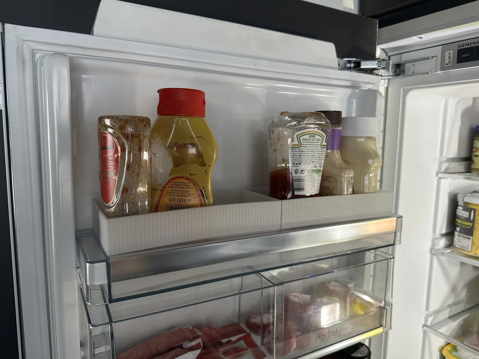 Cái khung này được thiết kế để gắn vô hộc cửa của tủ lạnh Siemens. Nó ngăn mấy chai nhỏ, ví dụ như chai sốt hay chai nước nhỏ xíu, bị rơi ra khi mình mở cửa tủ.