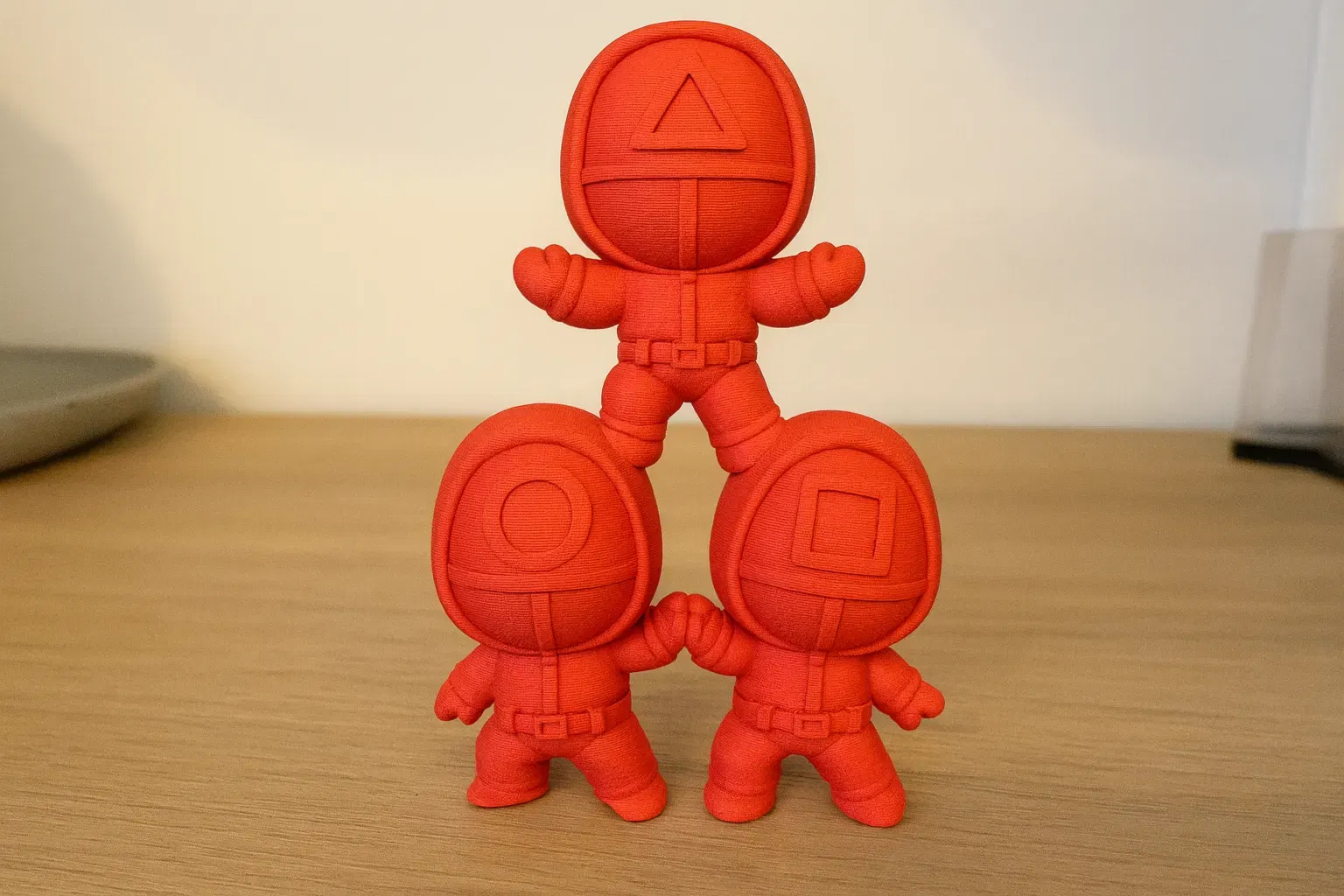 Mô hình chibi ba anh bảo vệ Squid Game với mặt nạ tròn, tam giác, vuông xếp chồng lên nhau. Một món đồ trang trí bàn làm việc hoặc sưu tầm pop culture độc đáo, mang phong cách dễ thương.