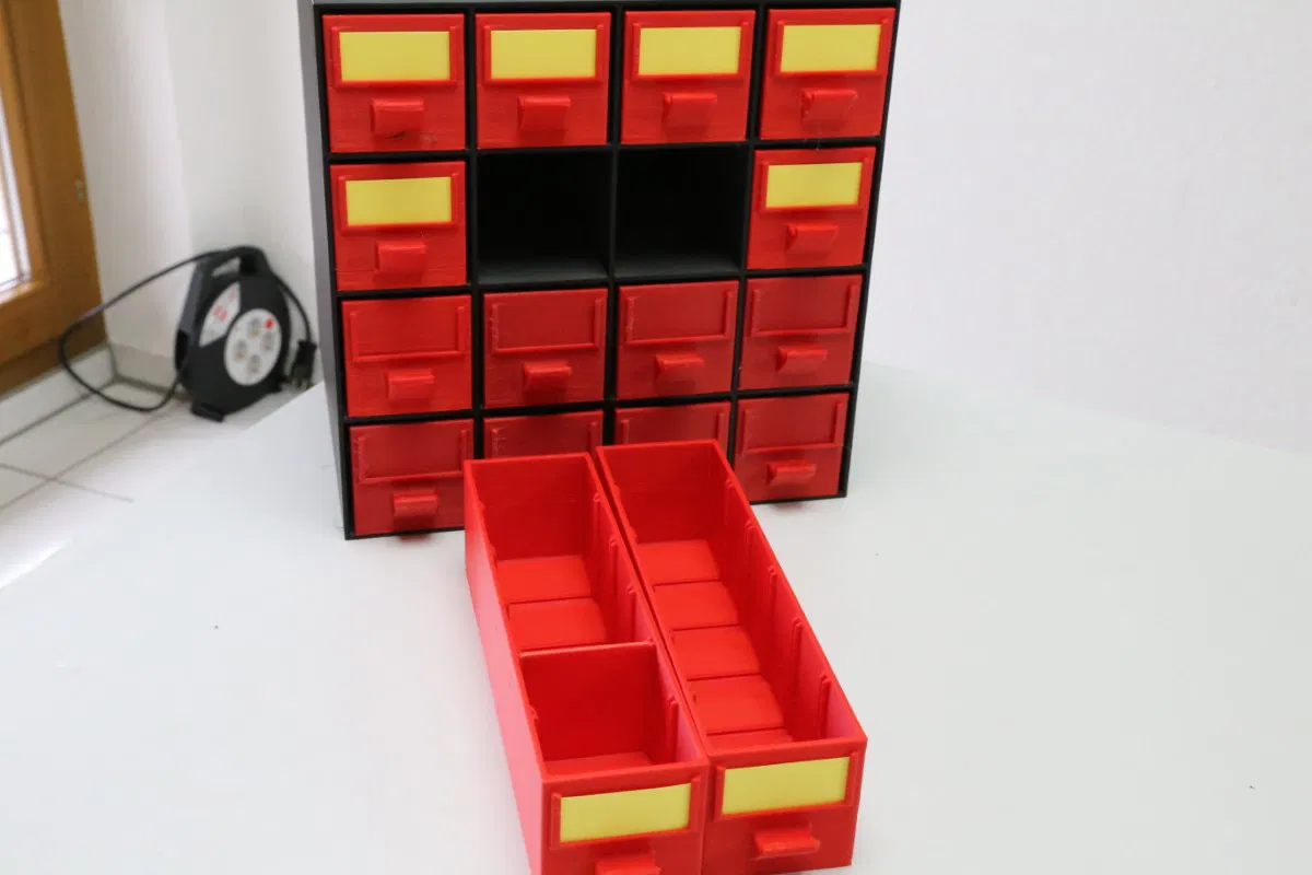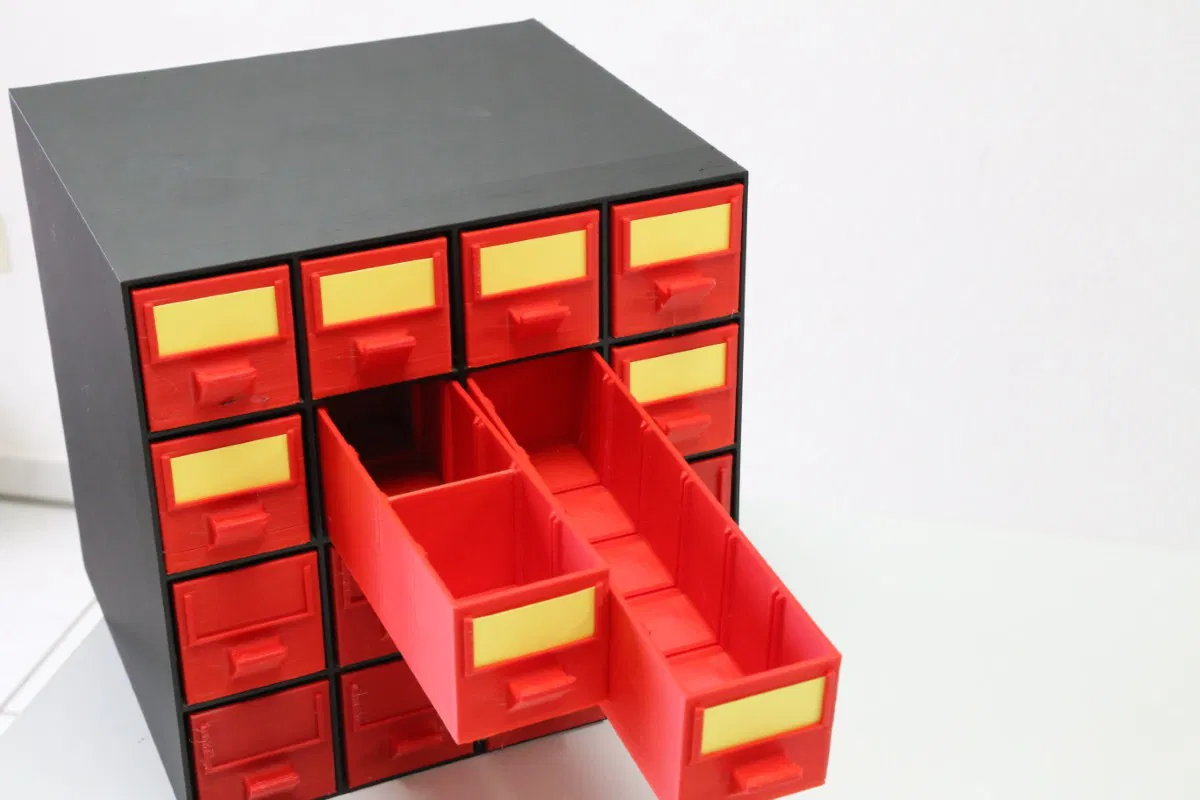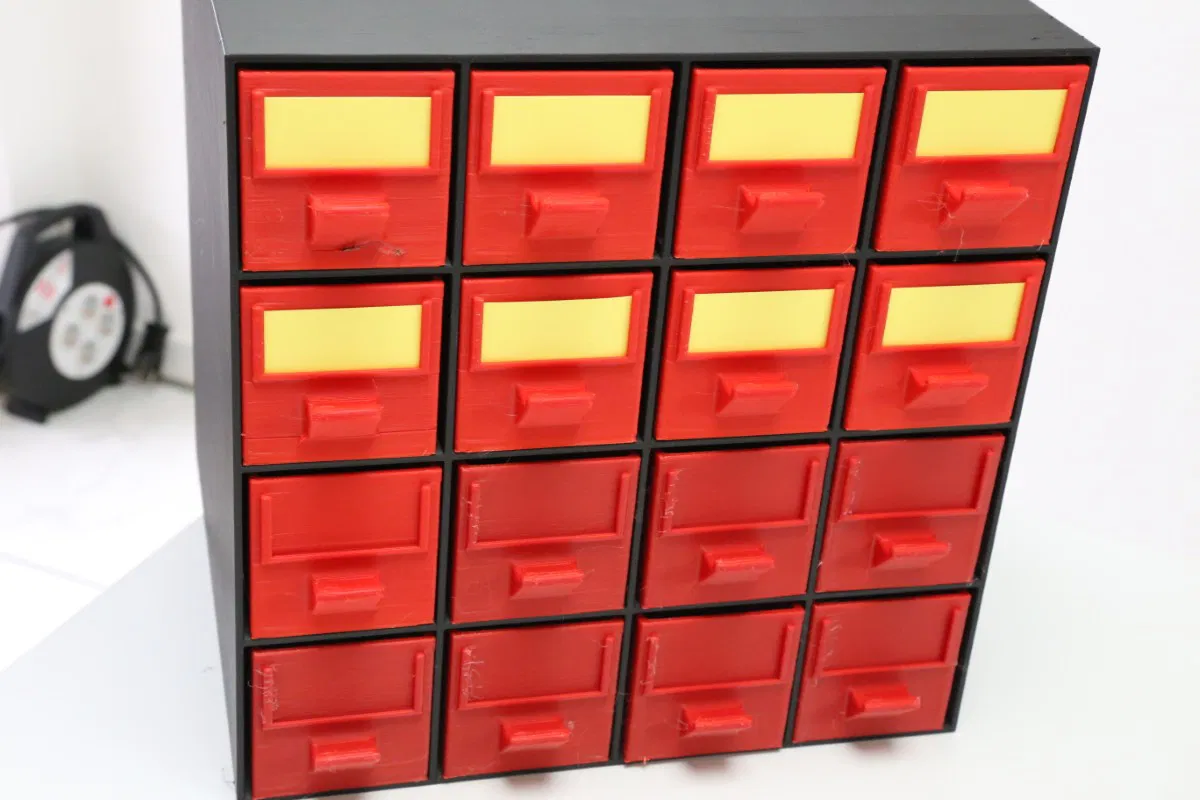 Hộp 16 ngăn cực kỳ chắc chắn với kích thước 300x300x300mm, dành cho mấy máy in khổ lớn như Prusa XL. Hộp có thể chứa đồ kim loại nặng, các ngăn kéo có thể dán nhãn và chia nhỏ. Không bị rớt ngăn kéo ra ngoài nhờ chốt chặn.