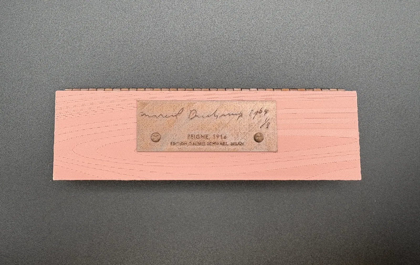Đây là mô hình của Peigne, một tác phẩm điêu khắc Readymade được mệnh danh là “chỉnh sửa” do Marcel Duchamp tạo ra vào năm 1916. Mặc dù hầu hết các phiên bản gốc của Readymades đã bị thất lạc, chúng ta vẫn có thể xem bản gốc tại Bảo tàng Nghệ thuật Philadelphia. Ngoài ra còn có các phiên bản được tạo vào năm 1963 và 1964, được trưng bày trong các bảo tàng và bộ sưu tập tư nhân trên toàn thế giới.