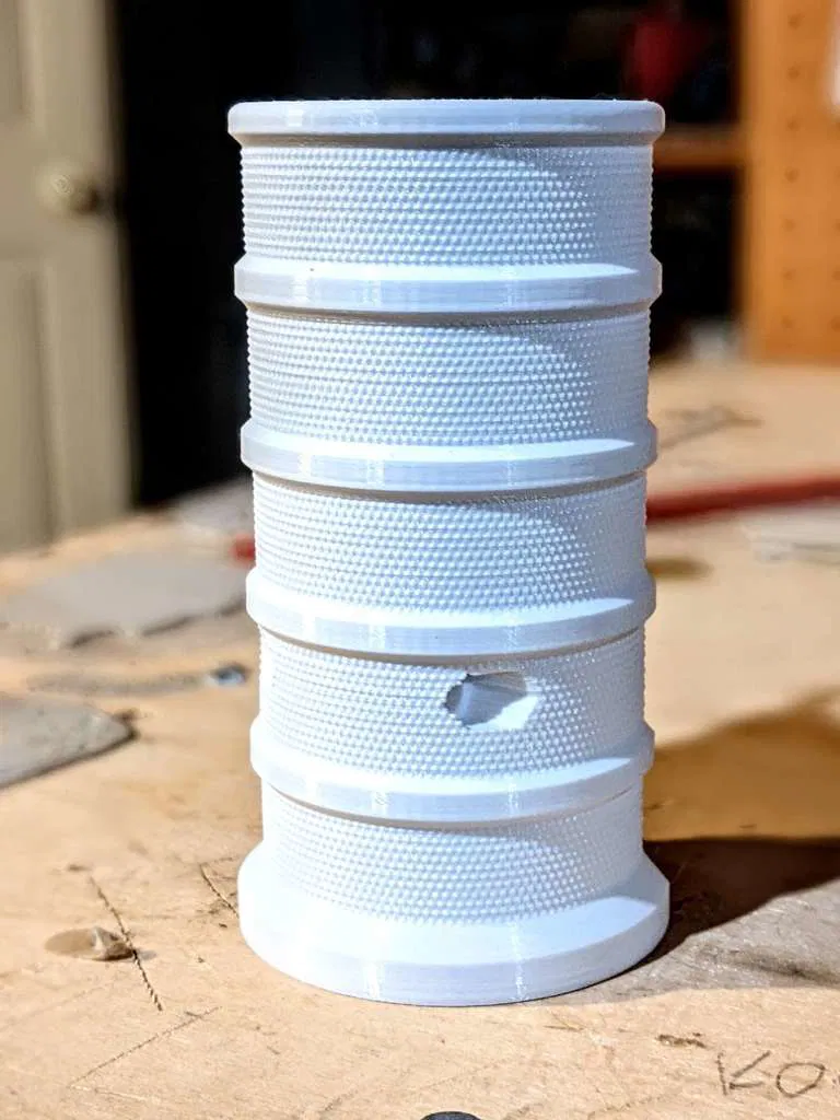 Tay cầm Boom nay được làm lại cho X-Shot Longshot, có thêm vân xoắn cho dễ cầm. Gắn bằng một bu lông M5 và đai ốc M5, in không cần đế. Bộ phận này gắn từ phía trước và siết bu lông lại.