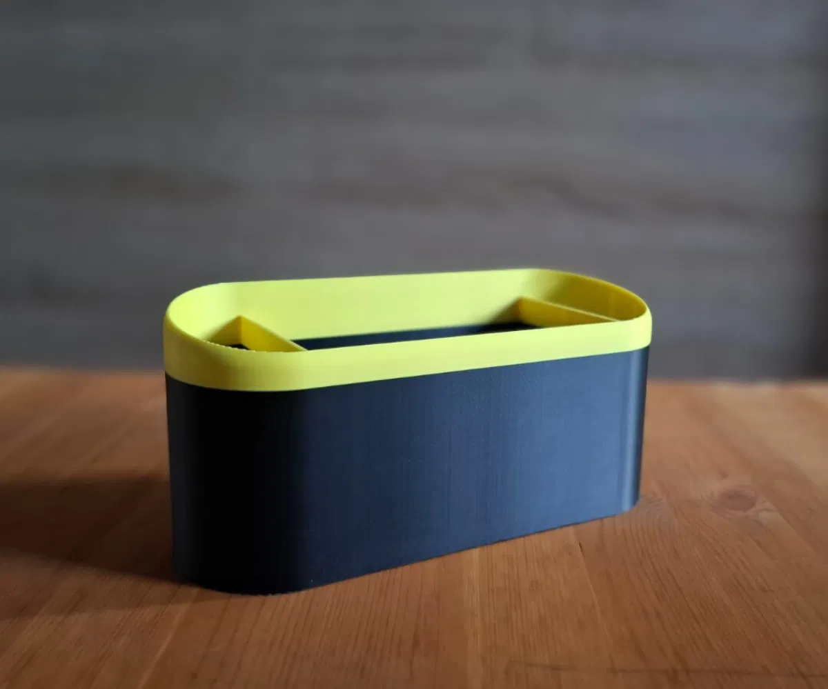 Một cái hộp đựng đồ văn phòng hình oval gọn gàng, có dạng hình chữ nhật bo tròn với không gian bên trong rộng rãi để đựng bút, bút lông, kéo, thước và các dụng cụ nhỏ. In không cần support, trông rất đẹp khi phối hai màu, và đặt vừa vặn trên mọi bàn làm việc hay bàn kỹ thuật.