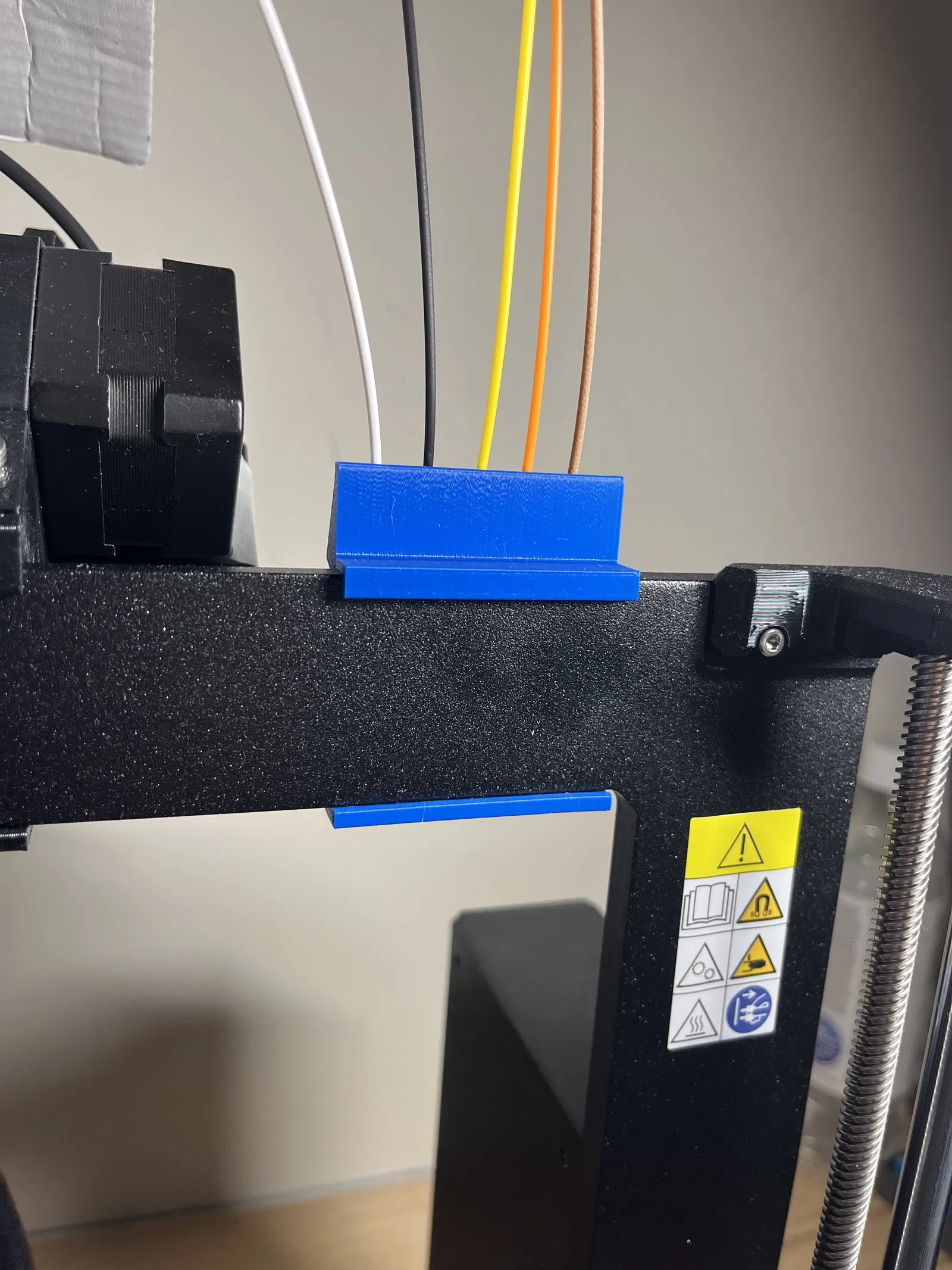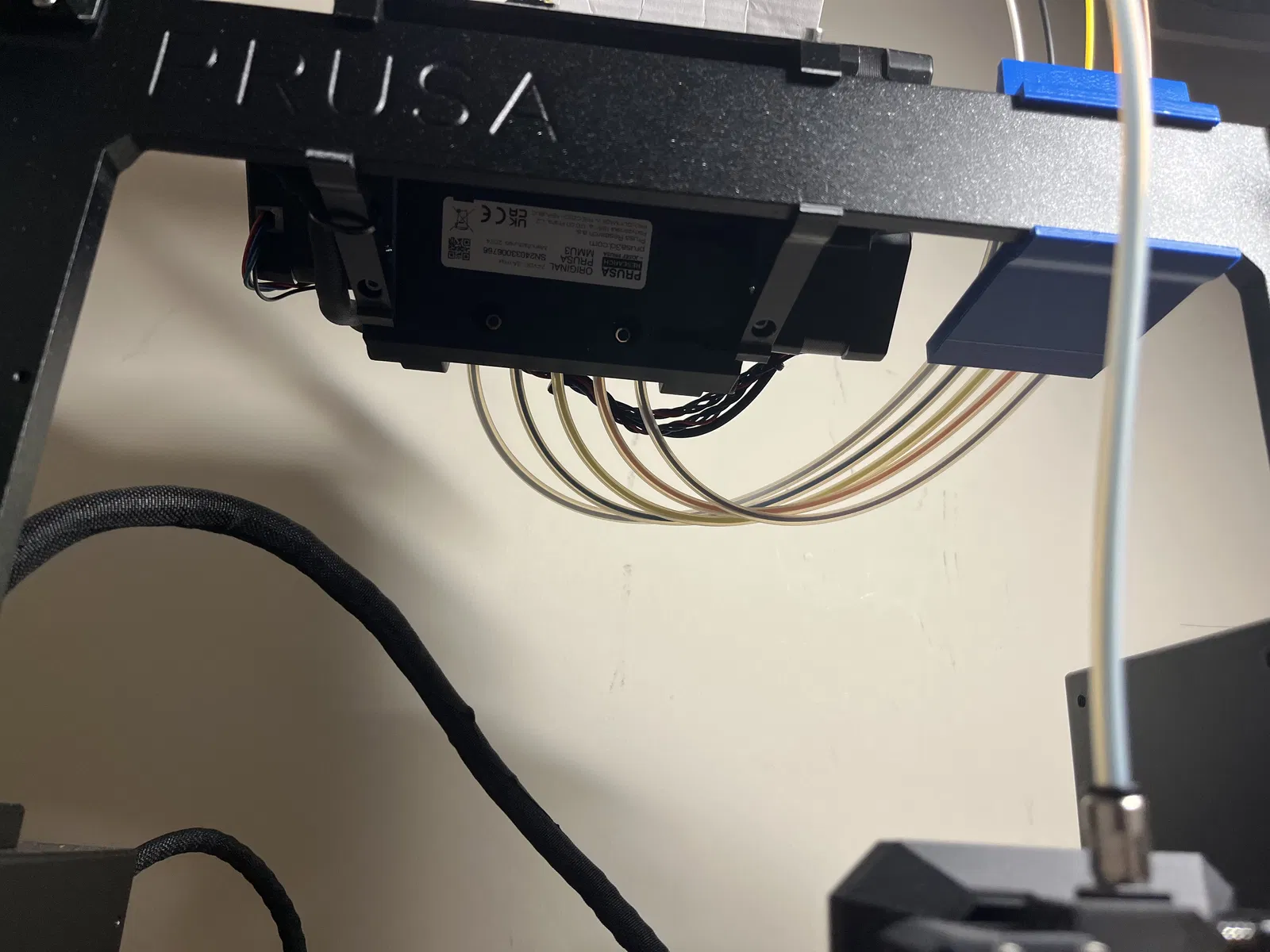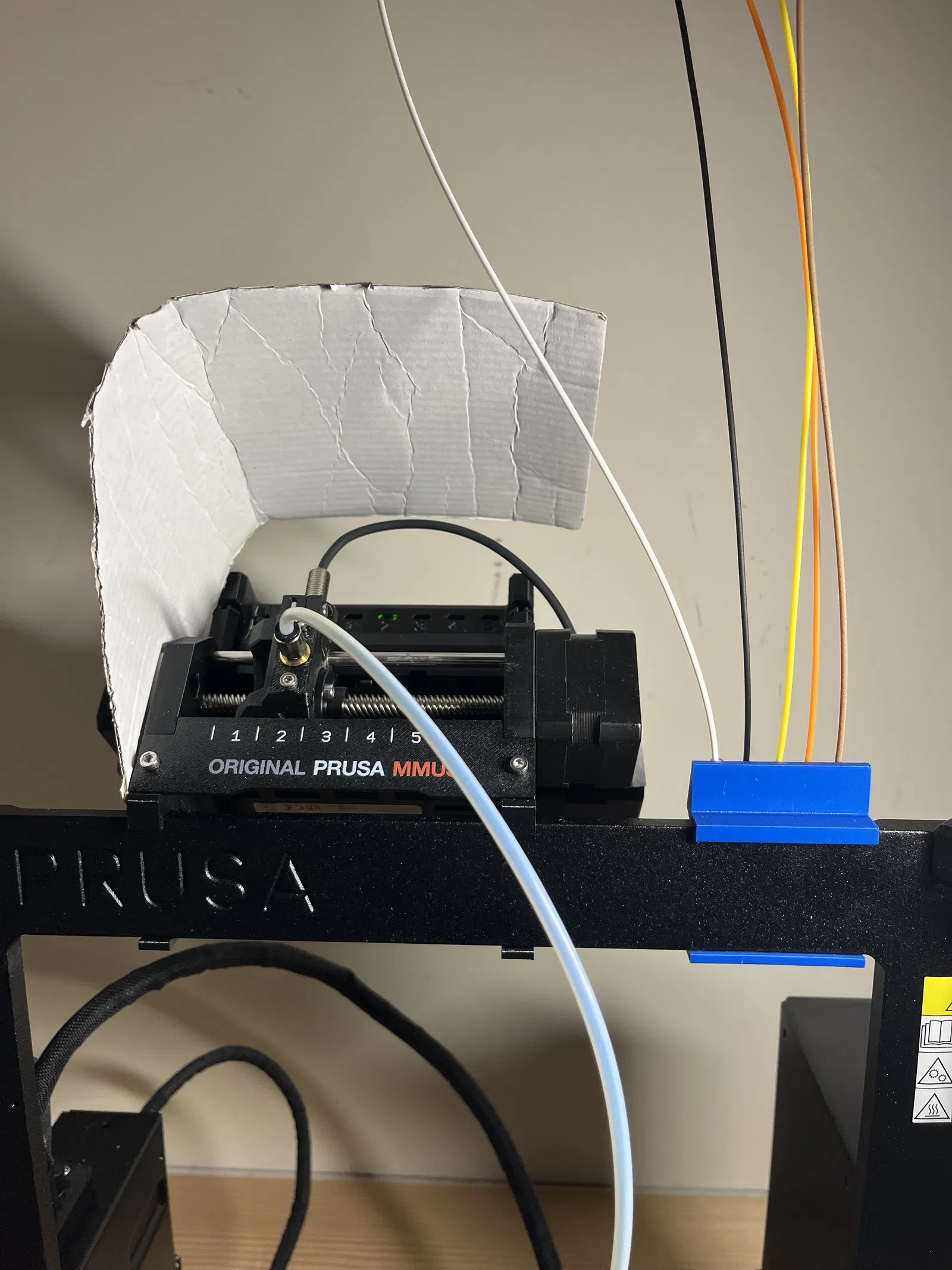 Tui có một cấu hình khá độc đáo, có nhiều không gian phía trên máy in 3D của tui, cho phép luồn dây tóc từ trên xuống thẳng vào đầu nóng, bộ MMU3 mặc định không hỗ trợ tốt lắm.