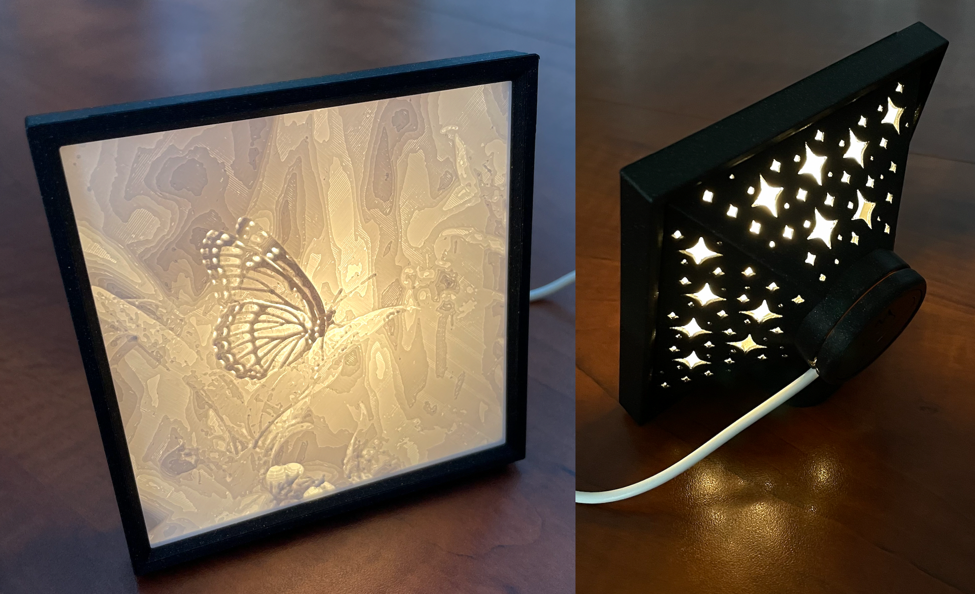 Chuyển thể từ khung ảnh lithophane IKEA Halvklart, bản in này có thiết kế mặt sau mới với thêm nhiều ngôi sao và một nút mới. Hướng dẫn chi tiết cách in và lắp ráp bằng PLA hoặc PETG.