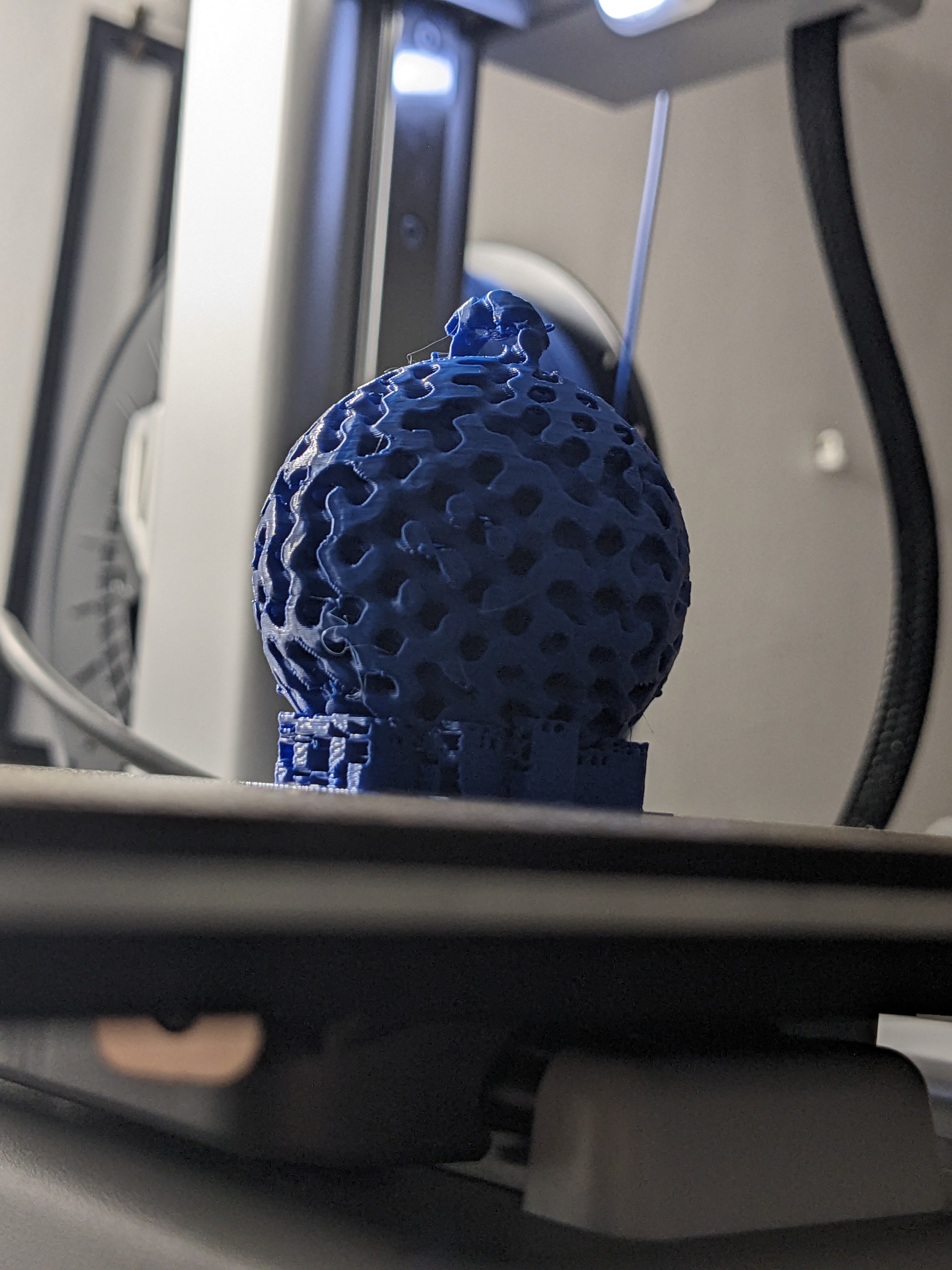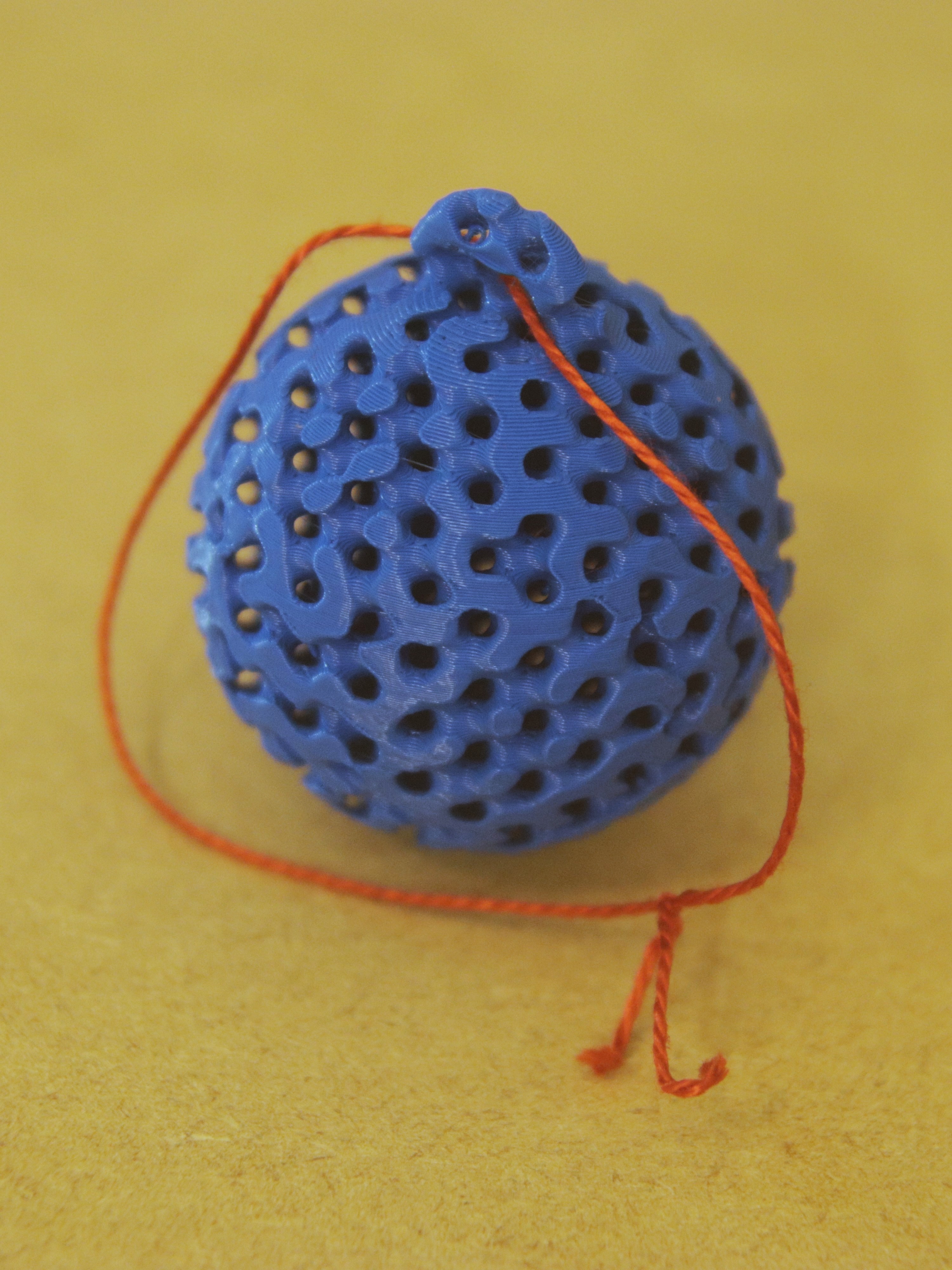 Trang trí quả châu Giáng sinh hình Gyroid. Phần rỗng bên trong giúp giảm thời gian in và cho phép nhiều ánh sáng xuyên qua hơn. Thiết kế bằng Fusion & Hyperganic.