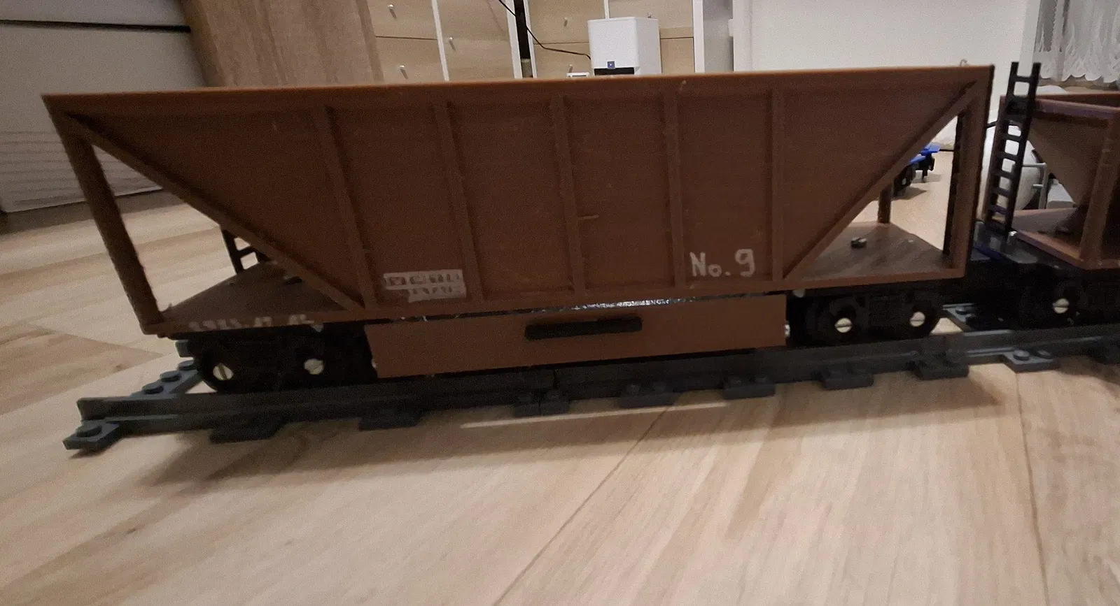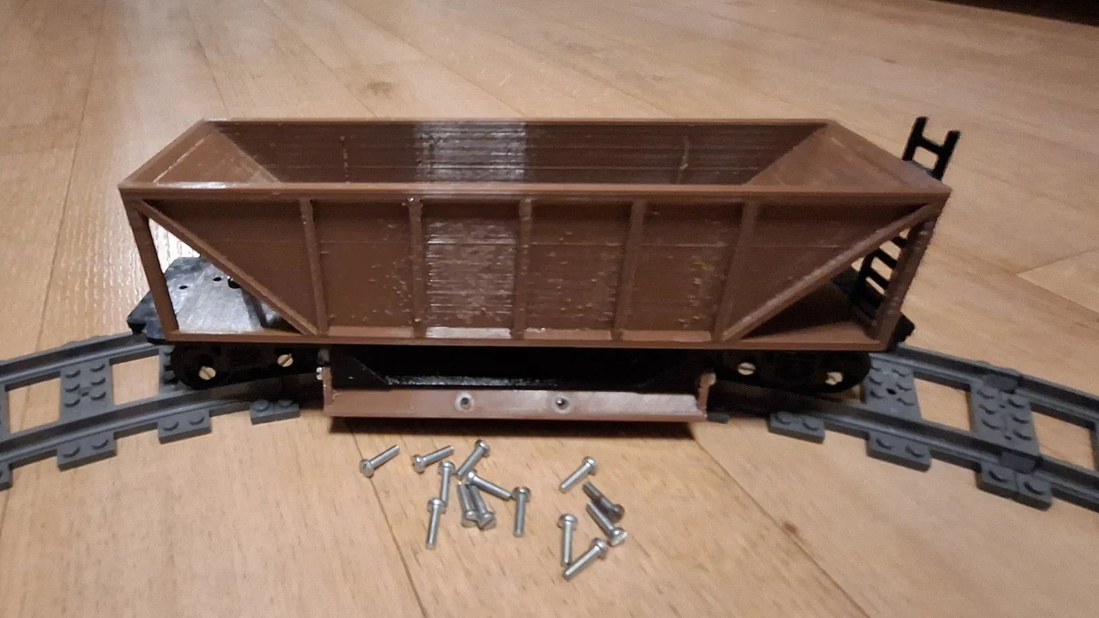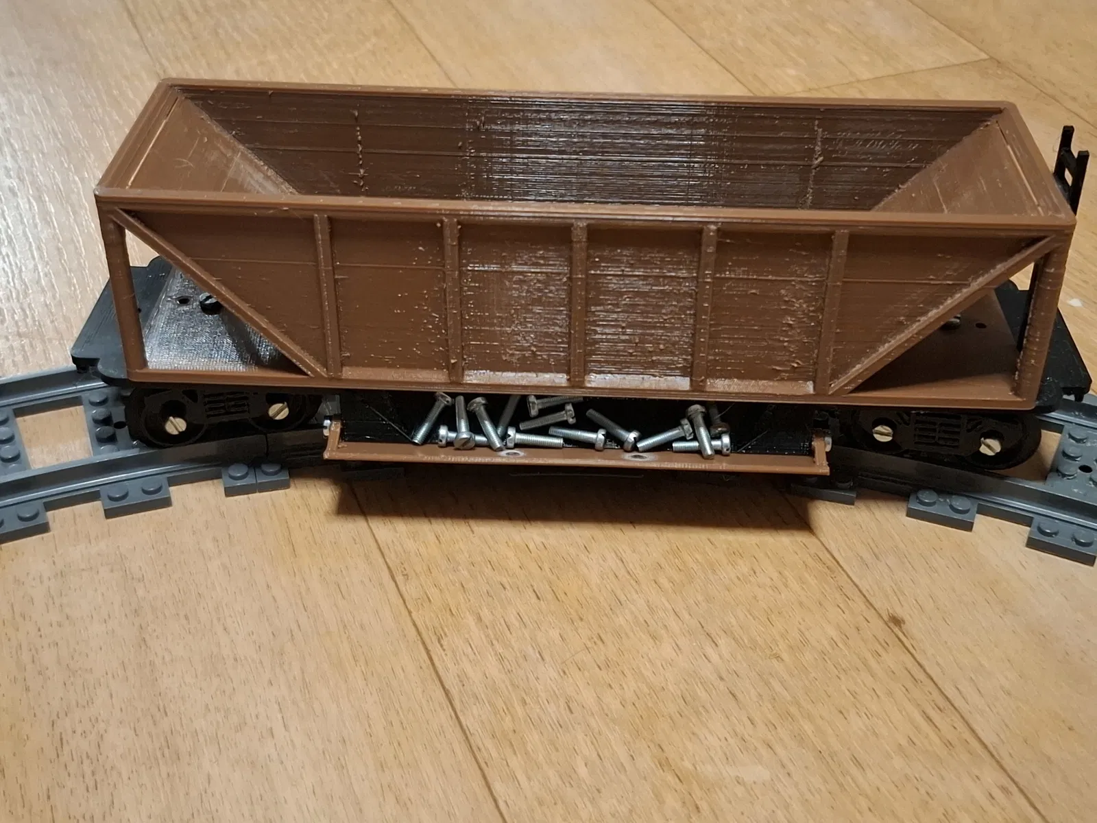 Tàu Lego - toa xe chở hàng chức năng tương thích. Mô hình này tương thích với tàu Lego và là phần mở rộng cho các mô hình của ChisTompso, sử dụng khung gầm và khớp nối của anh ấy. Phiên bản cuối cùng có phần trên dài hơn. Vít 3x12mm có thể dùng vít ngắn hơn.