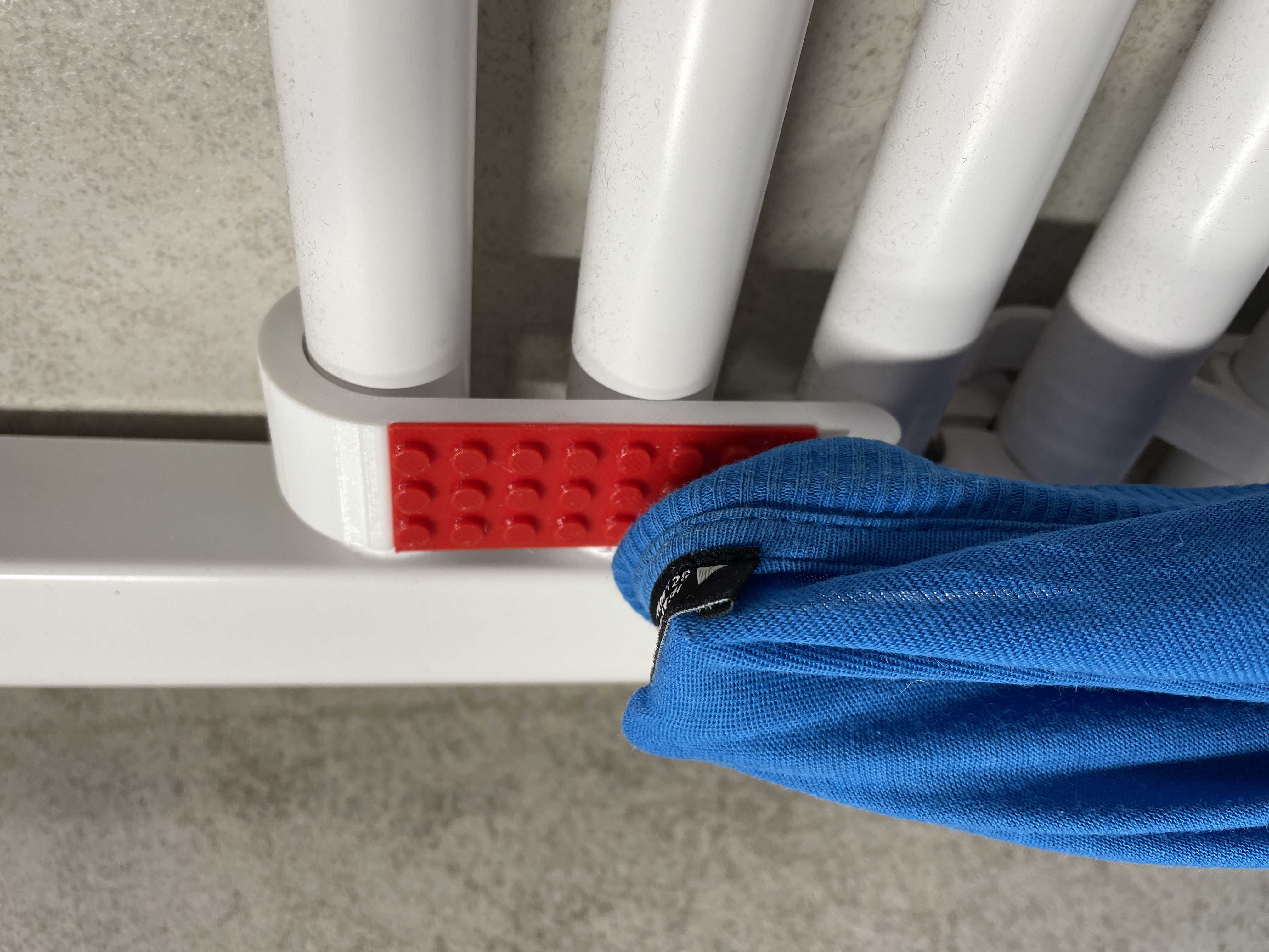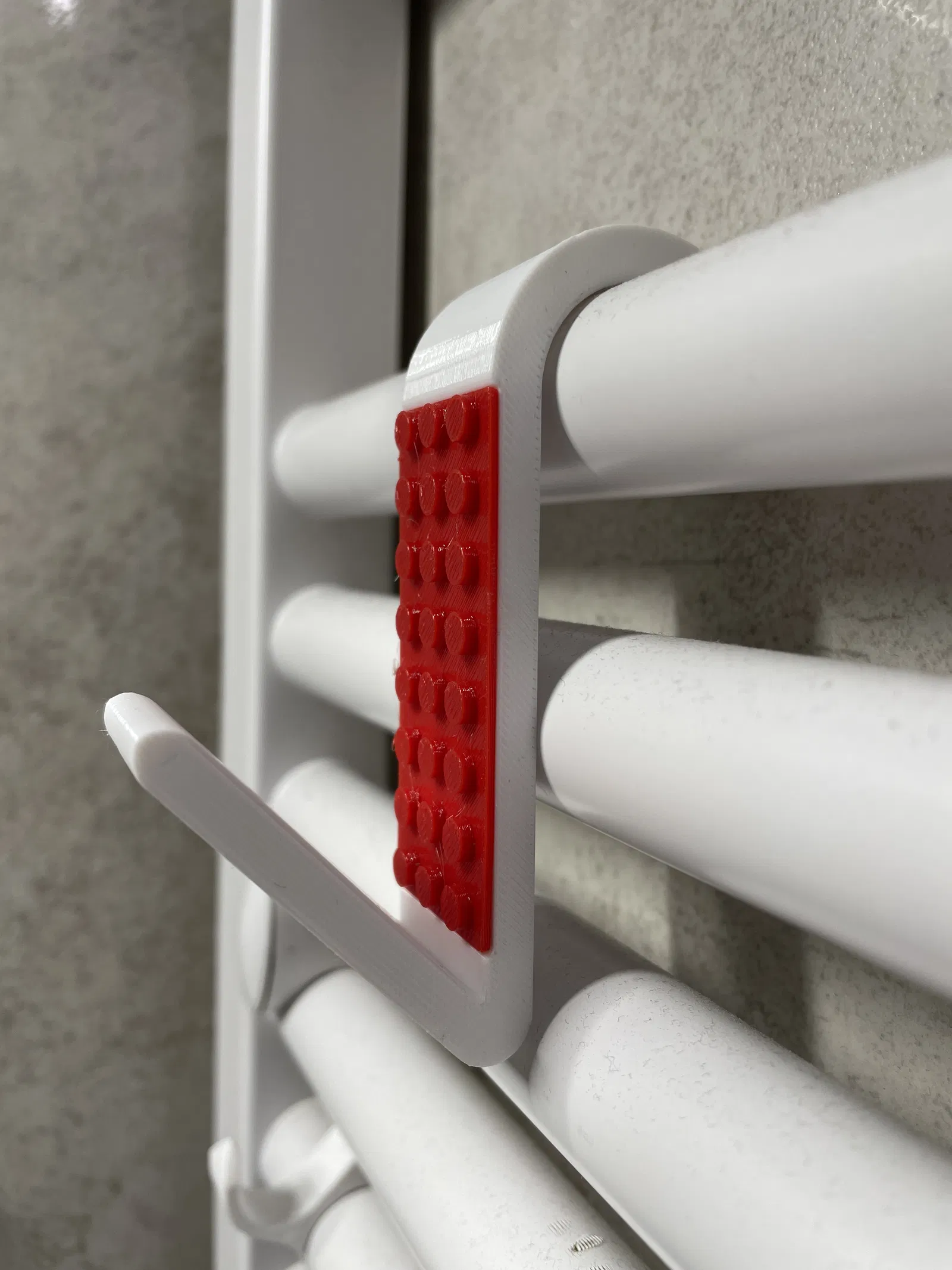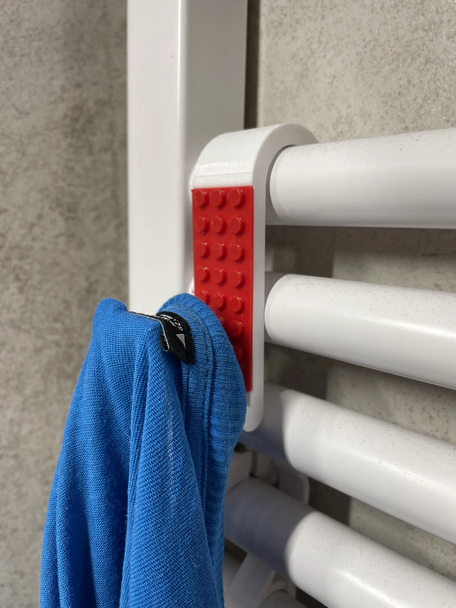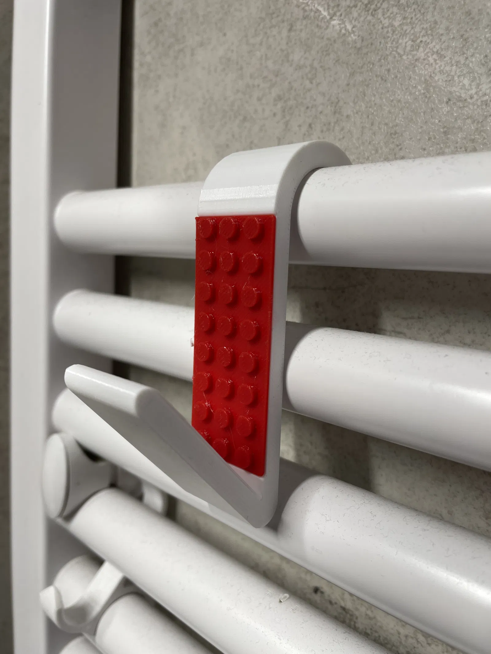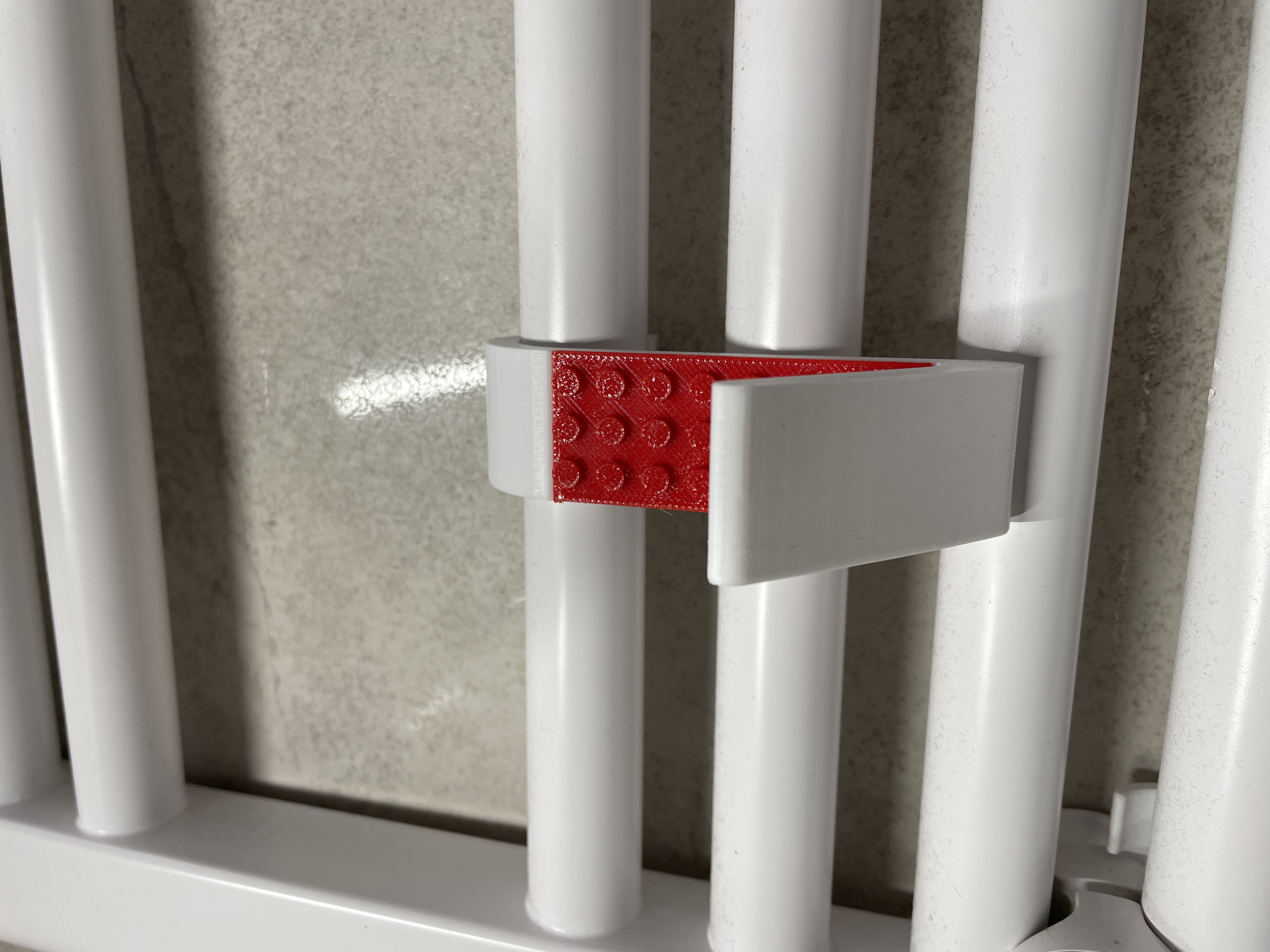 Chiếc móc treo khăn/áo choàng tắm độc đáo, lấy cảm hứng từ LEGO, gắn trực tiếp lên ống sưởi phòng tắm Ø23/24 mm. Dễ dàng in hai màu, không cần hỗ trợ. Kích thước nhỏ gọn, vật liệu PETG khuyên dùng cho độ bền cao.