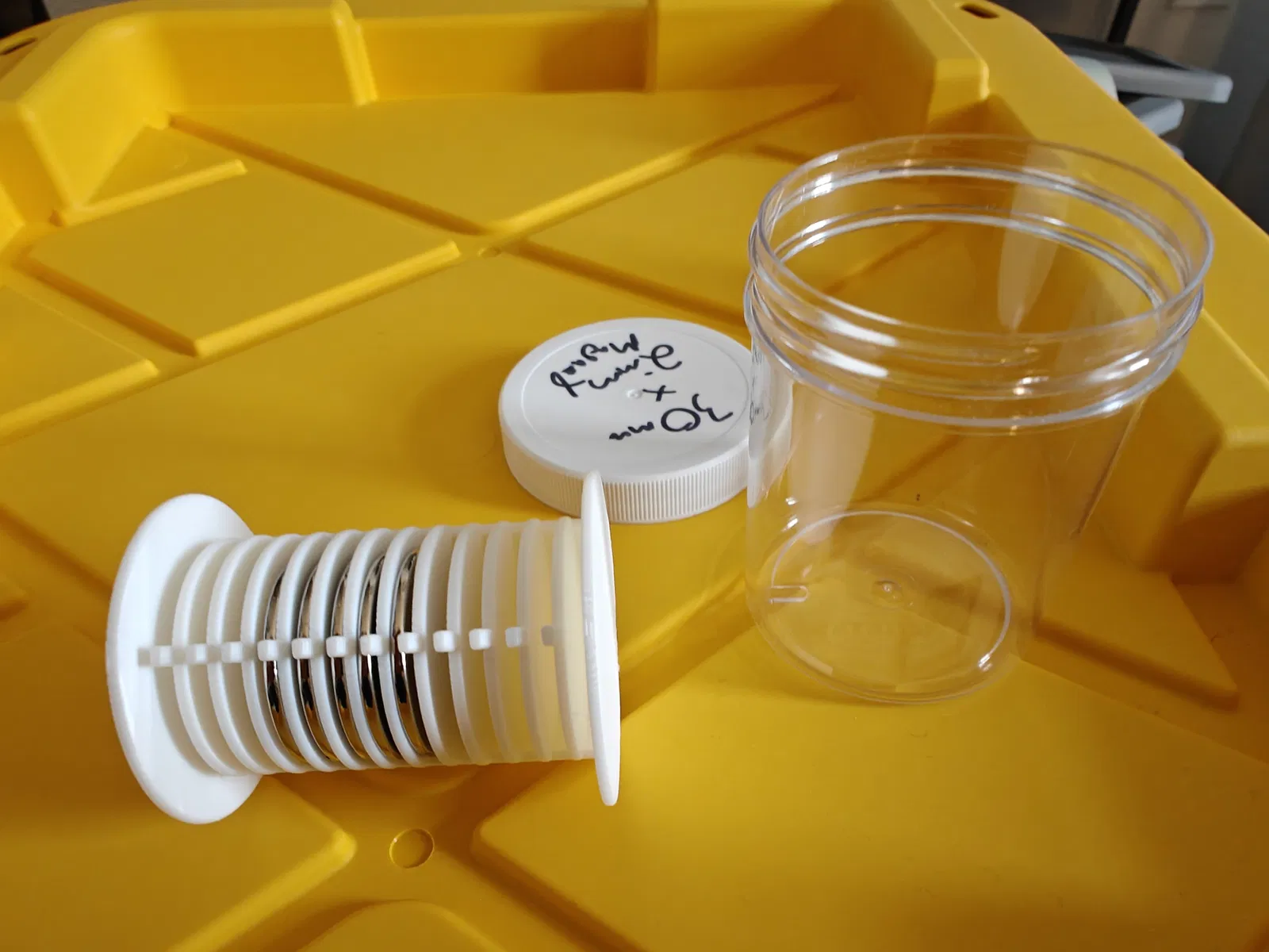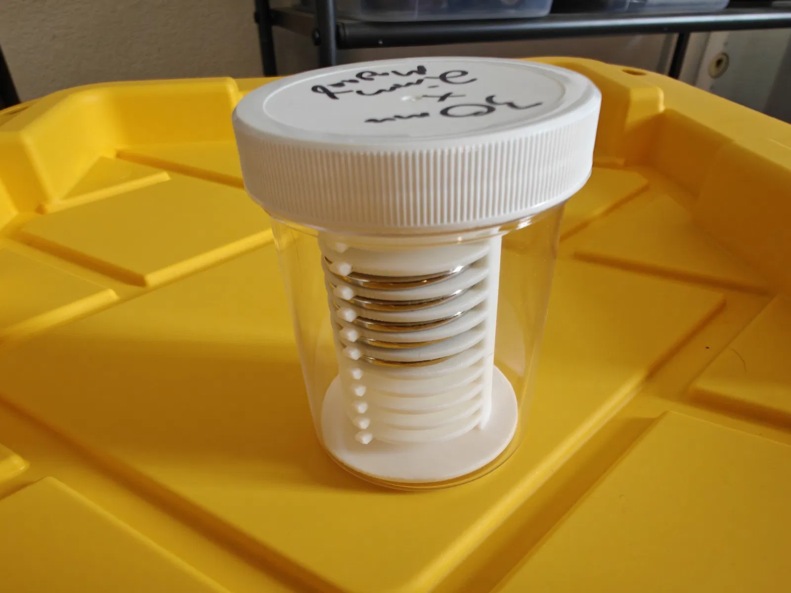 Nó vừa khít với cái hũ 4oz miệng rộng Uline S9934 luôn đó. Cái khoảng trống giữa thành hũ và mấy cục nam châm cũng giúp nó đỡ hút mấy cái đồ sắt gần đó.