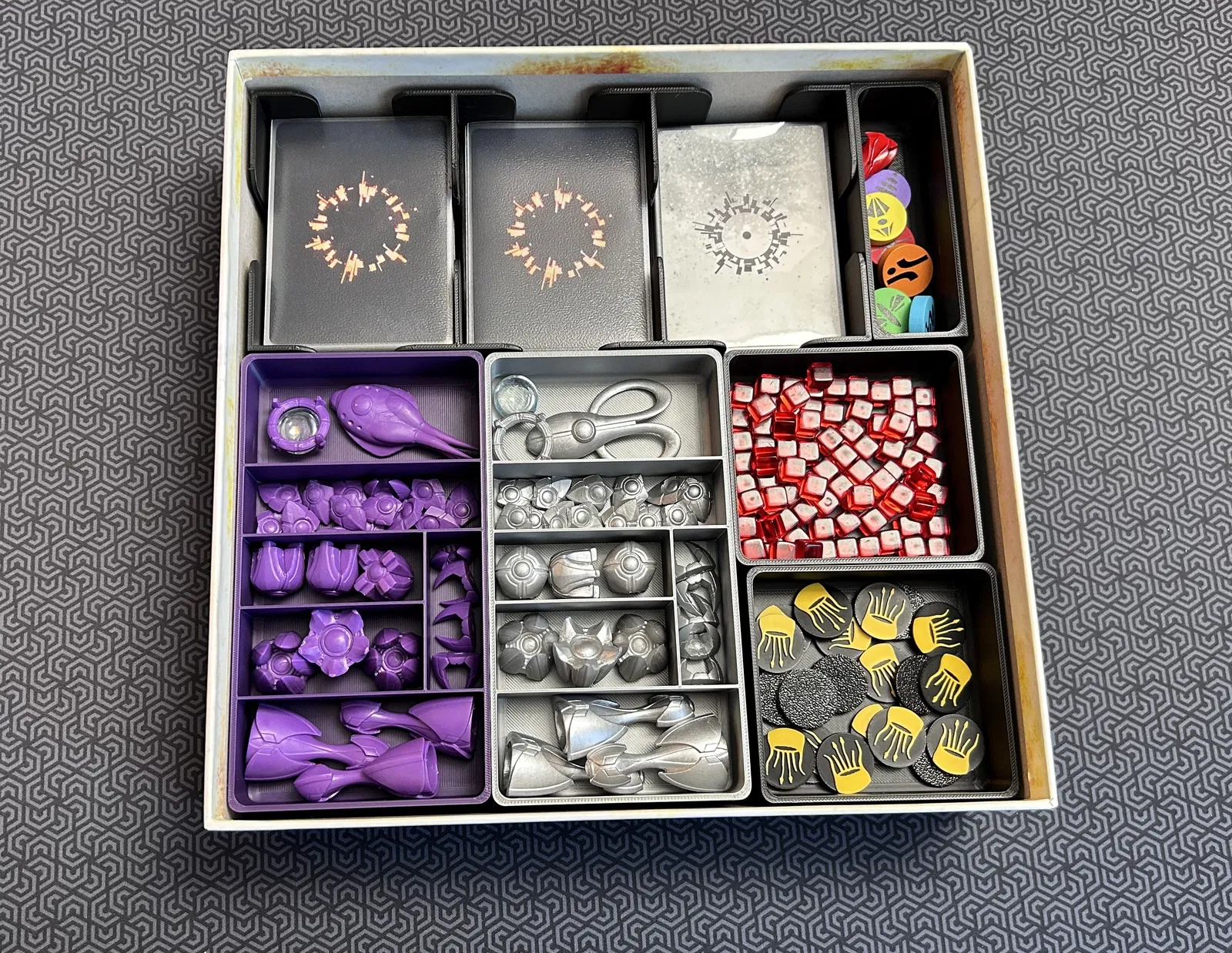 Bộ insert cơ bản cho board game 'Sol: Last Days of a Star', bao gồm các khay riêng cho từng người chơi, giúp sắp xếp gọn gàng và bảo vệ các lá bài.