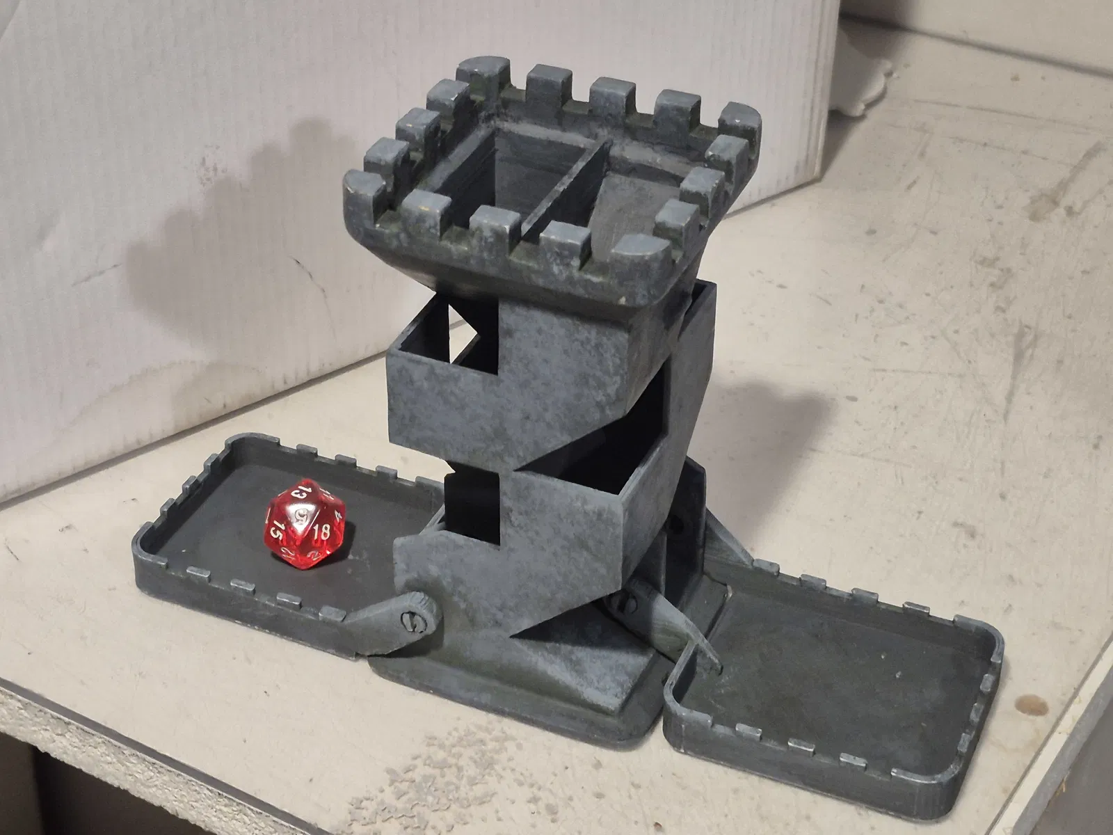 Tui đã cải tiến tháp xúc xắc có khay gấp gọn tiện lợi của 3DCentralVA, nay cứng cáp và khớp nối chính xác hơn. Phiên bản cao 196mm dành cho bộ xúc xắc lớn hơn cũng có sẵn.