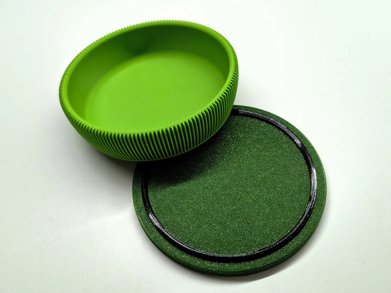 Bộ tô và khay, đường kính 100 mm. Cái khay có vòng chống trượt, có thể in bằng TPU để dán vô rãnh hoặc dùng làm nắp.