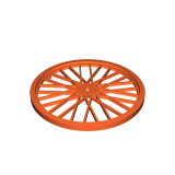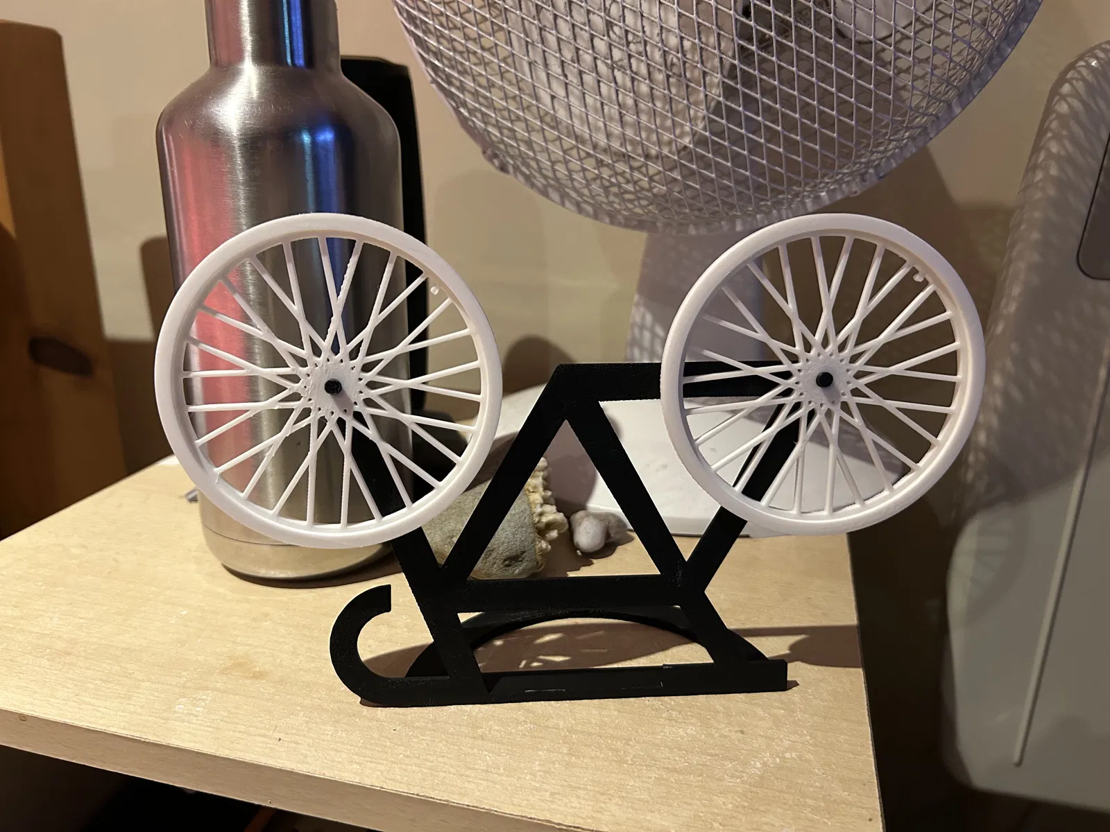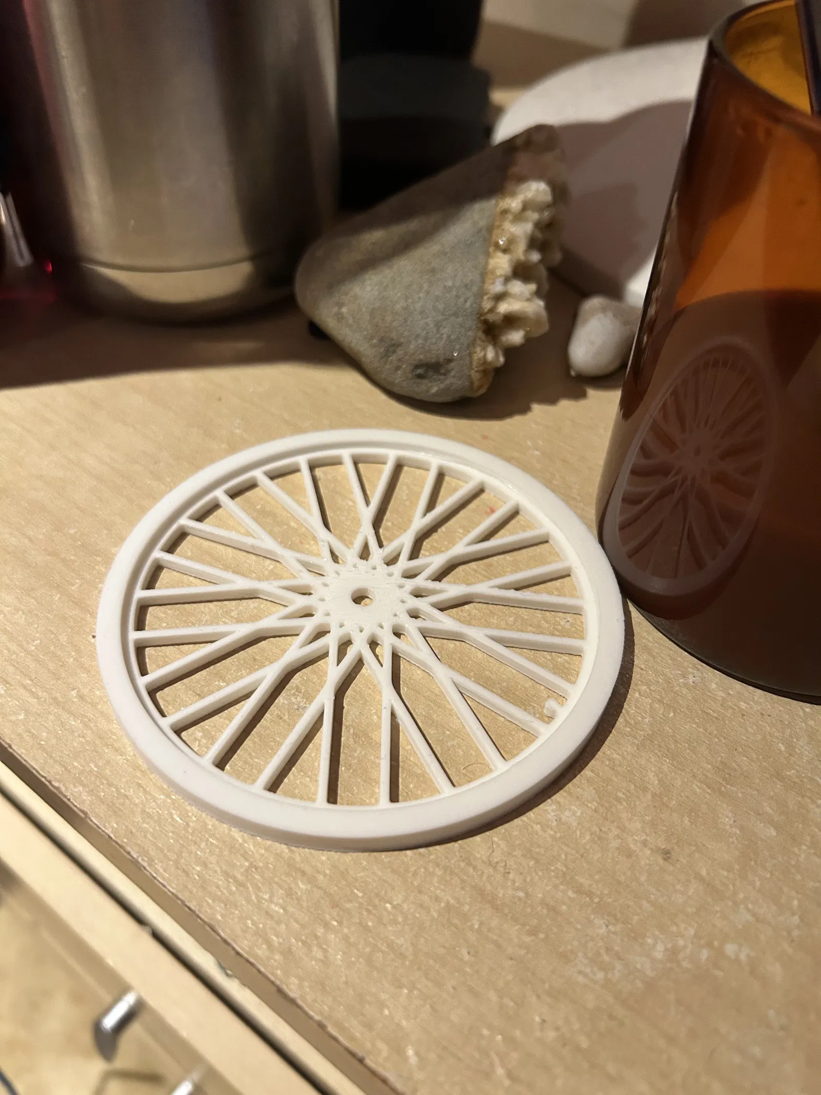 Bộ đế lót ly bánh xe đạp kèm chân đế. Hướng dẫn in chi tiết cho từng bộ phận, lưu ý cách in chốt và đế để đạt hiệu quả tốt nhất, cùng gợi ý về việc sử dụng 'ironing' để có bề mặt hoàn thiện đẹp mắt.