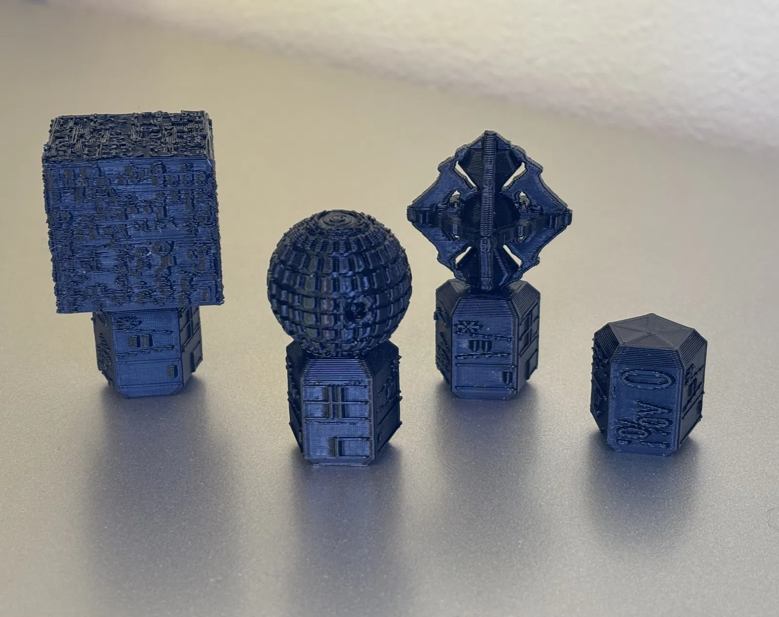 Những núm vặn này là bản "remix" từ các mẫu tàu vũ trụ board game trước đây của mình, được chỉnh sửa lại kích thước cho phù hợp và thay đổi các chi tiết bề mặt để cầm nắm và thao tác tốt hơn. Phần đế đã được mình sửa lại thành hình ngũ giác, mình gọi nó là PentaKnob. Ở đây có 4 loại núm vặn cho bạn lựa chọn, hầu hết đều in không cần hoặc cần rất ít "supports":