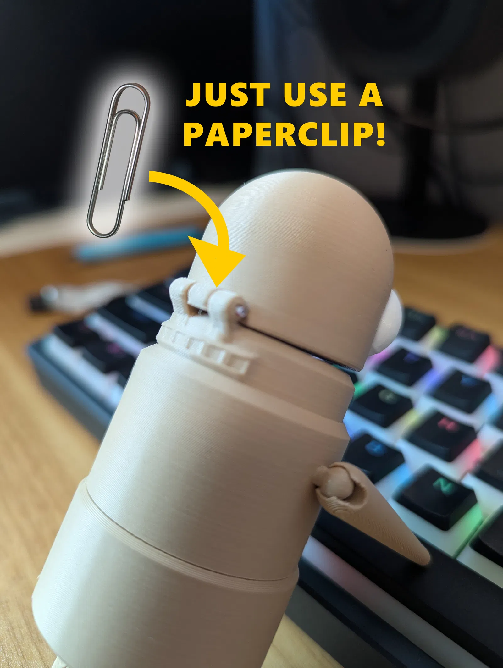 - Đầu Có Bản Lề – Mở và đóng bằng một chiếc kẹp giấy thật (vâng, cố ý làm vậy).