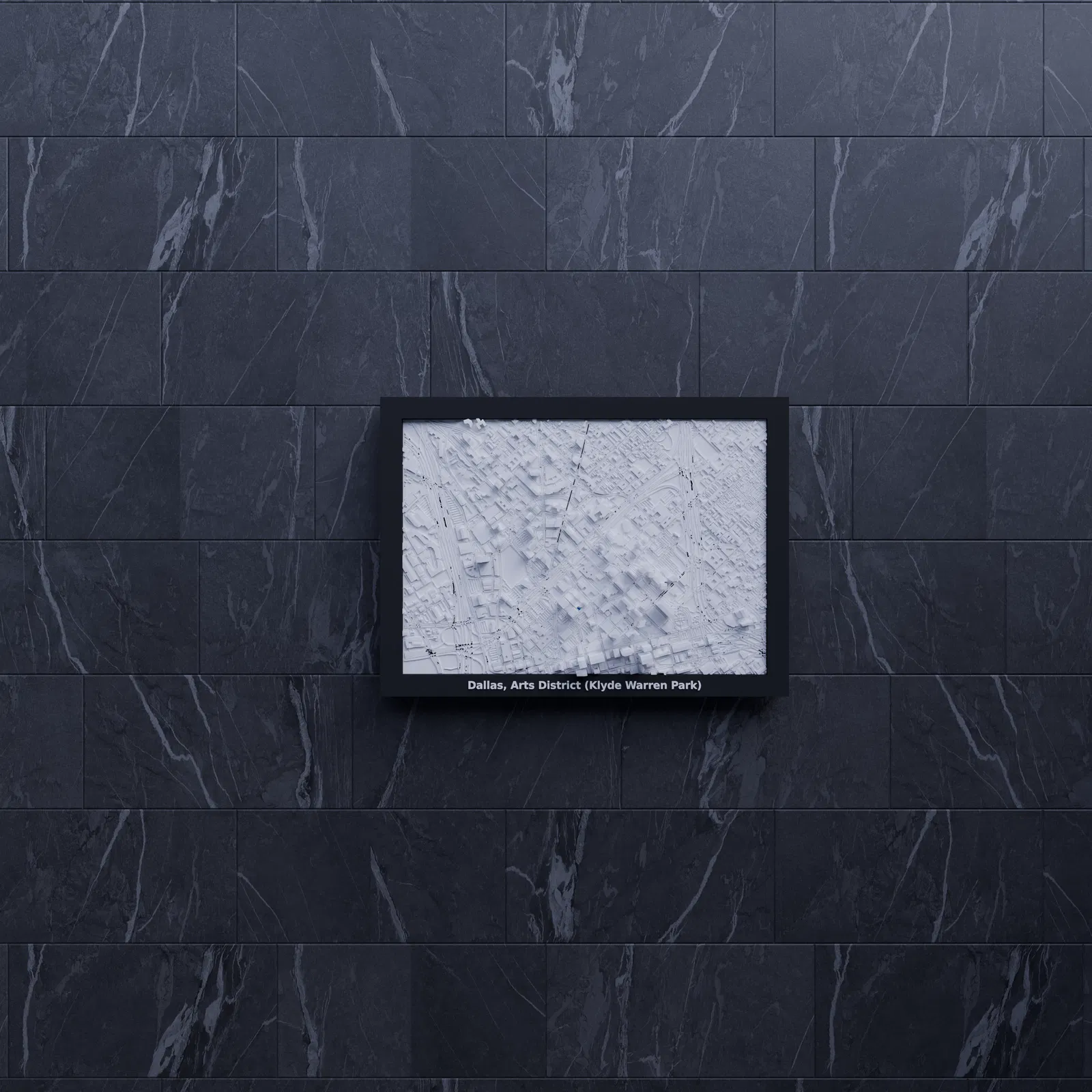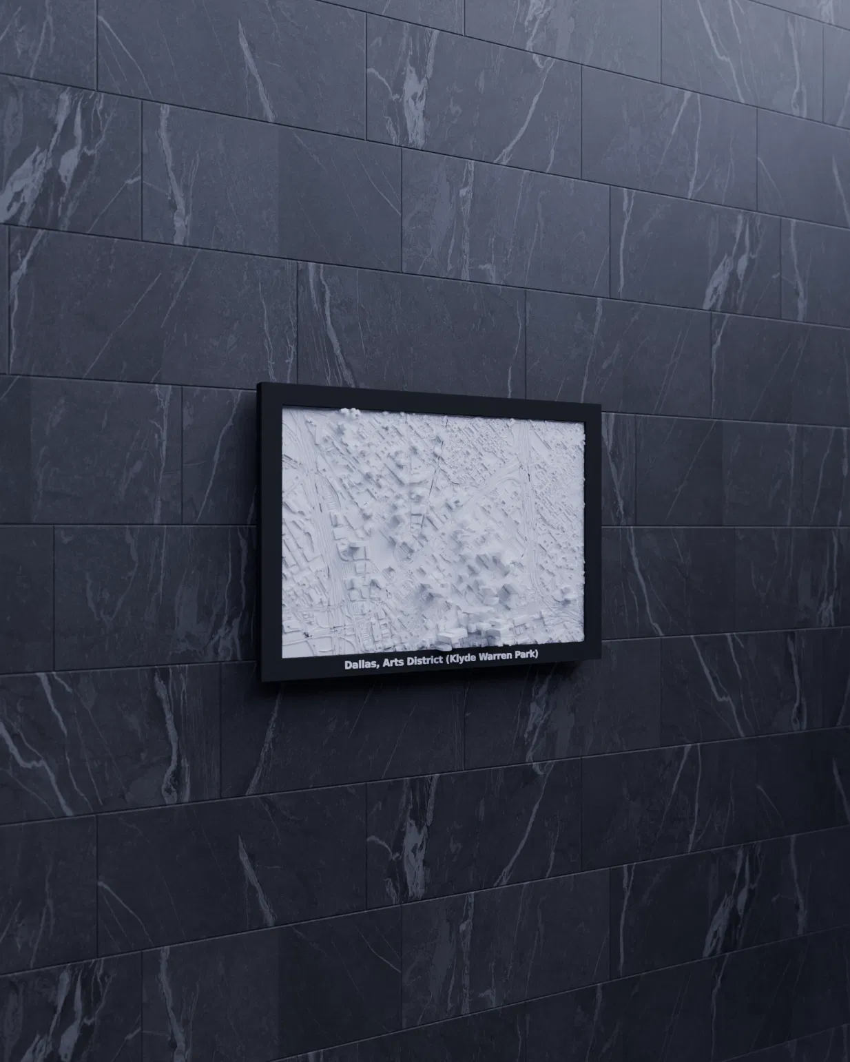 Mô hình địa hình thu nhỏ in 3D của Dallas, Arts District (Klyde Warren Park) tái hiện cảnh quan thành phố tuyệt đẹp. Kích thước thu nhỏ từ 2.859 km x 1.994 km xuống còn 170.5 mm x 119.5 mm, lý tưởng làm vật trang trí hoặc cho mục đích giáo dục.