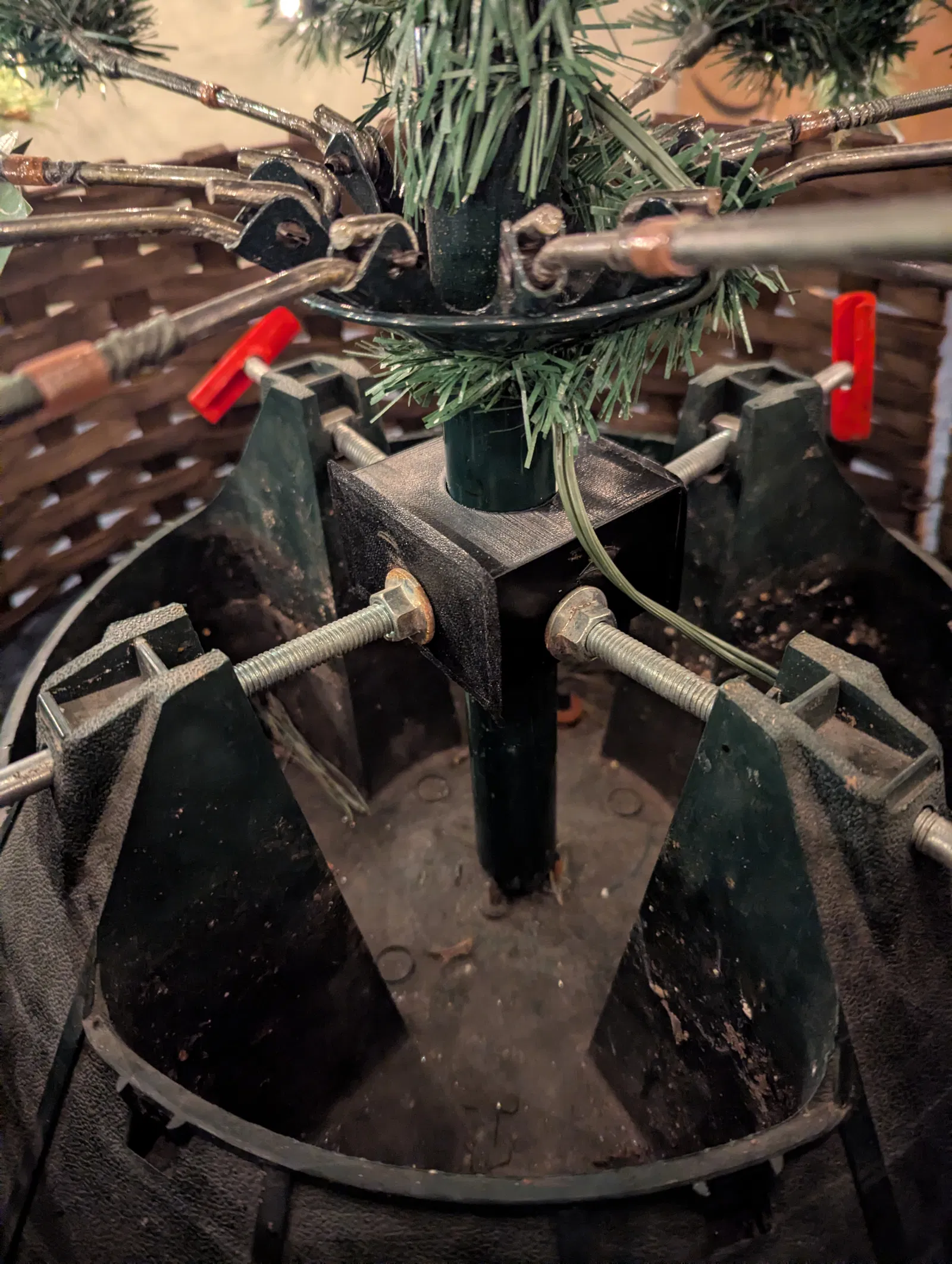 Cái đế sắt mỏng manh đi kèm với cây thông giả nhà tui năm nay bị gãy rồi, mà tui còn dư cái đế chân cho cây thông thiệt hồi mấy năm trước. Mấy con ốc siết trong đó siết sâu vô chạm tới cái trụ chính, nhưng mà cây thông đứng không có vững. Tui chế cái nẹp này để cho nó có nhiều diện tích tiếp xúc hơn. Giờ thì tui có thể đè cây thông xuống mà nó không có bị đổ nữa!