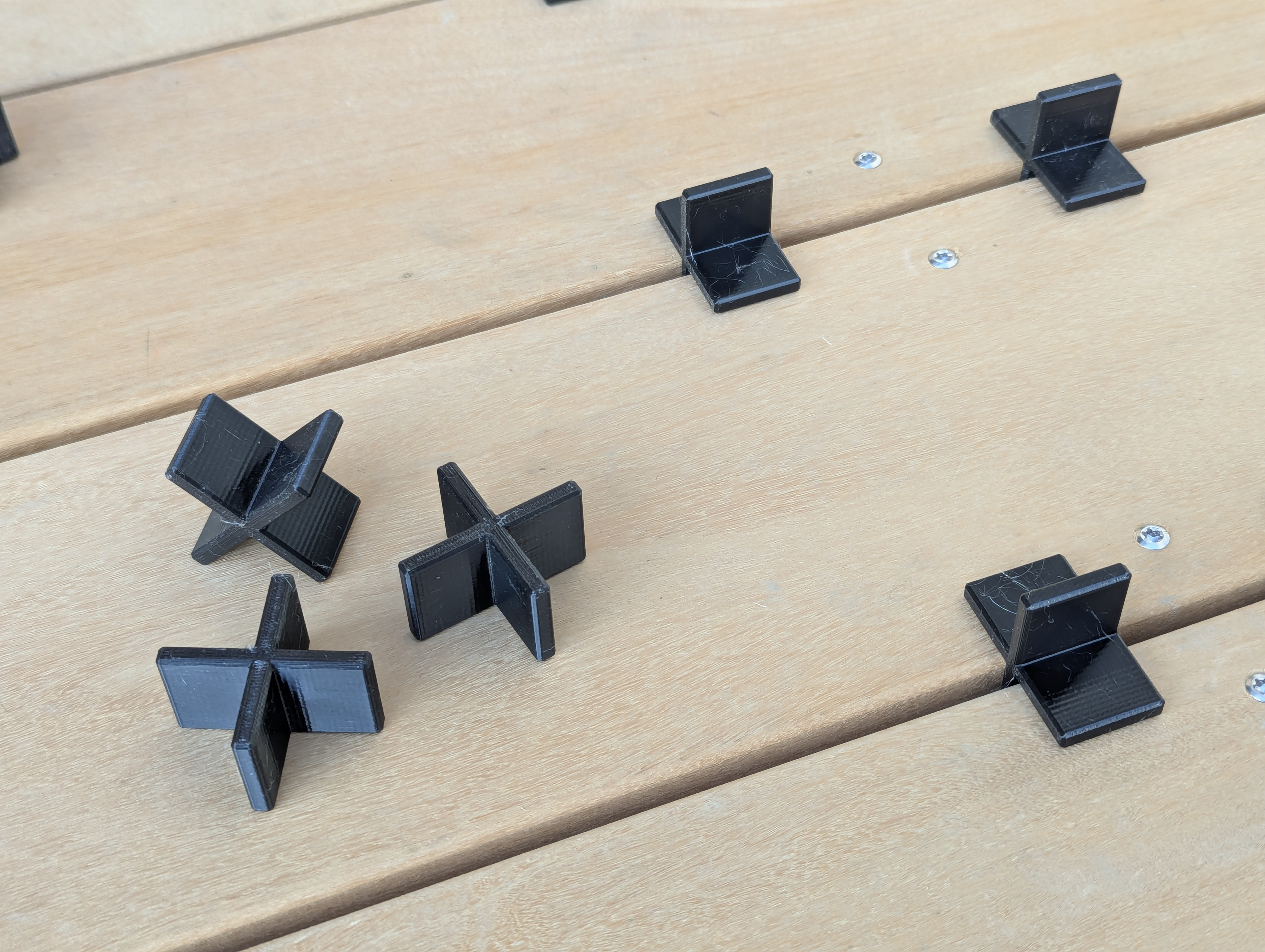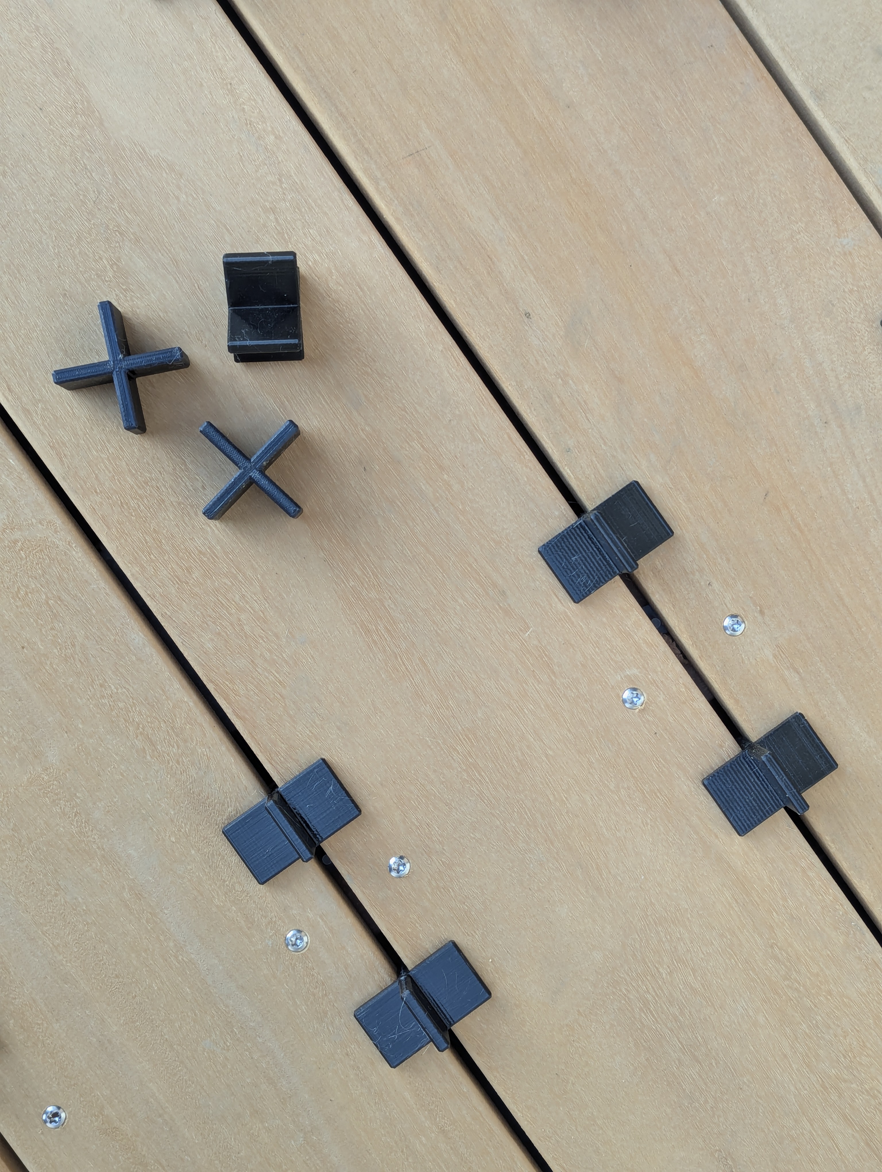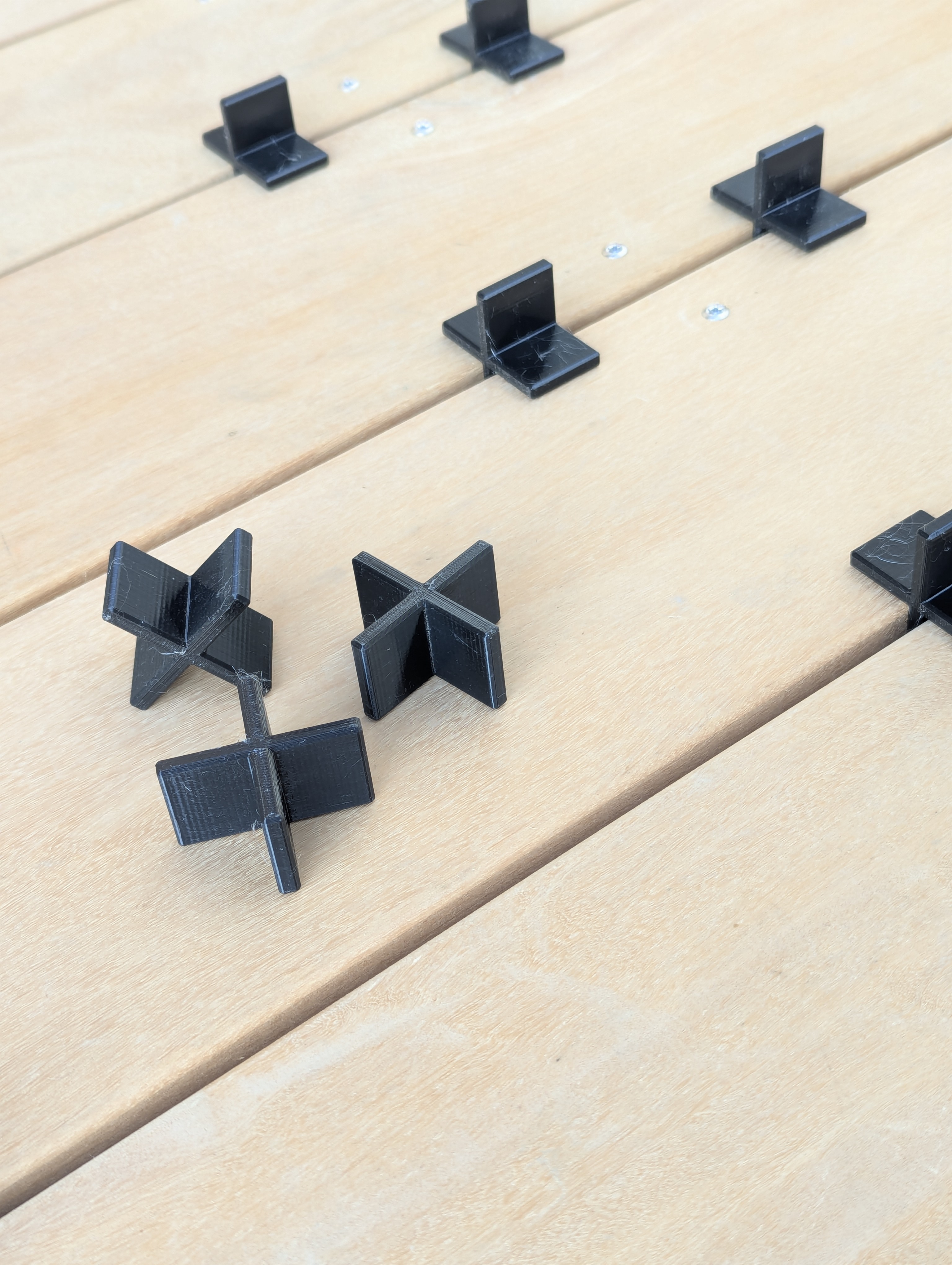 Mô hình này bao gồm các bộ định vị hình chữ thập và hình chữ T được thiết kế để duy trì khoảng cách đồng đều 5mm giữa các ván sàn gỗ trong quá trình lắp đặt. Hình dạng có các cánh dọc vừa vặn giữa các ván để xác định khoảng cách và các mặt bích ngang đặt trên bề mặt trên cùng, ngăn không cho dụng cụ rơi qua khe hở. Các bộ định vị này hoạt động như các hướng dẫn tạm thời để căn chỉnh các ván trước khi kẹp và bắt vít chúng vào vị trí.