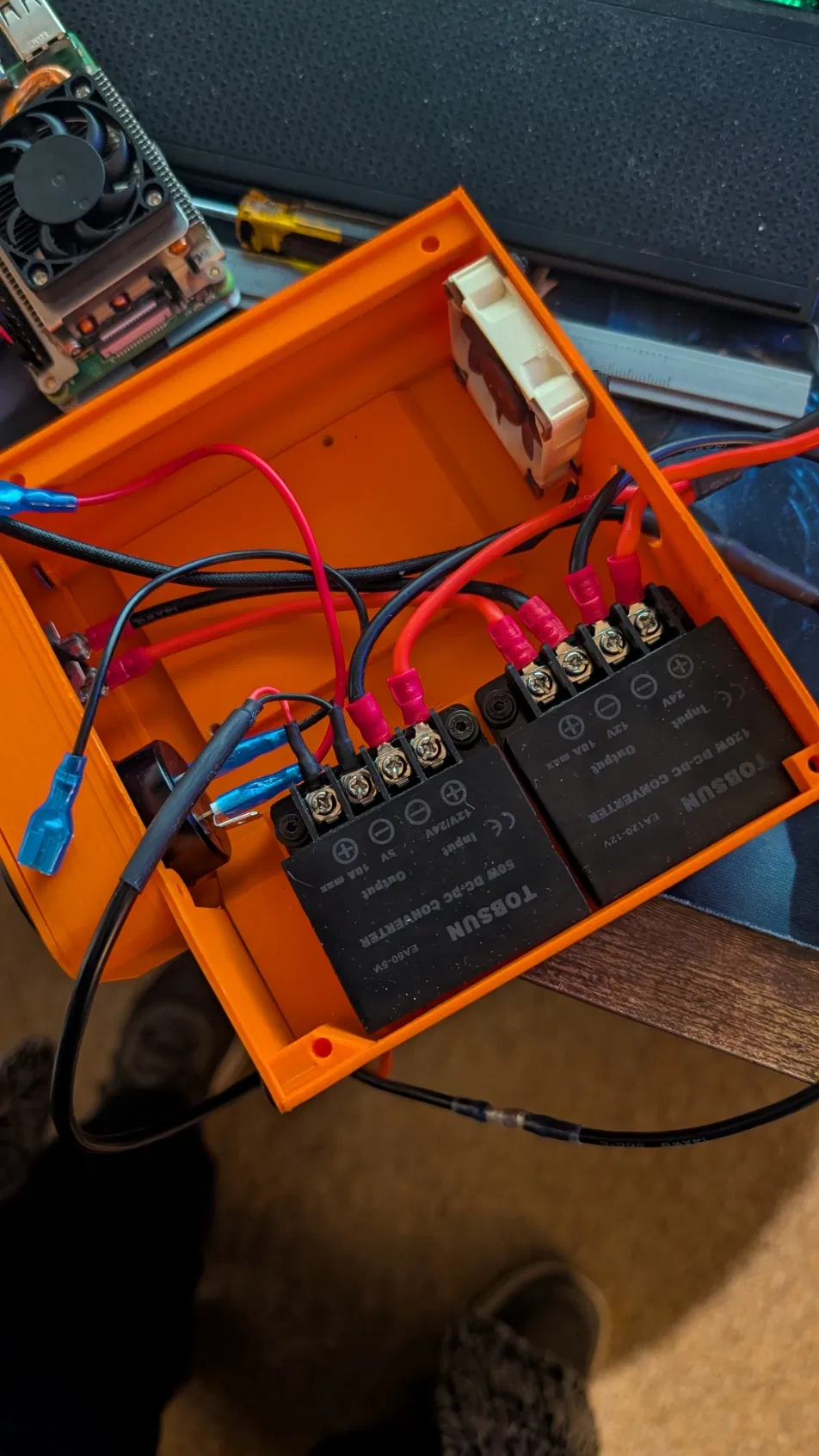 Bộ chuyển đổi thứ hai giảm 24 V hoặc 12 V xuống 5 V cho Raspberry Pi. Quạt có thể được cấp nguồn qua Pi hoặc đấu dây trực tiếp vào bộ chuyển đổi buck 5 V, tùy thuộc vào thiết lập bạn thích.