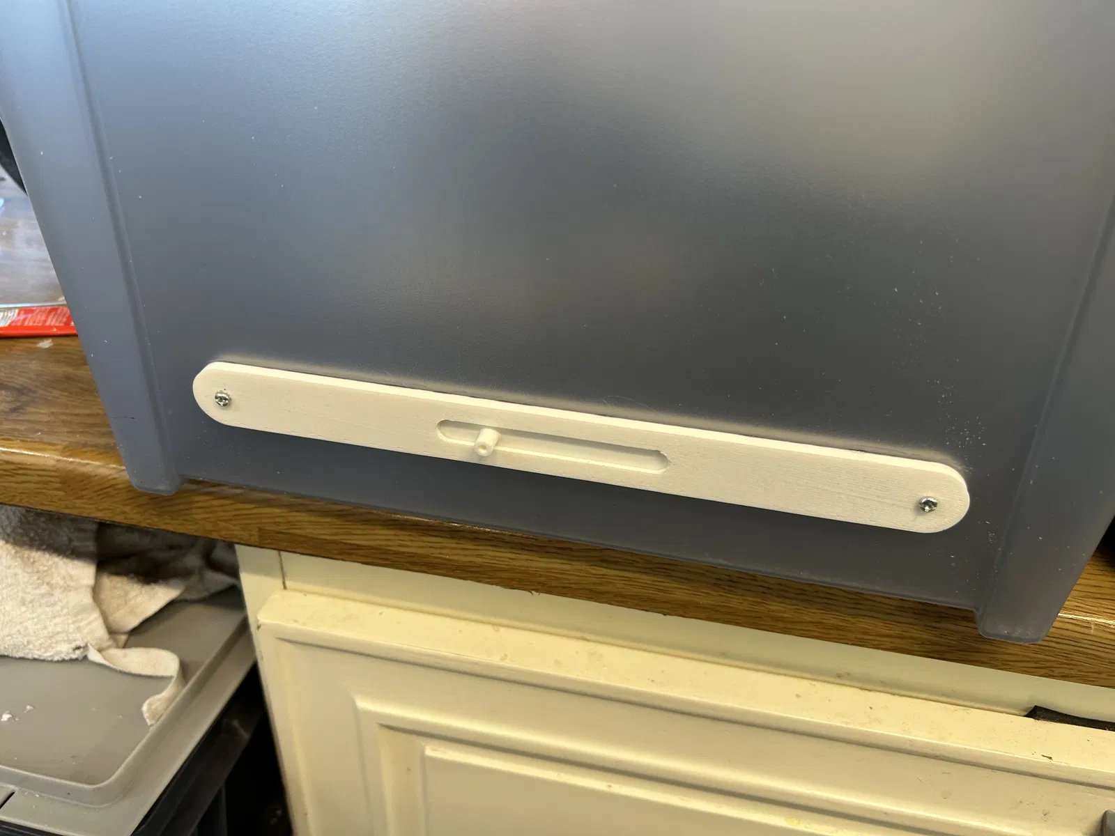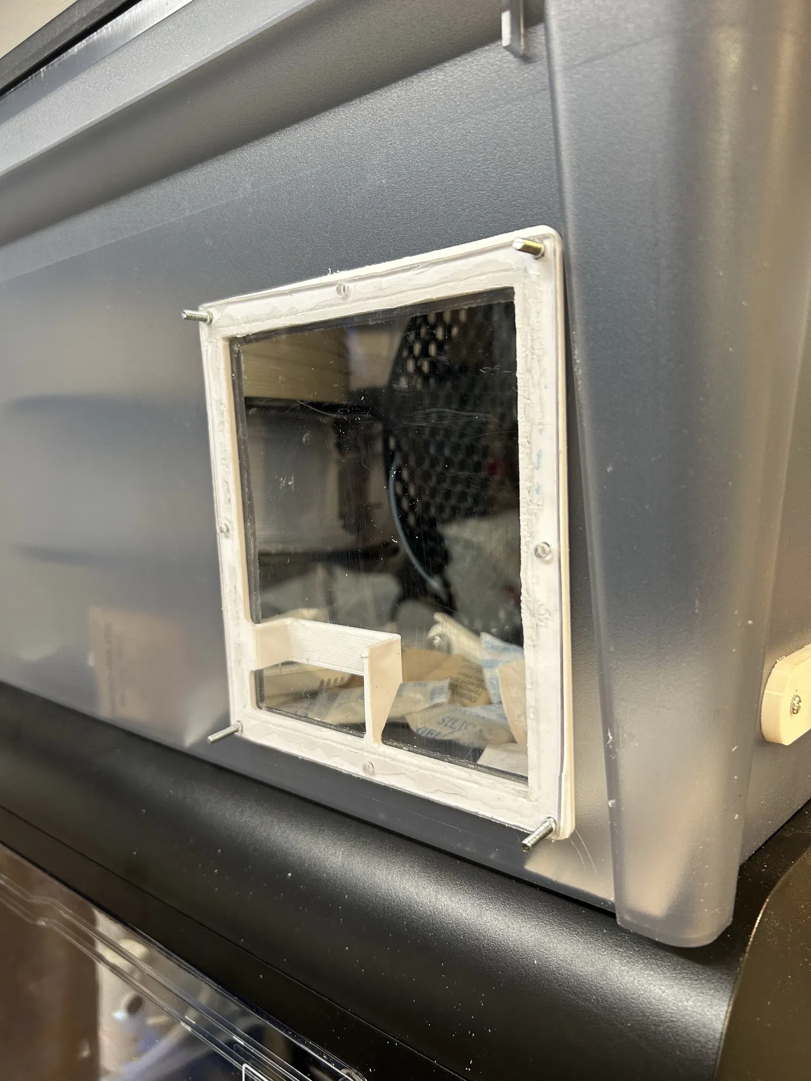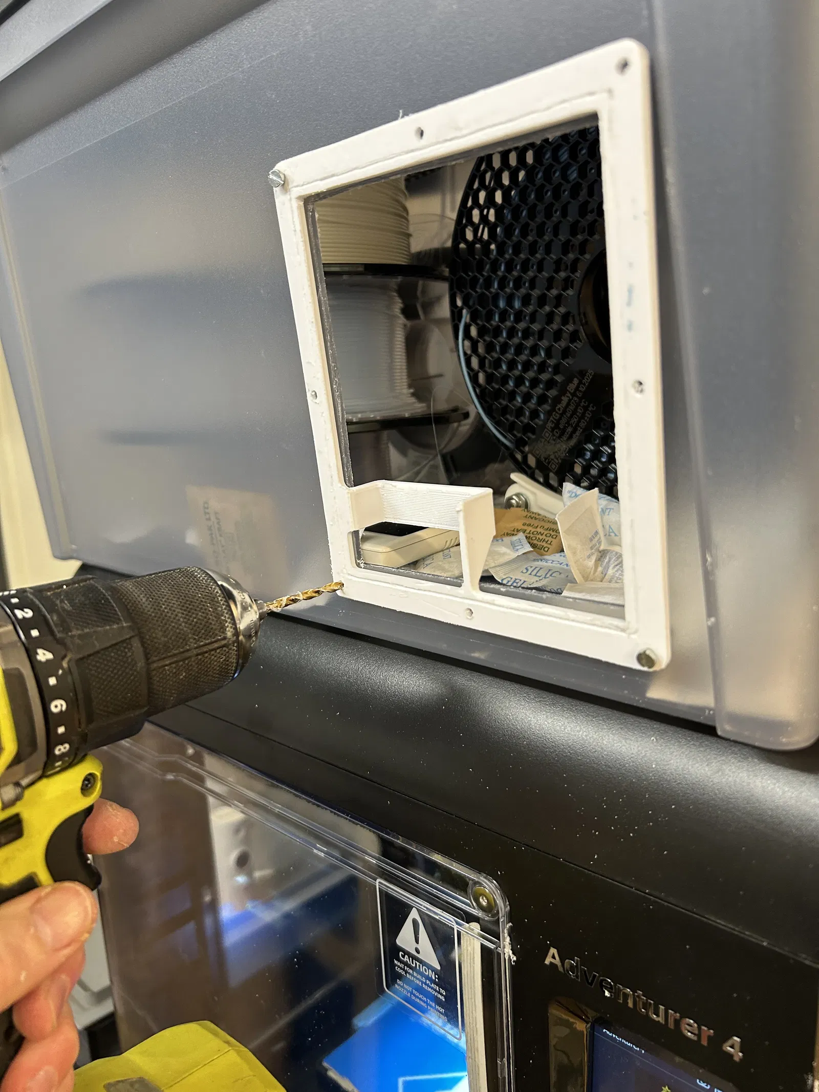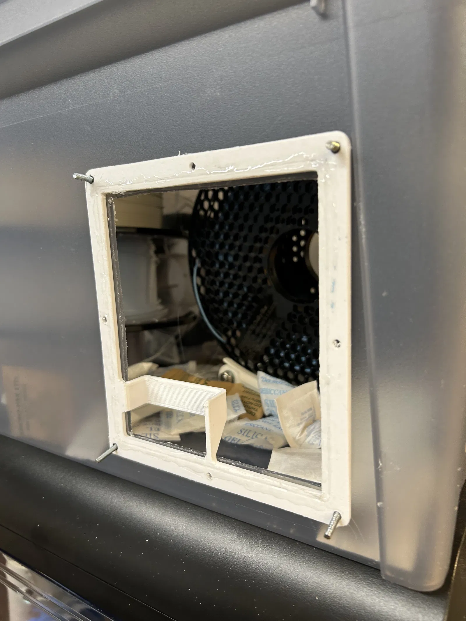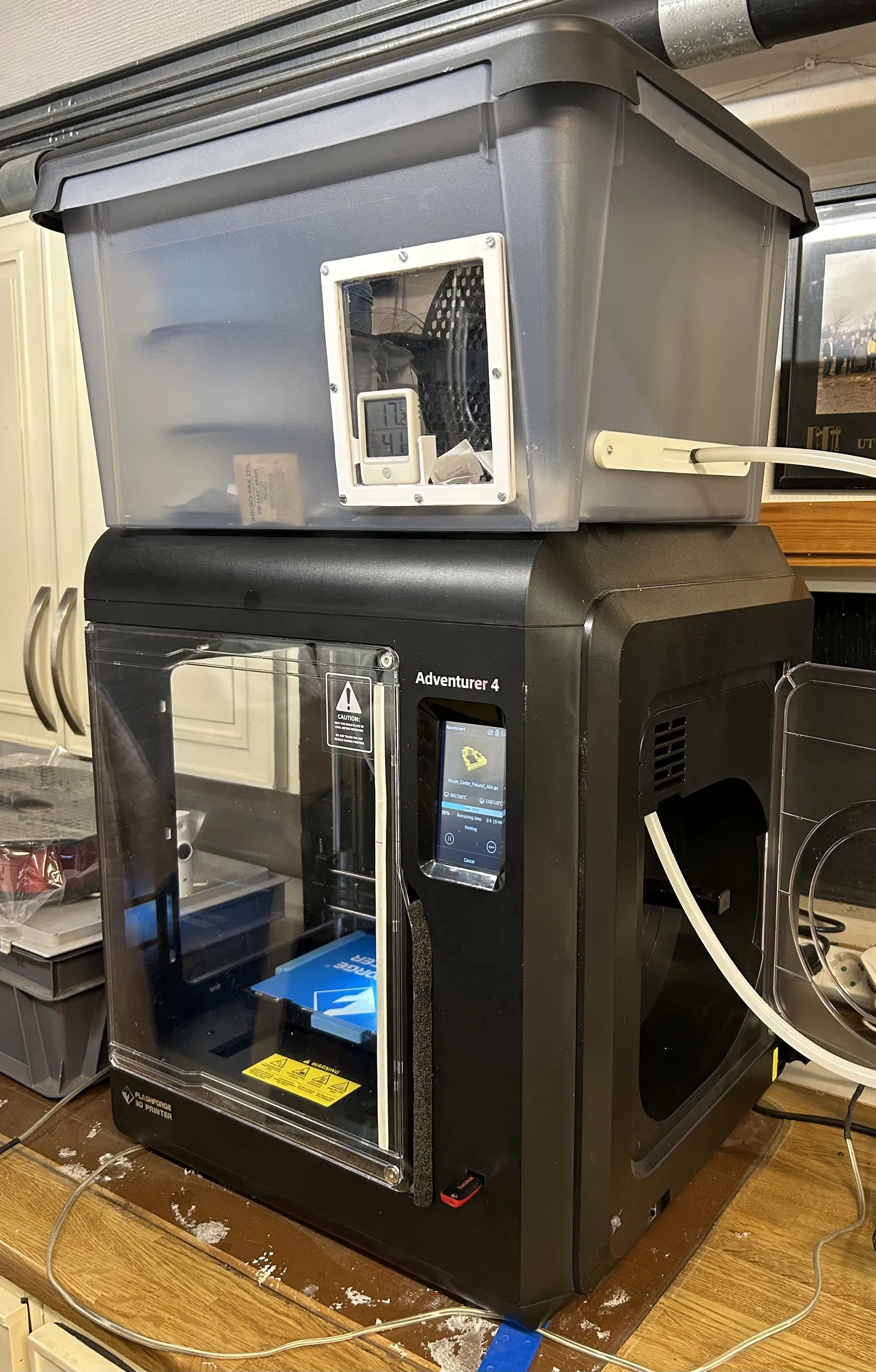 Hộp này được mua từ Clas Ohlson ở Thụy Điển, có tên là “Förvaringsbox SmartStore Dry”. Đường dẫn dây tóc đến máy in được làm từ 3 bộ phận in 3D bằng PLA. Sau đó được dán và bắt vít bằng ốc M3 vào hộp. Đường dẫn được kết nối với bộ phận nạp dây tóc của máy in bằng một ống nhựa cứng (OD 10 mm x ID 6 mm) mà tôi có sẵn trong gara, có lẽ từ một máy rửa chén cũ hoặc tương tự.
