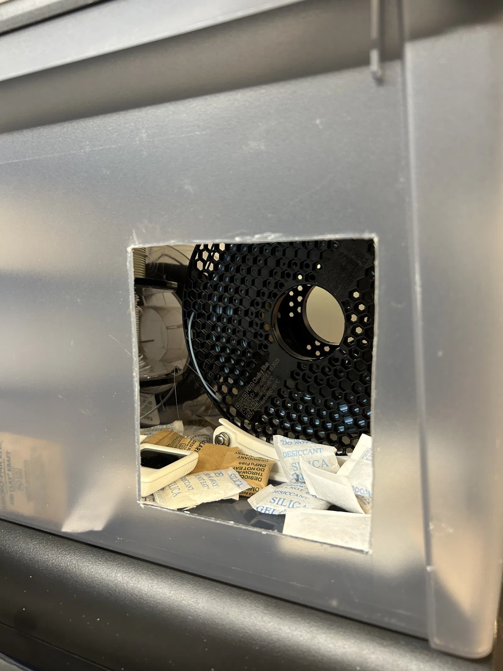 Hộp chống ẩm có bộ nạp dây tóc cho dây tóc hút ẩm như PC, TPU, ASA, v.v. Bao gồm bộ nạp dây tóc, với đường dẫn đến máy in và cửa sổ để quan sát trạng thái dây tóc và mức độ ẩm. Hộp được lấp đầy bằng các gói hút ẩm Silica Gel mà tôi đã thu thập từ dây tóc đã mua và từ những thứ khác mà gia đình đã mua (càng nhiều gói càng tốt). Mức độ ẩm thường nằm trong khoảng 20-30% trong hộp chống ẩm. Nhưng các gói hút ẩm Silica Gel cần được làm khô, ví dụ trong lò nướng ở 80 độ C, sau mỗi 2-3 tháng. Kể từ khi tôi lắp đặt hộp chống ẩm này, nó đã hoạt động rất tốt cho tôi để in với các loại dây tóc hút ẩm này.