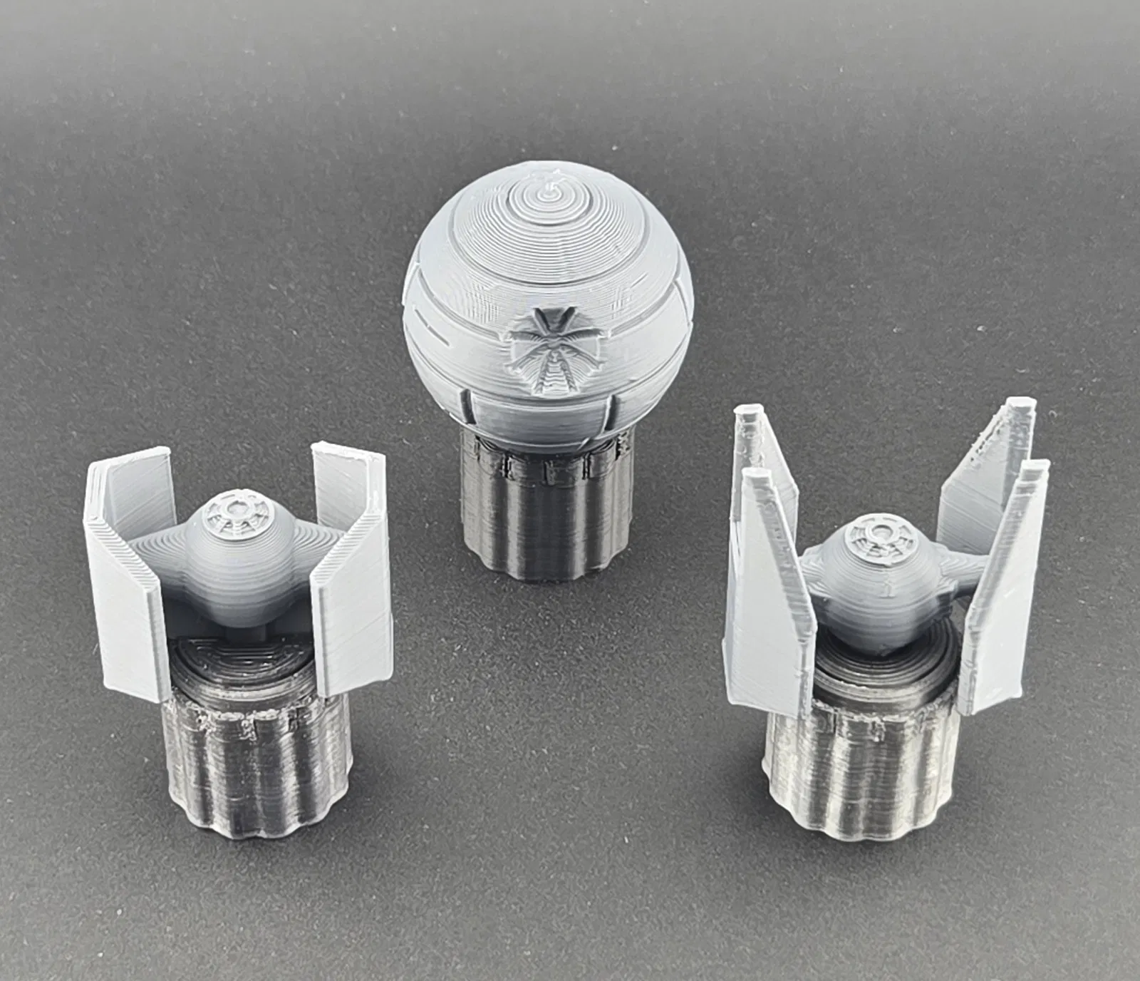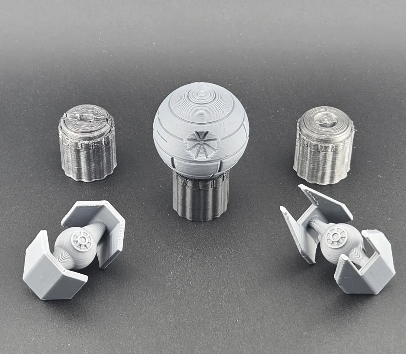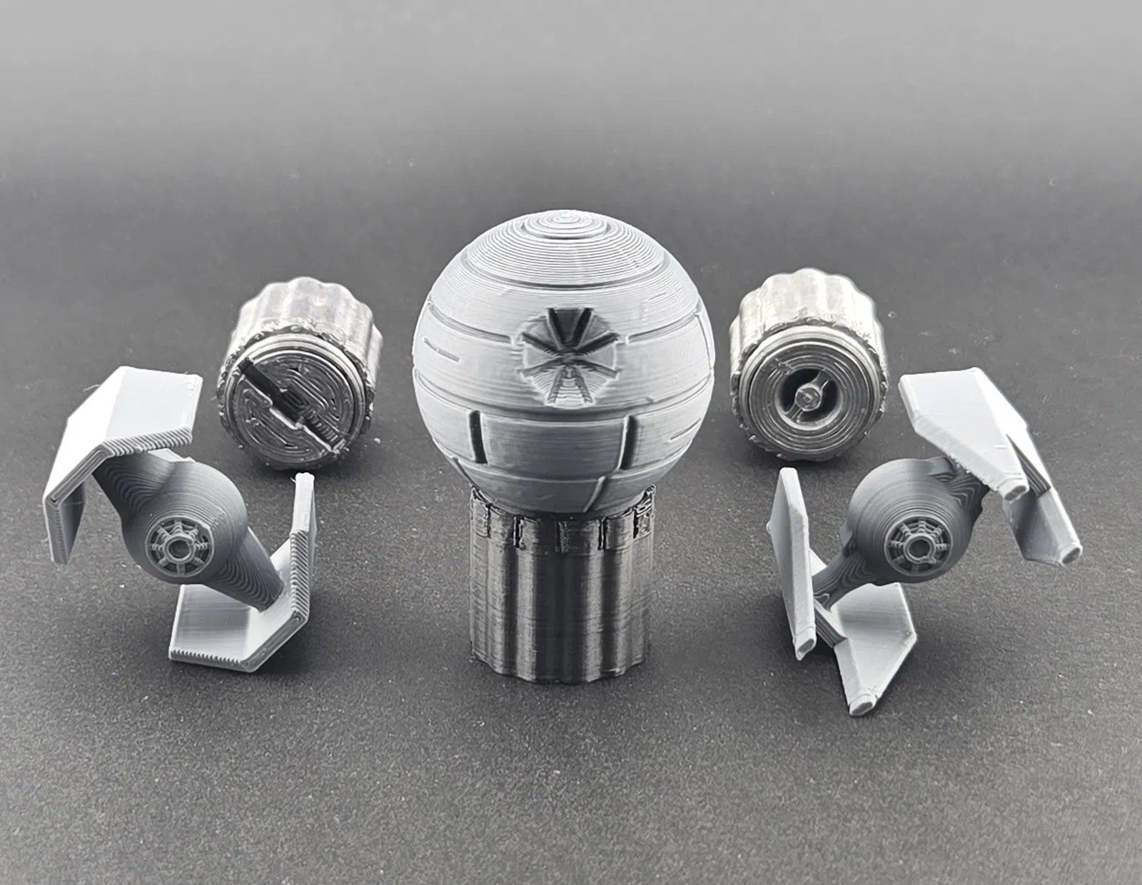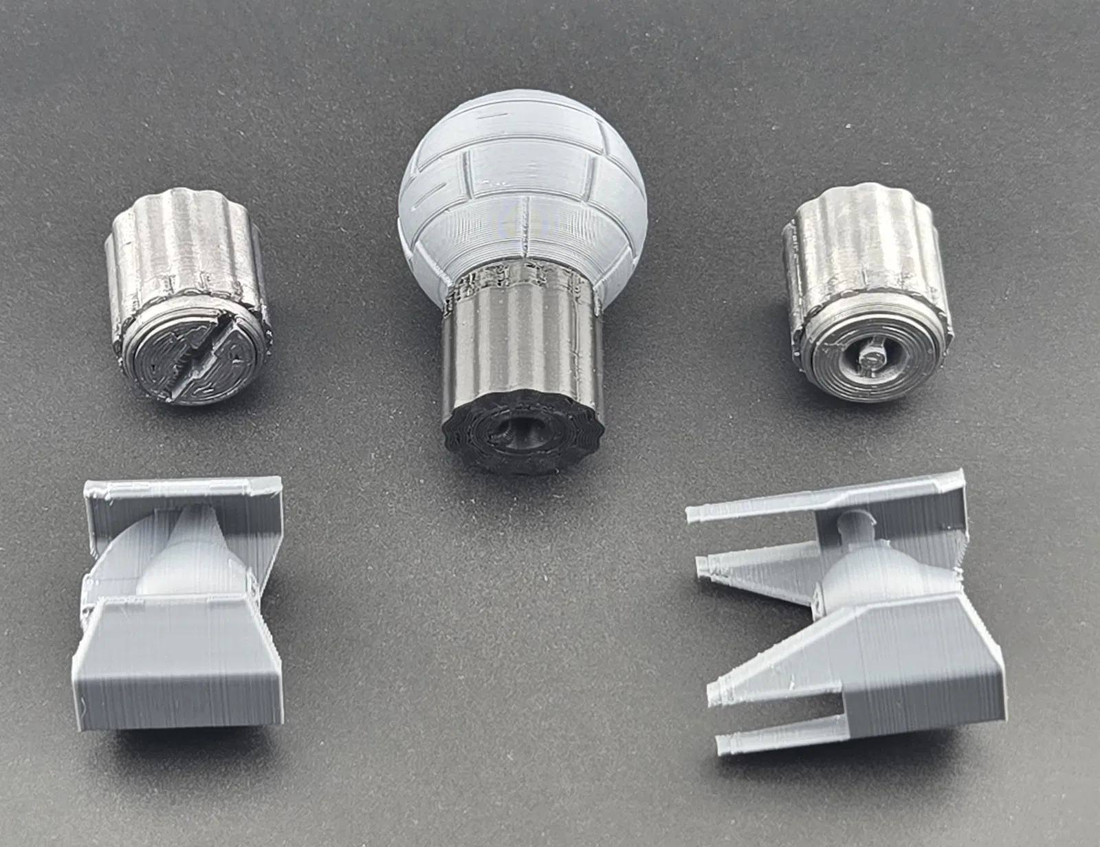 Núm vặn Death Star nhiều mảnh có ba phần, bao gồm một chốt hình chữ nhật được in với mặt dài hướng về bàn in để có độ bền tốt nhất. Nếu chốt quá lỏng hoặc quá chặt, bạn có thể điều chỉnh kích thước cho phù hợp.