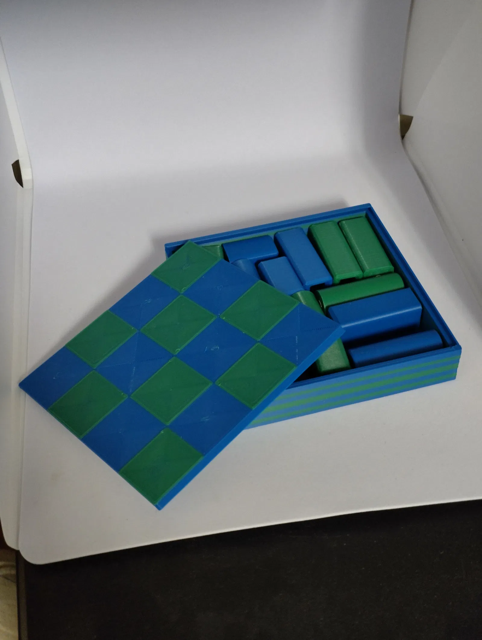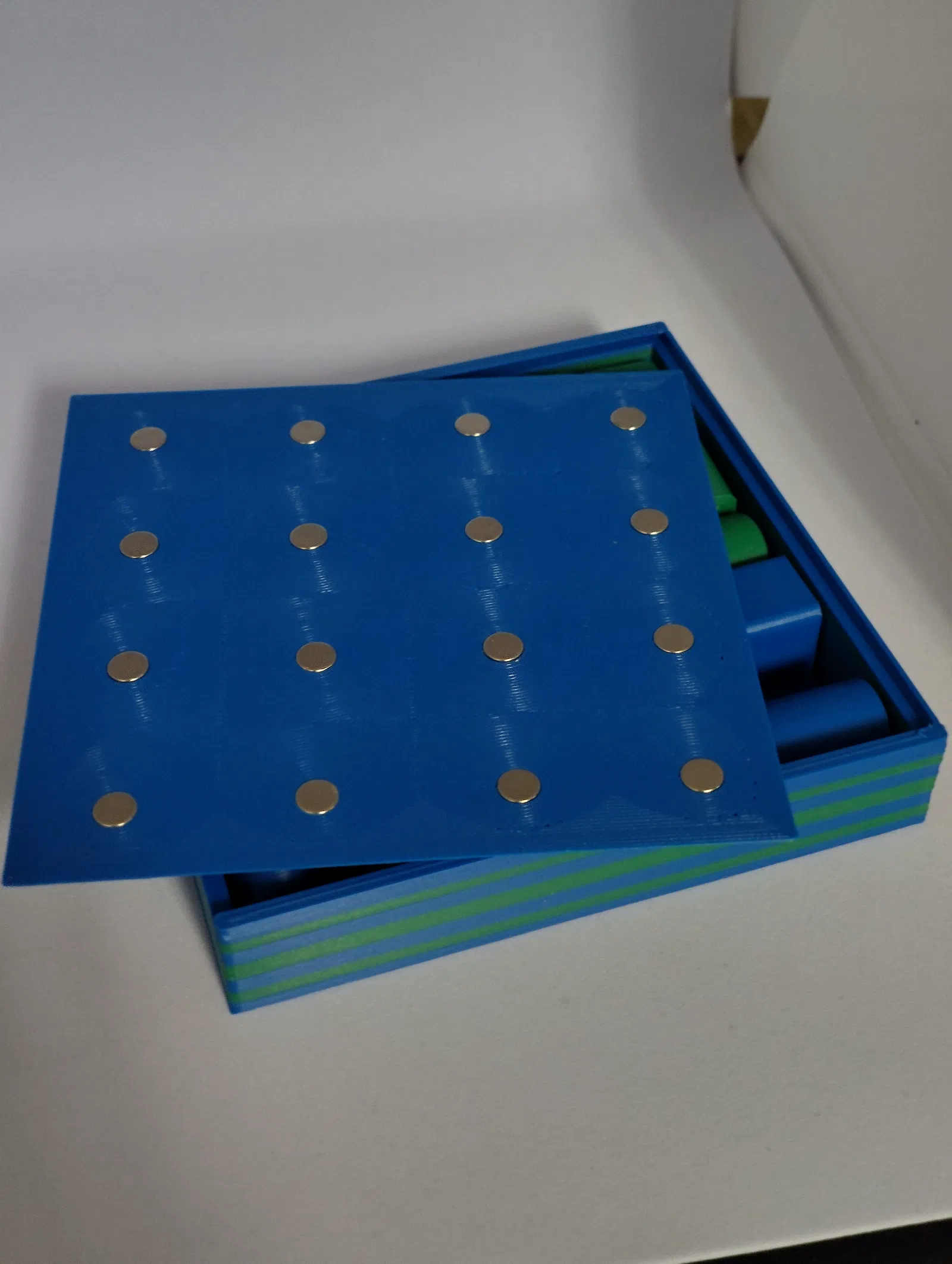 Cái này là cái hộp để giữ các quân cờ gọn gàng và cũng có thể dùng làm bàn chơi luôn. Có lỗ để nhét nam châm, kích thước ban đầu là nam châm 6x2mm, nhưng có file source bằng FreeCAD để bạn tùy chỉnh qua kích thước khác.
