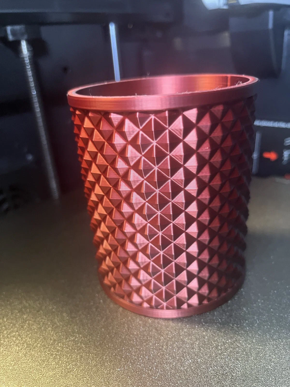 Mô hình trưng bày bằng nhựa Magic PLA. Ly có kích thước tiêu chuẩn 95mm cao, 80mm đường kính, bề mặt có vân và hiệu ứng đổi màu độc đáo. Kèm theo mô hình tham số OpenSCAD.