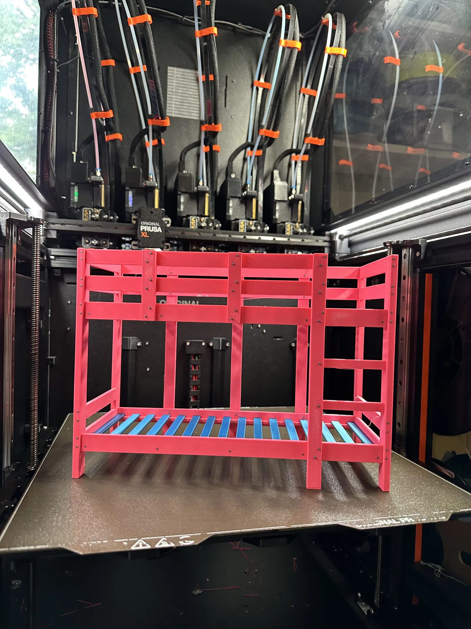 Sau khi giao chiếc giường tỉ lệ 1/3, tôi được khách hàng (cháu gái) thông báo rằng Barbie cũng cần một chiếc giường. Tệp 3mf này đã được in nghiêng. Lưu ý nếu in nghiêng, bạn phải chìm nó xuống mặt bàn in, nếu không các "ốc vít" lồi ra sẽ khiến mô hình bị nổi lên trên các bộ phận hỗ trợ.