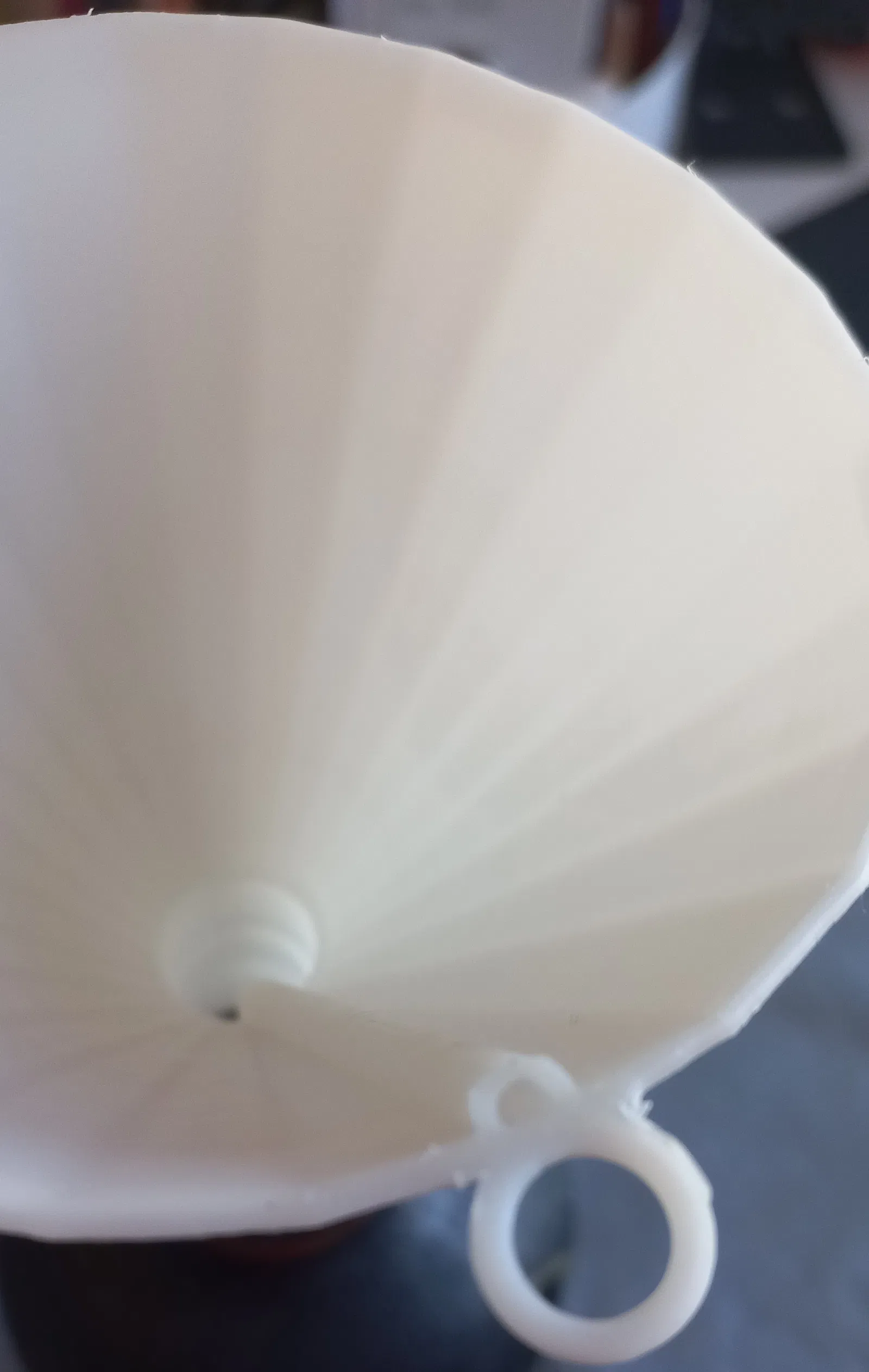 Thiết kế này được tạo ra để giải quyết một nhu cầu trong gia đình. Khi rót nước vào chai, không khí trong chai đã ảnh hưởng đến dòng chảy của chất lỏng bị đổ. Điều này khiến phễu bị tắc nghẽn. Mô hình tôi đã phát triển này ngăn chặn sự tích tụ chất lỏng bằng cách cho phép không khí thoát ra khỏi chai qua một kênh riêng biệt trong quá trình sử dụng. Một giải pháp để dễ dàng rót đầy.