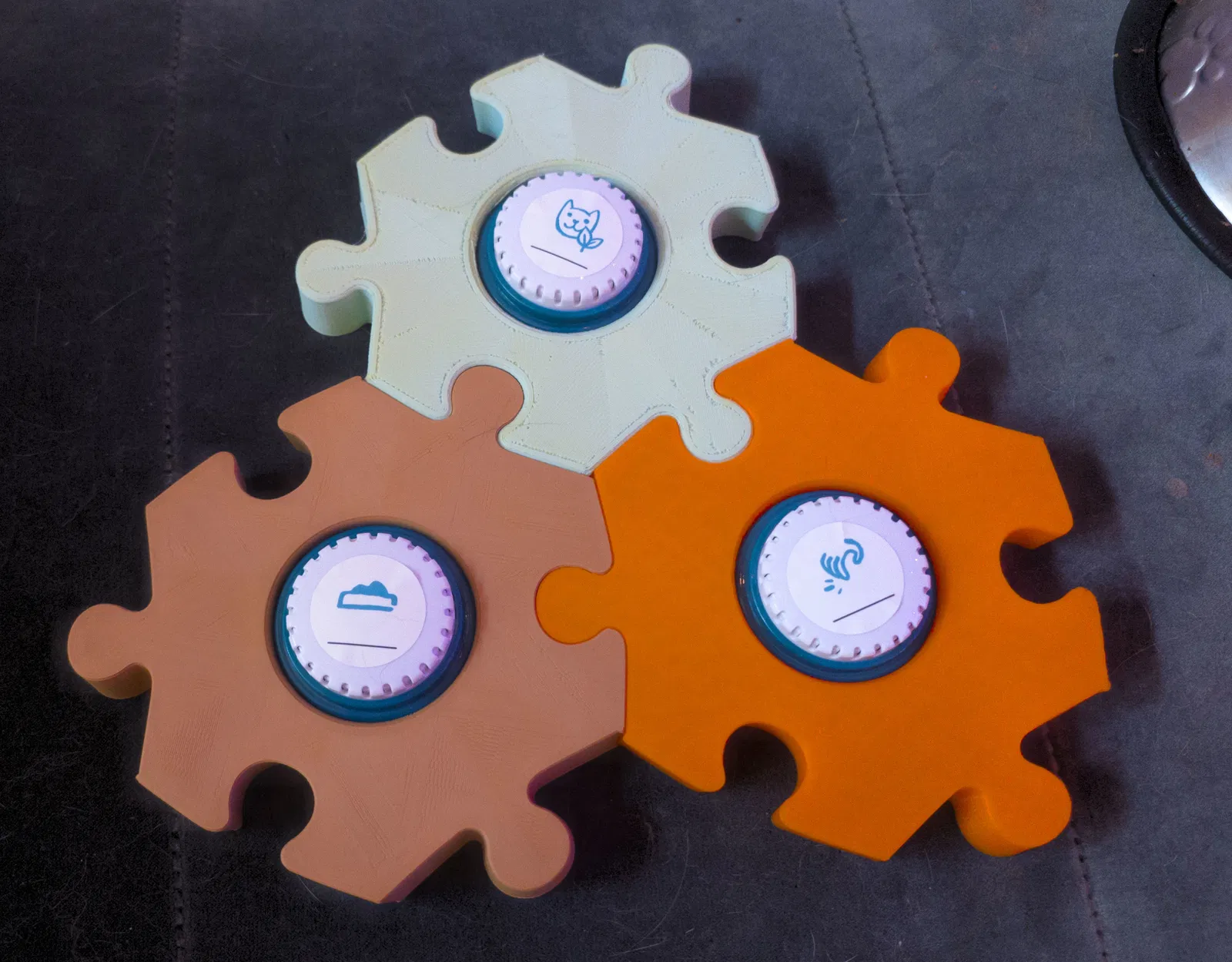 FluentPet bán các nút bấm để thú cưng giao tiếp với con người. Đây là một sự thay thế cho các tấm mút họ bán. Chúng được thiết kế để khóa chặt với nhau theo cách cho phép nhấc cả nhóm lên và di chuyển mà không bị bung ra. Nút bấm cũng vừa khít vào lỗ đủ chặt để không bị rơi ra dễ dàng. Tôi đã in từng cái với màu sắc khác nhau như một cách bổ sung để thú cưng phân biệt nó với các nút khác.