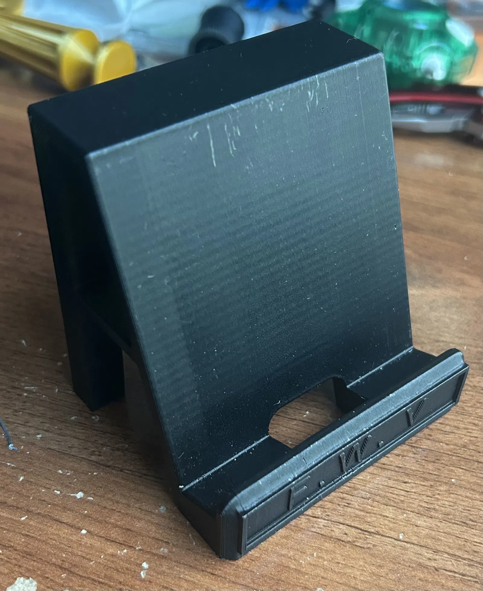 Một cái giá đỡ điện thoại để giữ điện thoại của bạn ở góc 110 độ. Có thể giữ hầu hết các kích cỡ điện thoại, được thiết kế với iPhone 13 làm chuẩn. Có lỗ ở dưới để cắm sạc cáp.