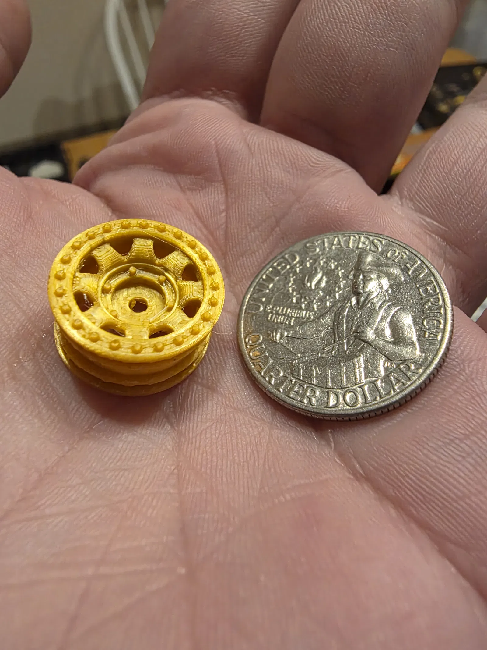 Sau khi không thấy có bánh răng kẹp (beadlock) nào hoạt động tốt cho SCX30, tôi quyết định tự làm. Bánh xe này sẽ phù hợp với lốp có kích thước tiêu chuẩn (18mm), và cho phép bạn giữ lốp vào vành mà không cần dán. Nếu bạn chưa quen với cách hoạt động của bánh răng kẹp trên xe RC cỡ nhỏ, tôi khuyên bạn nên xem hướng dẫn cho các bánh răng kẹp tương tự cho SCX24. Tôi cũng đã bao gồm một phiên bản bánh xe thông thường, chỉ cần nhét là vừa, cho lốp dự phòng của bạn, để không làm tăng thêm trọng lượng quá nhiều. Bánh xe này không có phần khoét để chạy như bánh xe thông thường vì độ lệch (offset) đã được cố định để không bị lồi ra ngoài quá nhiều so với thân xe, nhưng chủ yếu nó được thiết kế để hoạt động với các thân xe của tôi.
