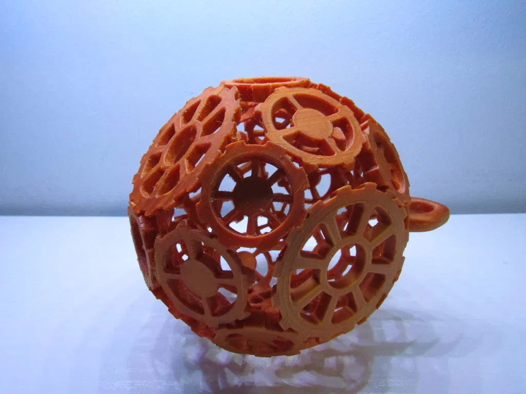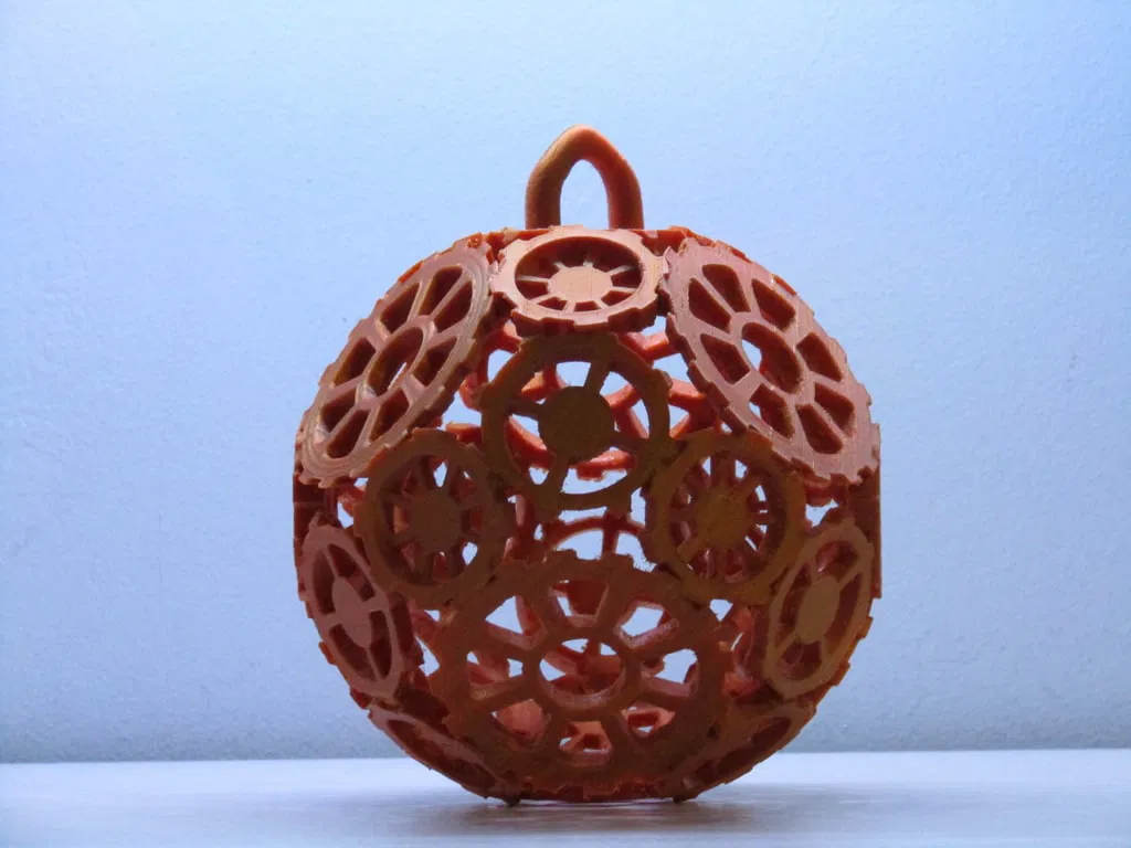 Một món đồ trang trí Giáng sinh làm từ bánh răng! Cái này nên được in thành hai nửa hình cầu, sau đó bạn dán chúng lại với nhau. Bạn có thể chọn có móc treo, hoặc đơn giản là in "Half_no_hook" hai lần để làm một quả cầu.