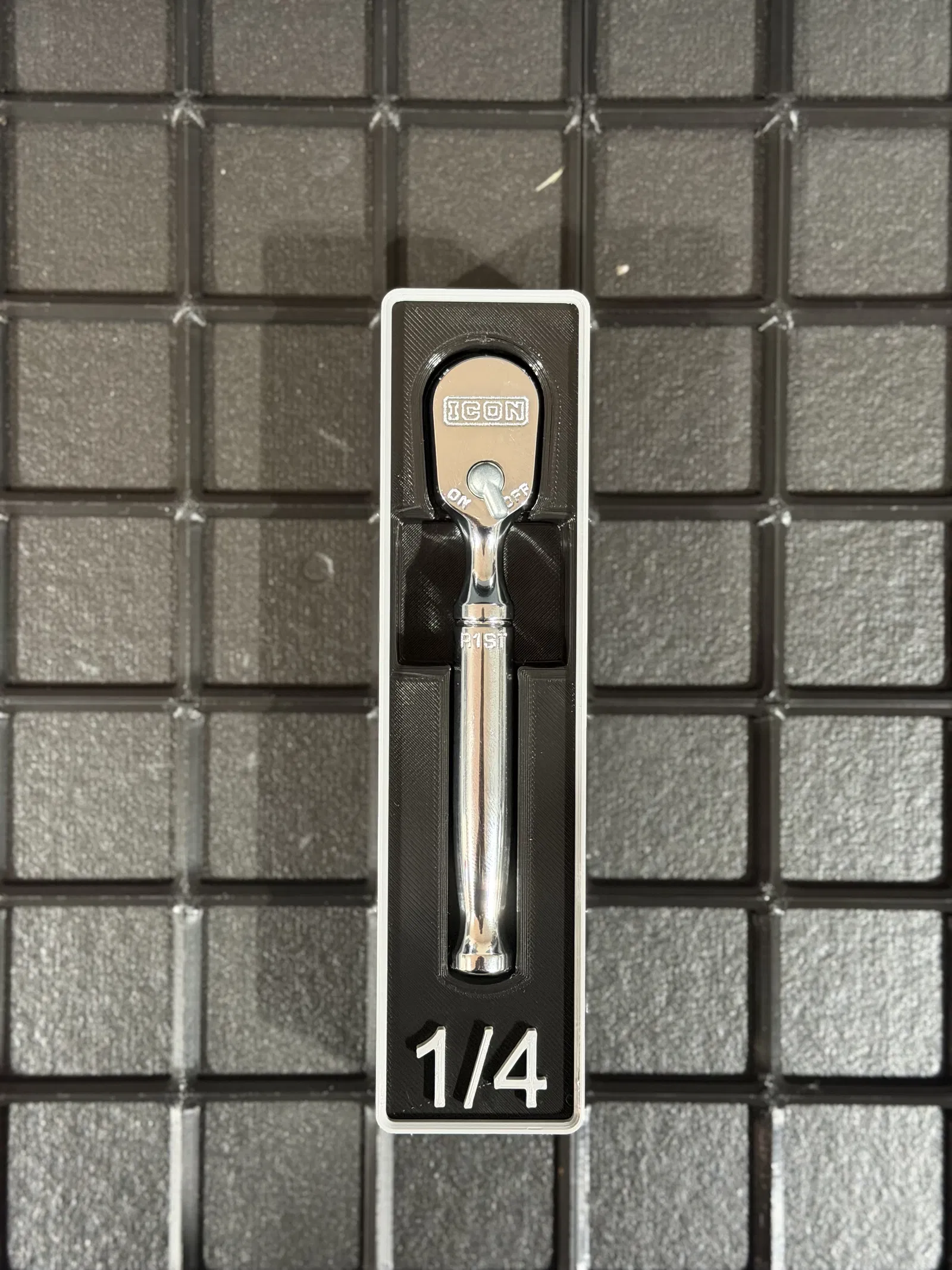 Cùng cảnh ngộ. Cái hộp Gridfinity tùy chỉnh này được thiết kế đặc biệt để chứa cây cà lê đóng ICON 1/4", mang đến cho nó một nơi ở vừa vặn, ổn định bên trong bất kỳ hộc tủ dụng cụ theo chuẩn gridfinity nào.