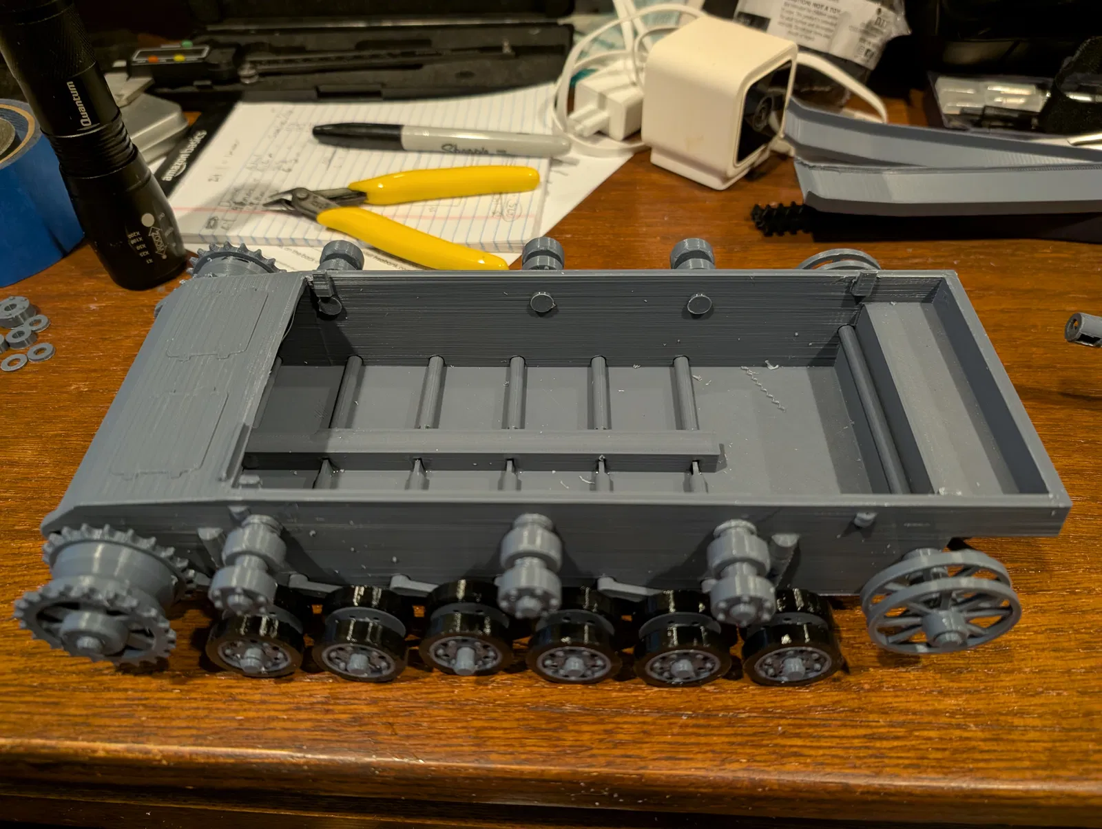 Gắn các trục bánh xe bên trái và bên phải, dán phần tab vào khe ở mặt trong Thân dưới. Tui đặt thân tàu lên mấy cái trục và để trọng lượng giữ cho trục ở cùng một góc vì chúng có thể di chuyển một chút. Quan trọng là phải đảm bảo nó nằm ngang nha. Tổng cộng 12 cái. Đối với các bước dưới đây, tốt nhất là thử lắp tất cả mọi thứ trước khi dán chốt bánh xe. Nên có khoảng hở 4 mm ở tất cả các cụm bánh xe để lắp xích và thẳng hàng với bánh răng dẫn động. Tui cẩn thận dán các cụm bánh xe lại với nhau trừ các miếng đệm bên trong và để chúng ổn định trên một trục dự phòng. Sau đó mới đặt vào vị trí thực tế sau khi đã khô hoàn toàn.